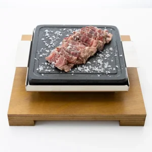 Piedra para carne a la piedra 20×20 3cm + soporte inox + base madera