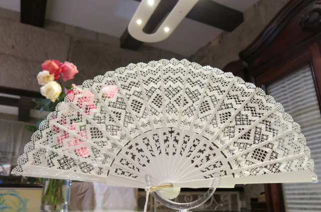 Abanico de encaje de bolillos hecho a mano, varillaje español de madera tropical lacado.