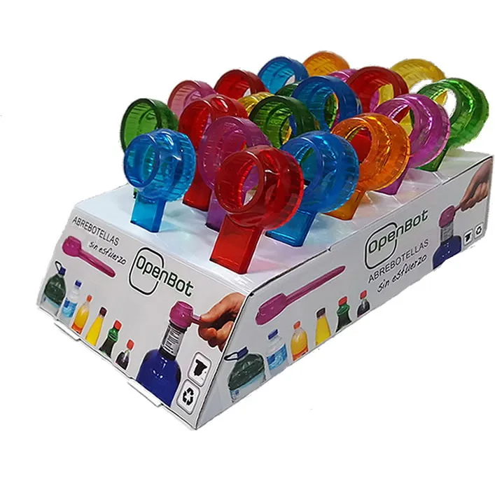 El Abrebotellas OpenBot está diseñado con doble cavidad, lo que permite adaptarse al diferente diámetro de las botellas con tapones de plástico. Abriendo fácilmente y sin esfuerzo tanto garrafas de agua de 5 litros, como pequeñas botellas de 33 cc. También permite la apertura de tapones de botellas de refresco de 2 litros, 1,5 litros o 1 litro.