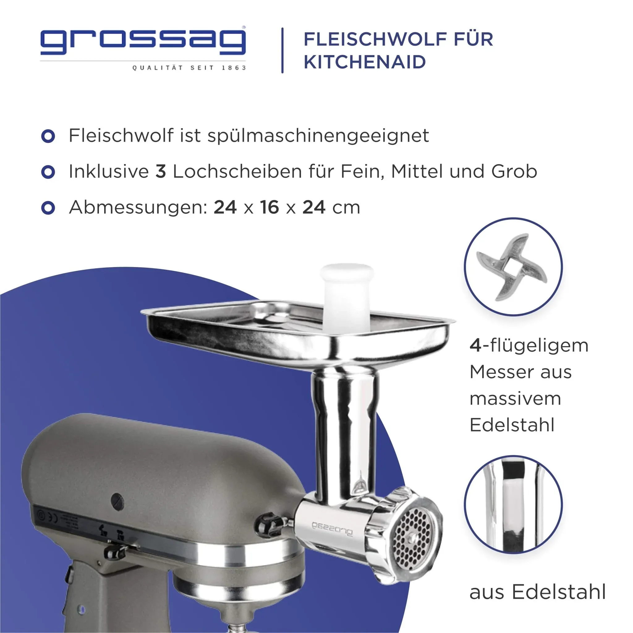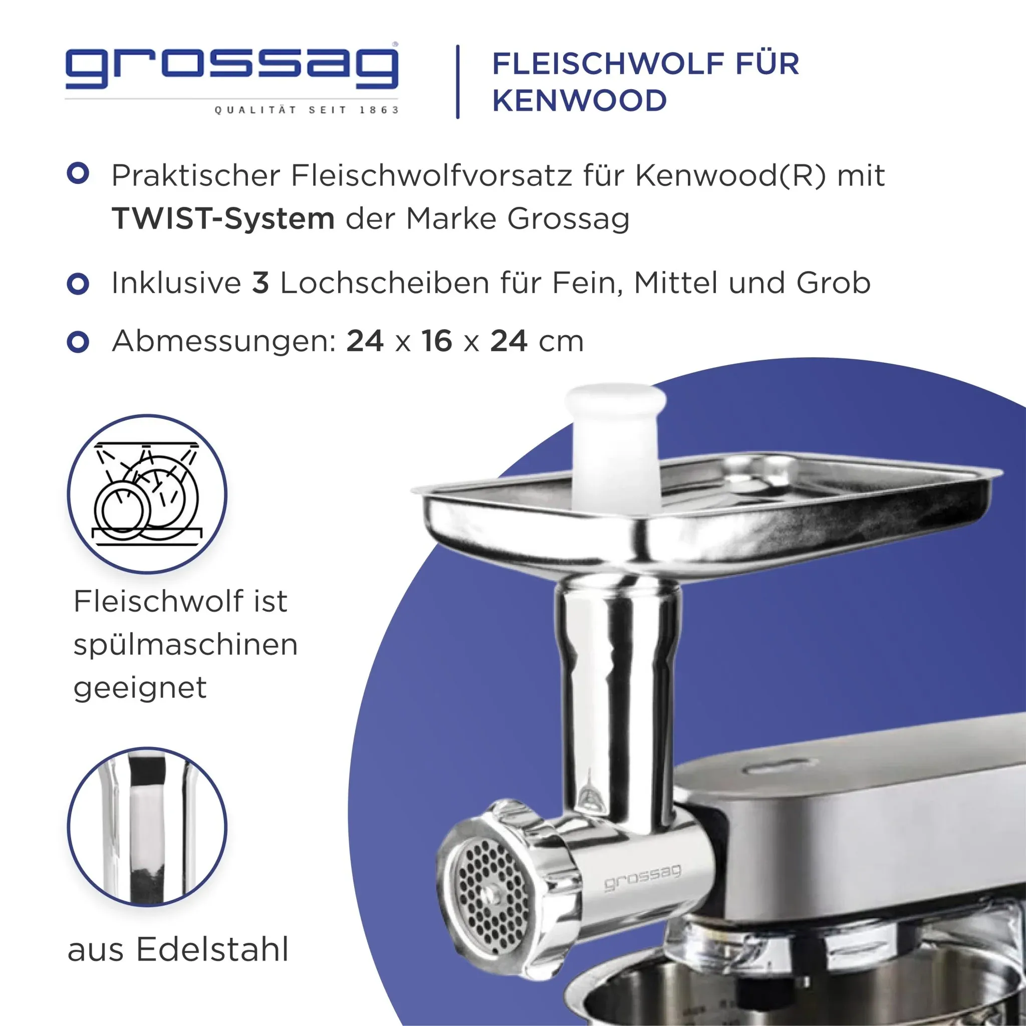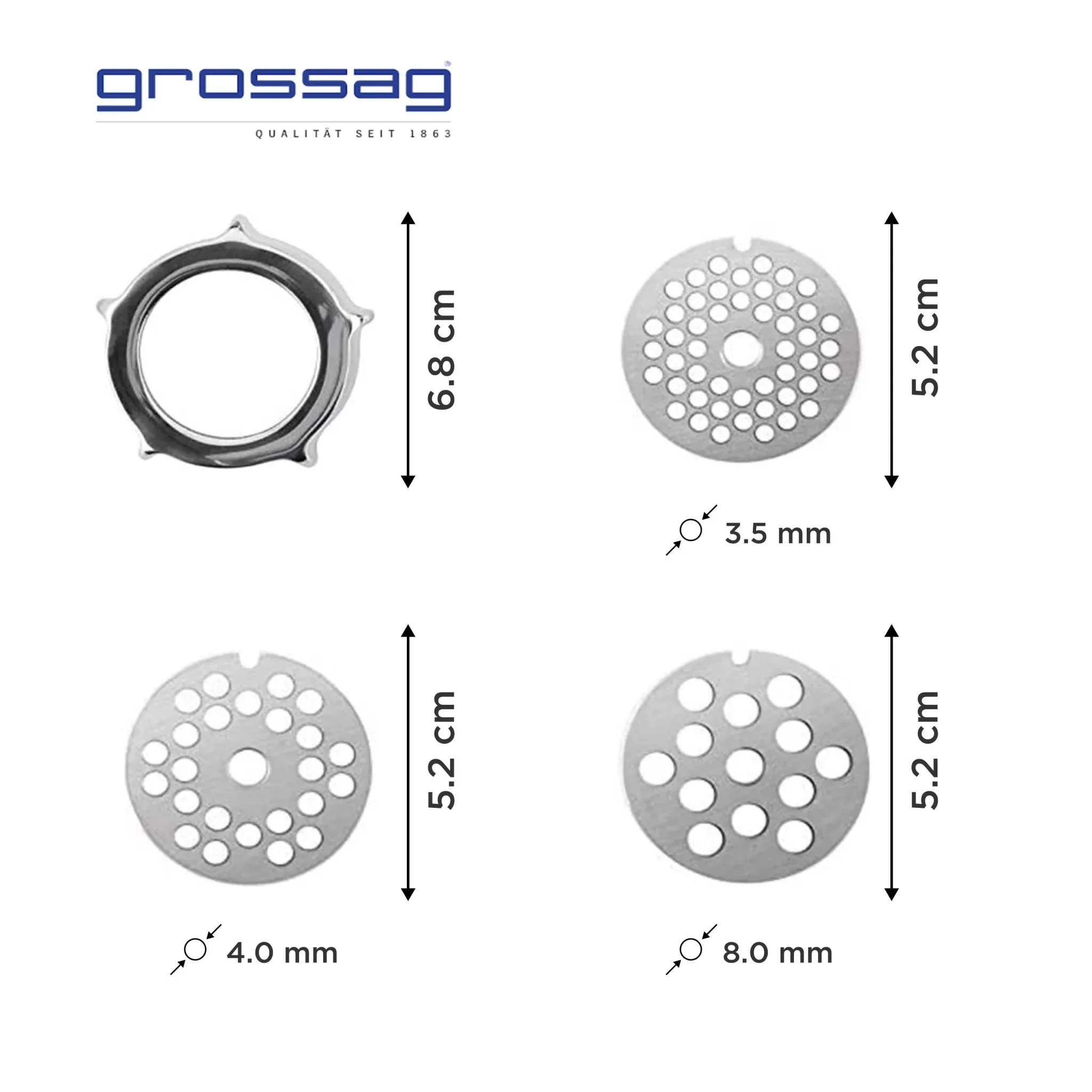 • Incluye 3 discos perforados de acero inoxidable (fino 3 mm, medio 4,5 mm, grueso 8 mm)