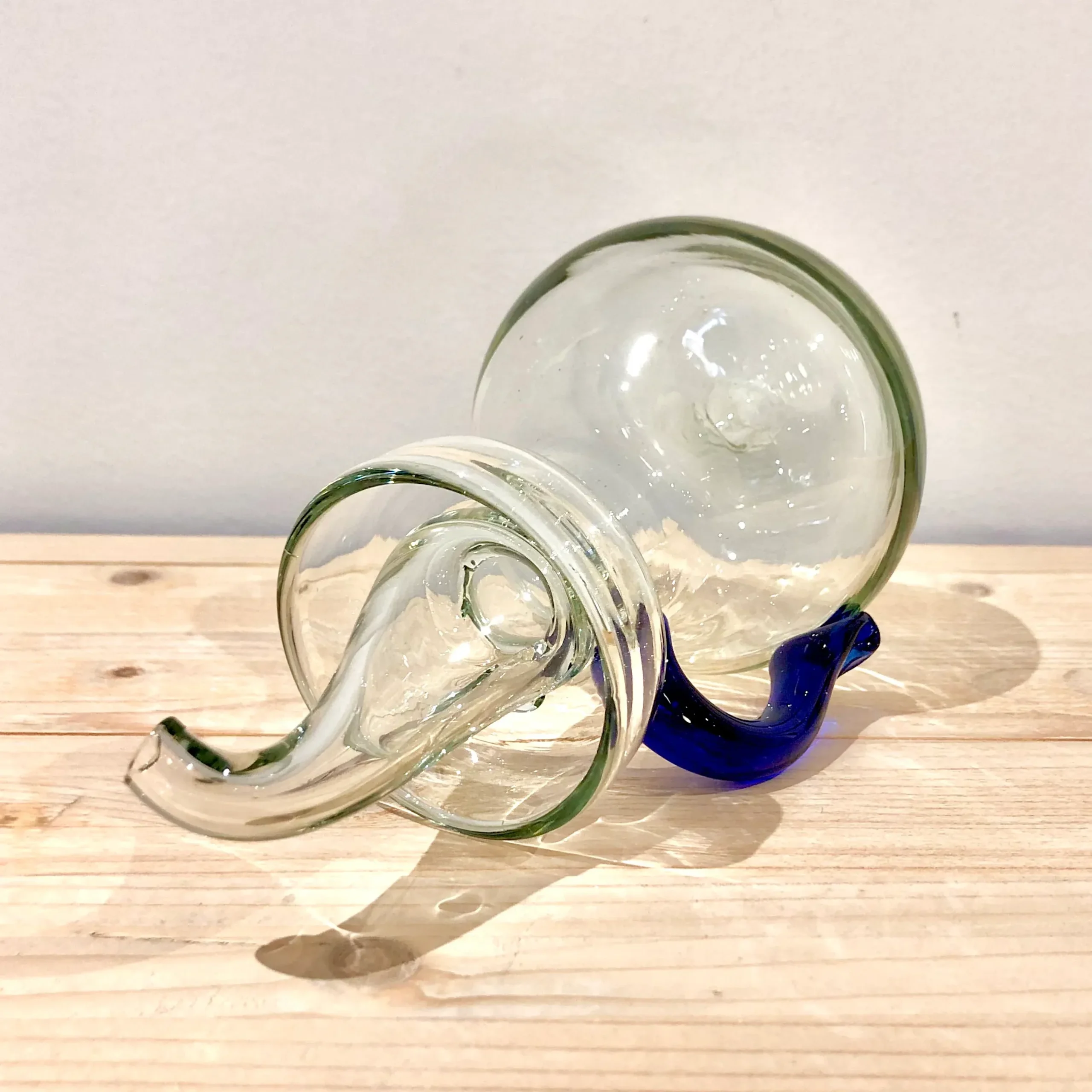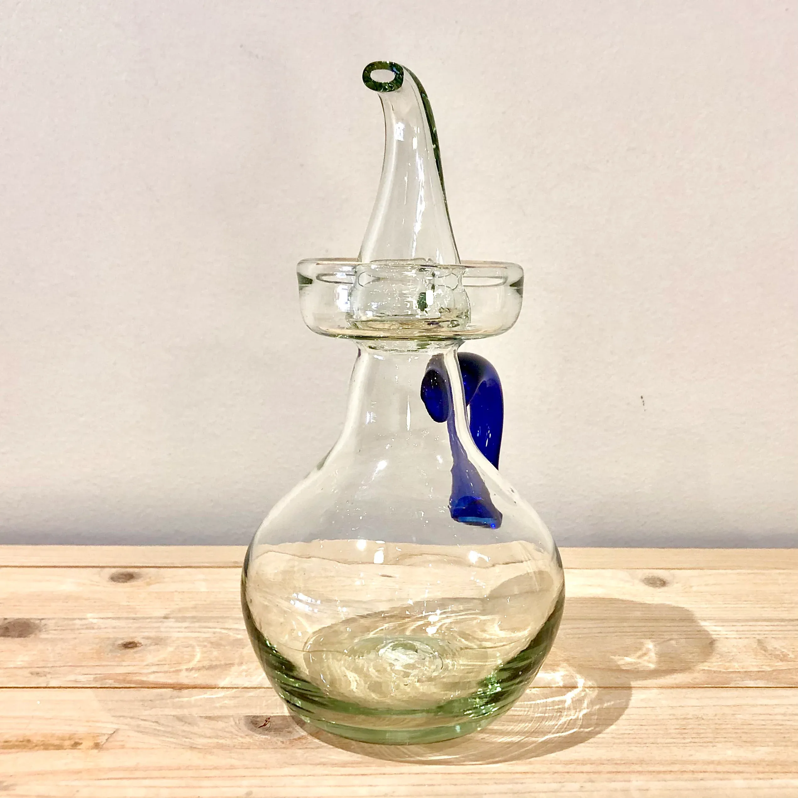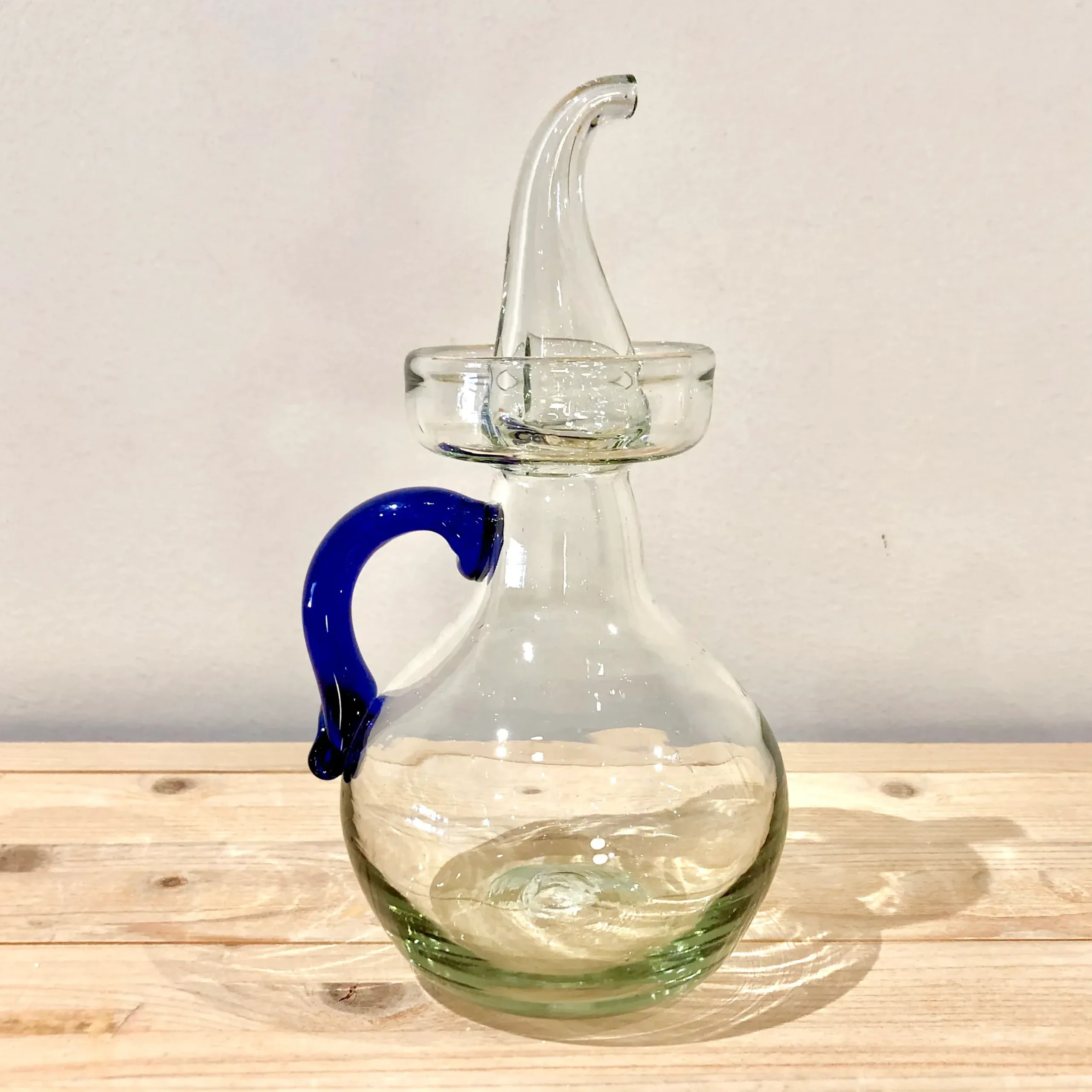 El cuerpo está realizado en vidrio transparente y el asa en azul tinta.