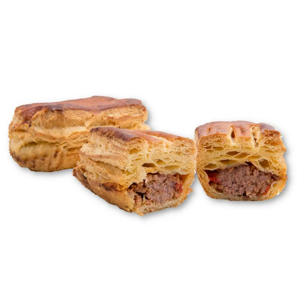 Exquisito hojaldre relleno de un sofrito de ternera con pimiento rojo y tomate.