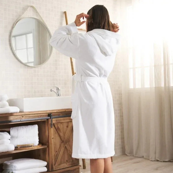 Albornoz con capucha en color Blanco Glacial, de algodón extra suave y esponjoso para una alta absorción y secado rápido