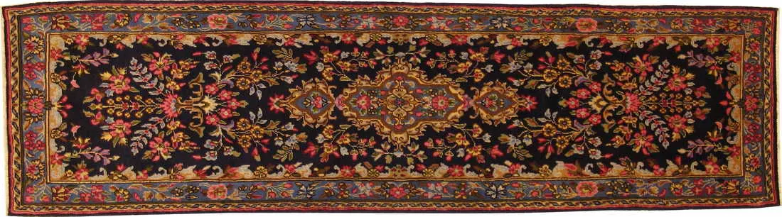 Alfombra persa. Anudada a mano. region de Kerman, Lana Virgen. Medidas: 254×068 cm.