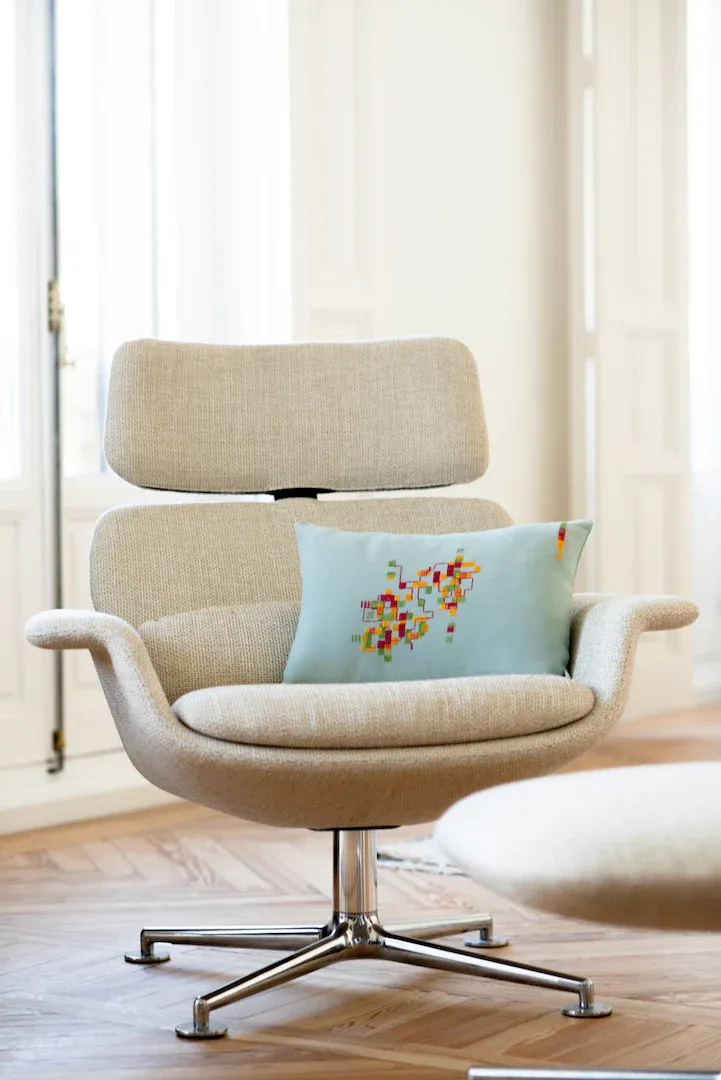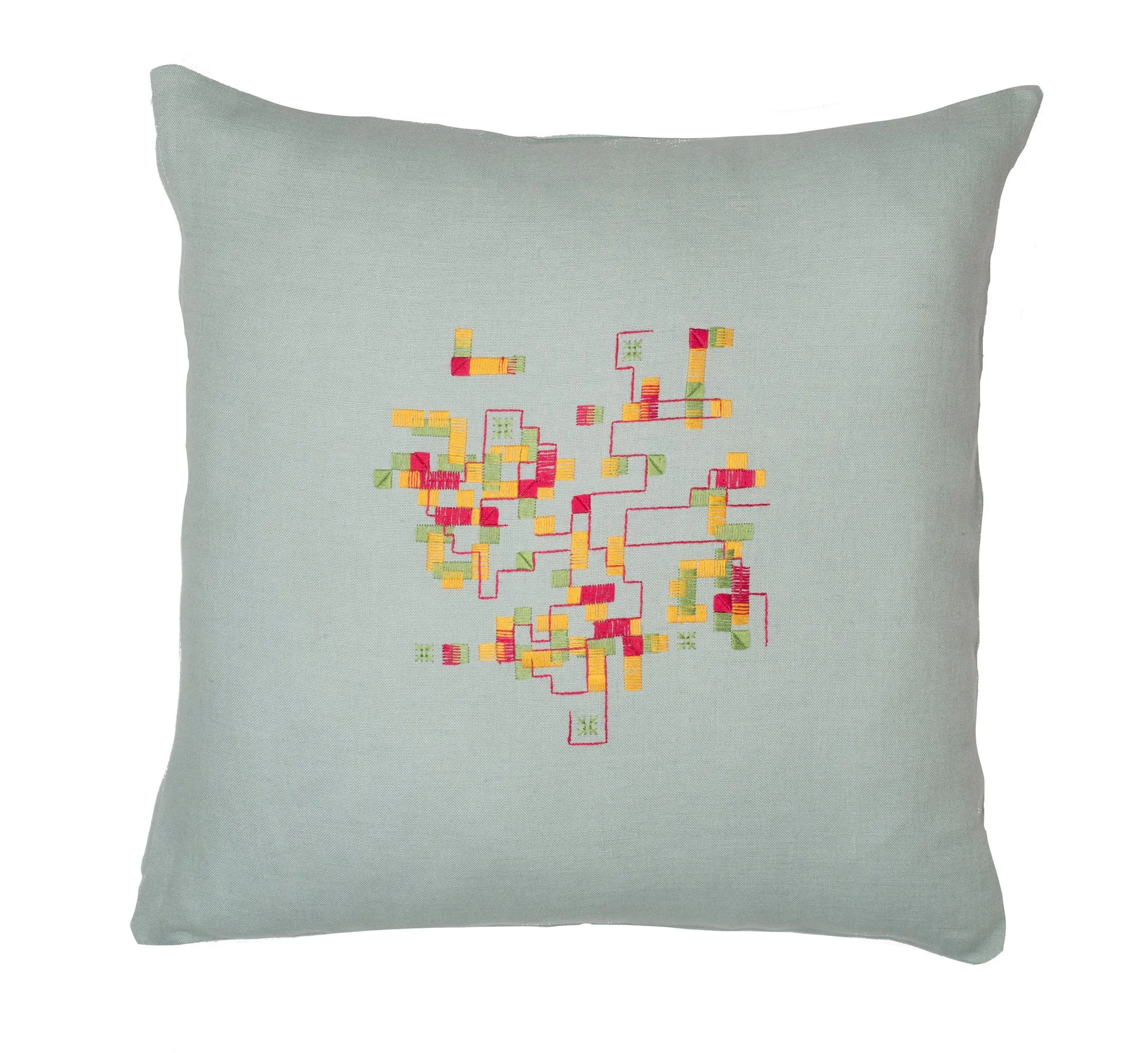 Almohadones de lino bordados a mano con la técnica del punto pasado.