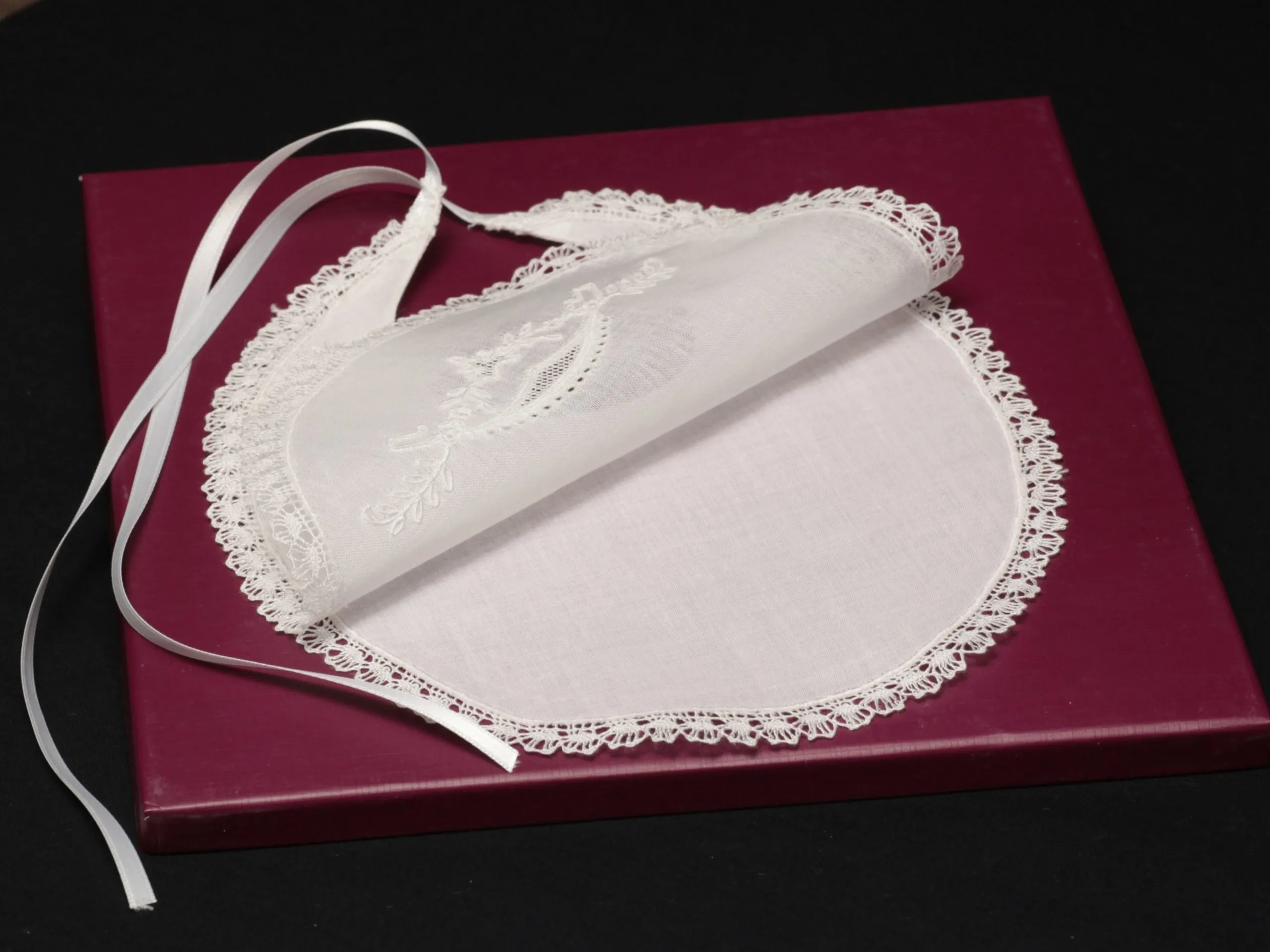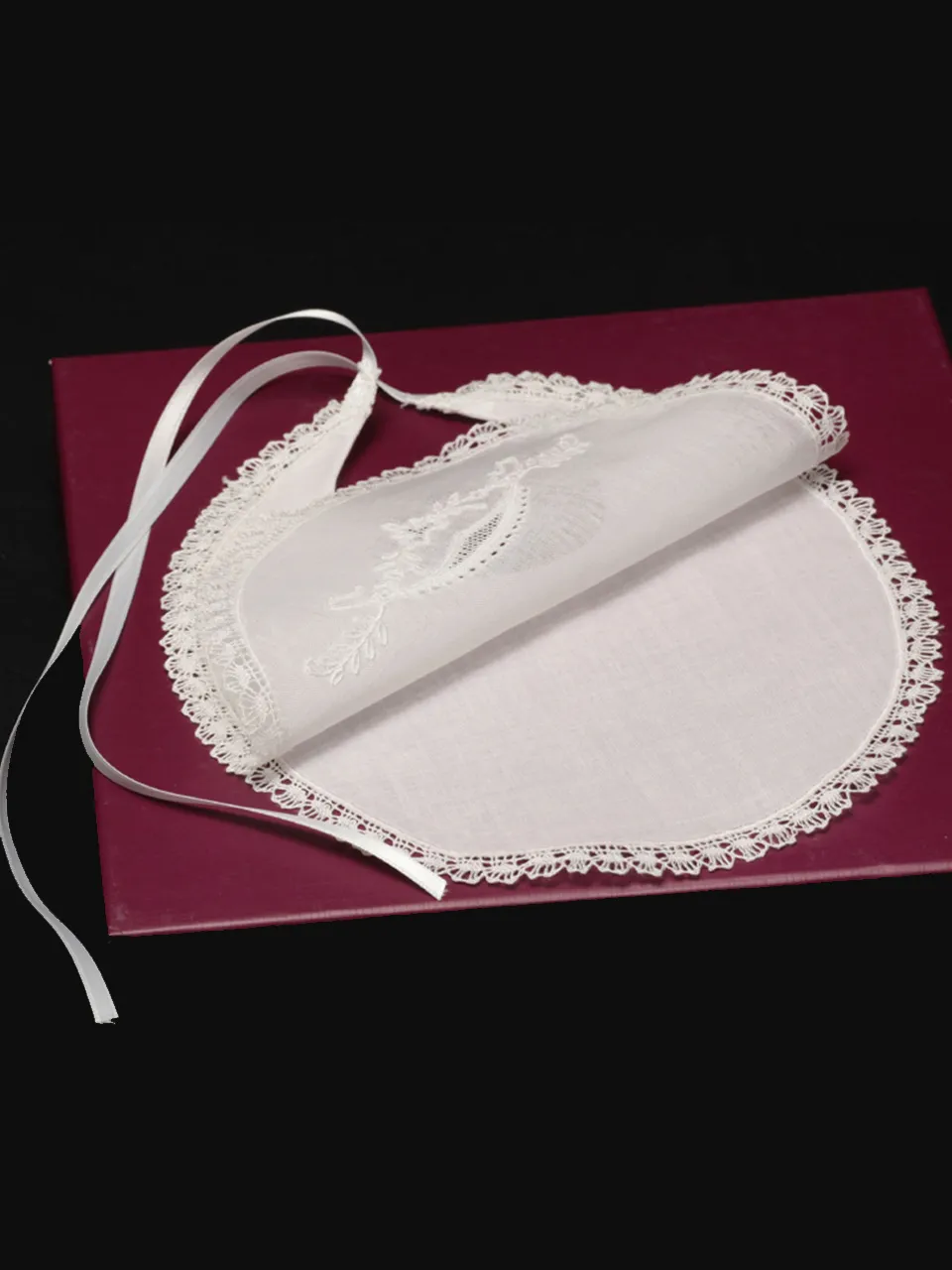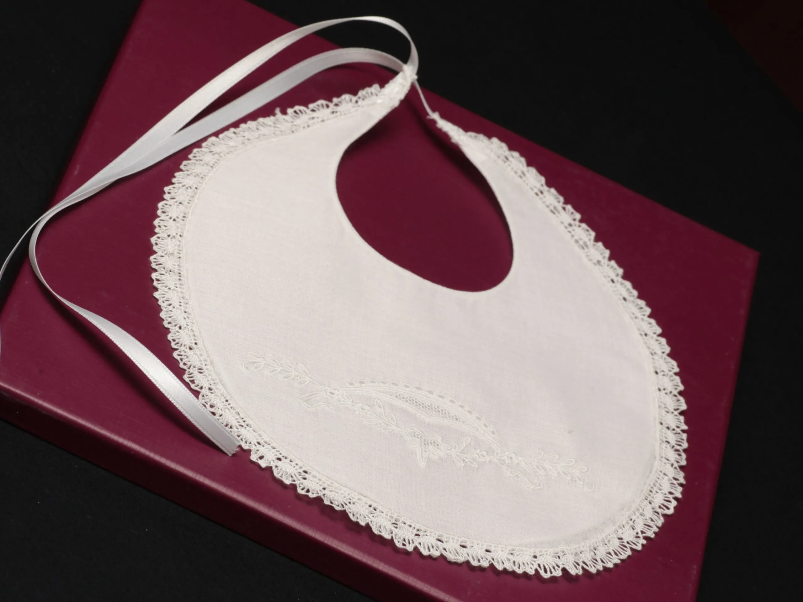 Este babero  está elaborado con dos telas de distinta textura, una batista rosa pálido y una organza de algodón blanca sobre la que hemos bordado una delicada guirnalda. Ambas han sido primorosamente rematadas con un fino encaje de bolillos hecho a mano.