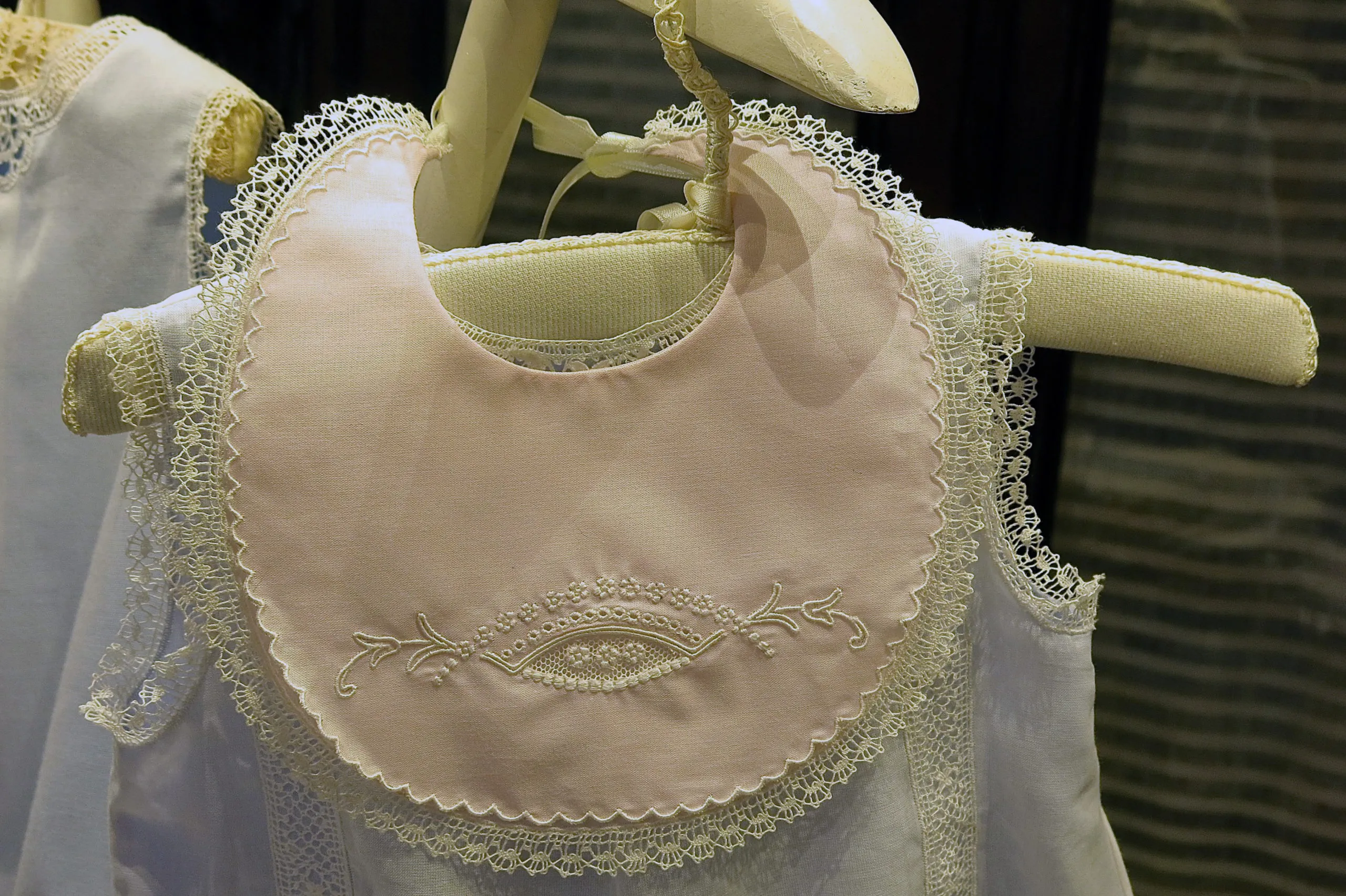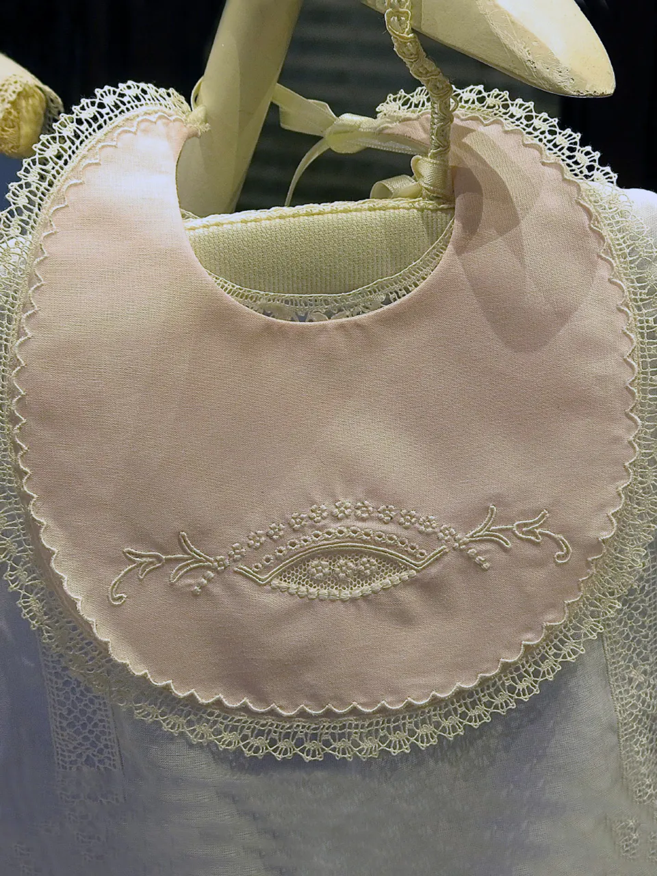 Elaborado con dos telas de batista, ha sido enriquecido con un delicado bordado, ambas batistas están rematadas independientemente con encaje de bolillos