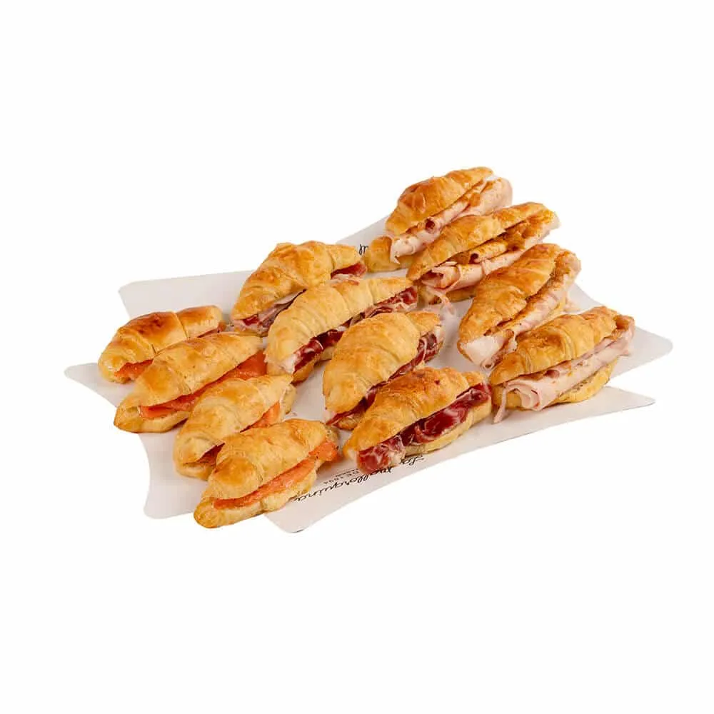 Bandeja de Mini Croissants Salados ideal para disfrutar en cualquier momento. Tanto para una reunión de empresa, fiestas de cumpleaños o para un bonito día de picnic con amigos. Deliciosa masa hojaldrada rellena de tus sabores favoritos.