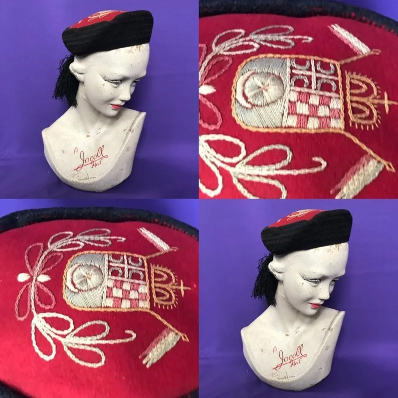 Esta fabulosa boina de fieltro roja tiene bordado un escudo de armas en la parte superior, y toda la banda de su contorno está trabajada con bordado en bucles negros para darle cuerpo a su estructura. Sin duda lo mejor de esta boina antigua son sus 5 borlas de seda laterales, que le dan un aire de lo más chic.