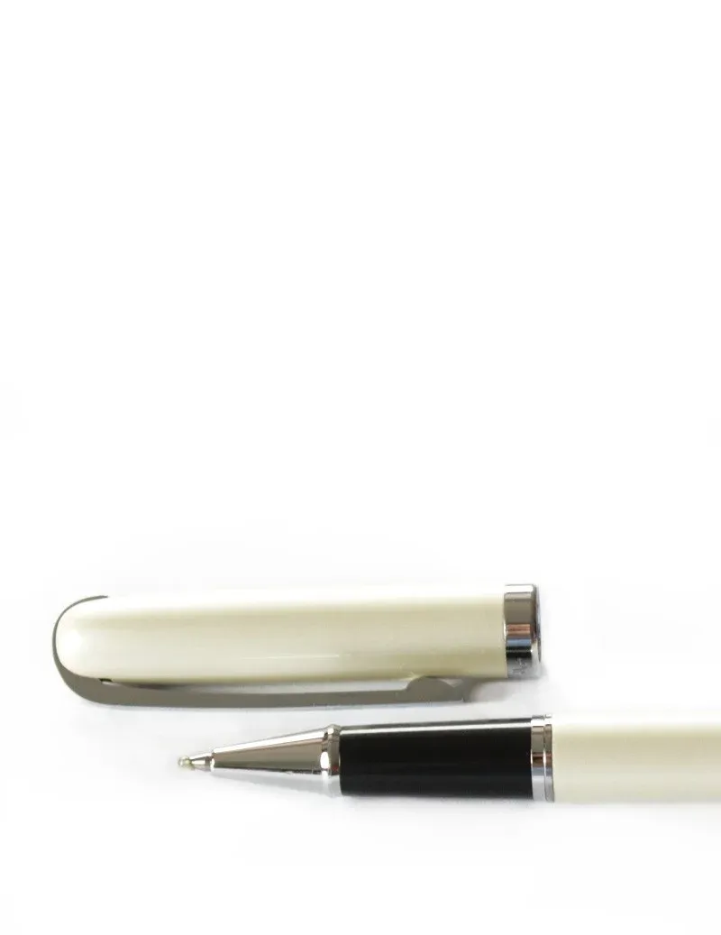 Bolígrafo blanco nacarado+ acero elegante y con un gran acabado se presenta en caja individual, ideal para regalar.