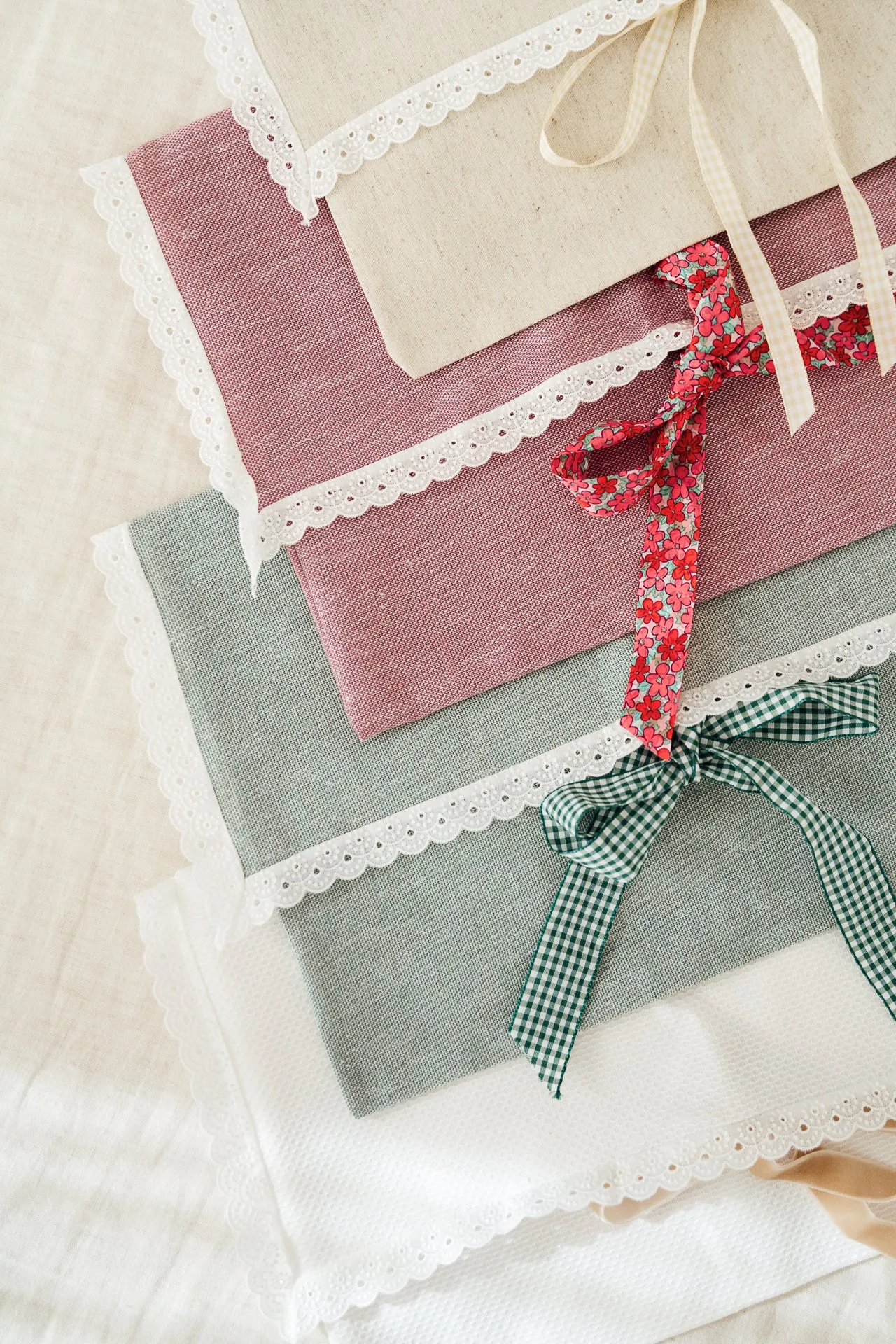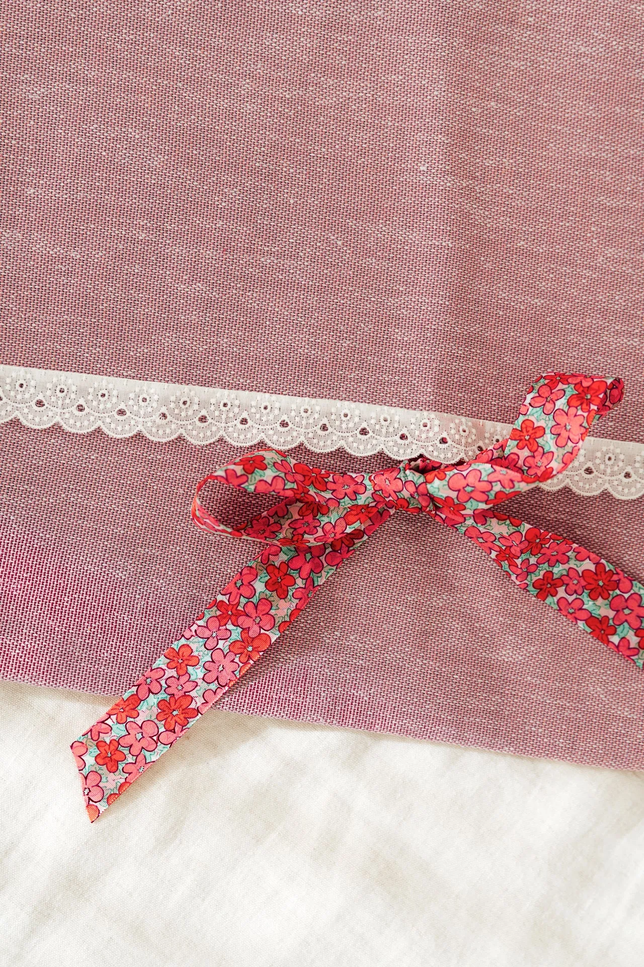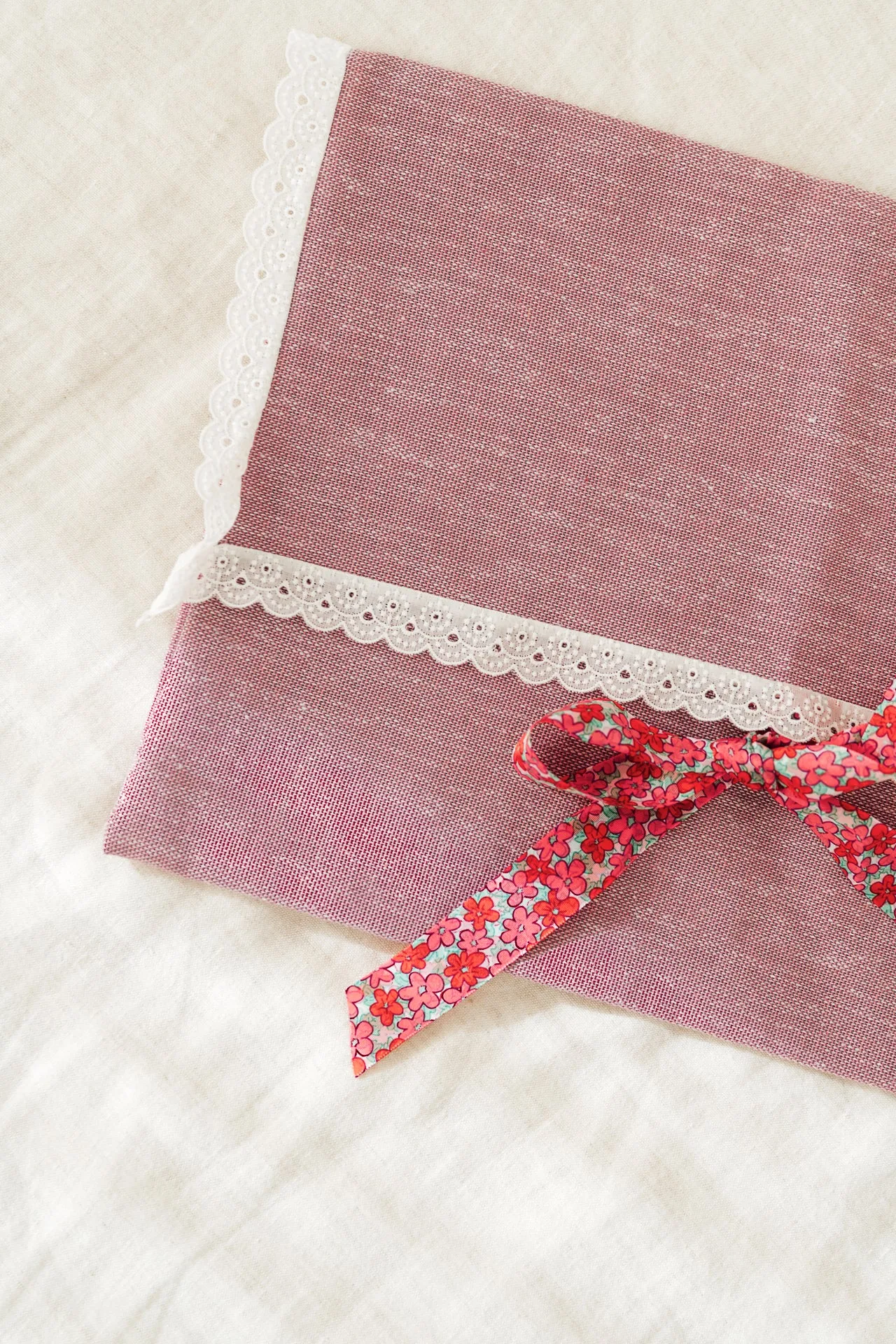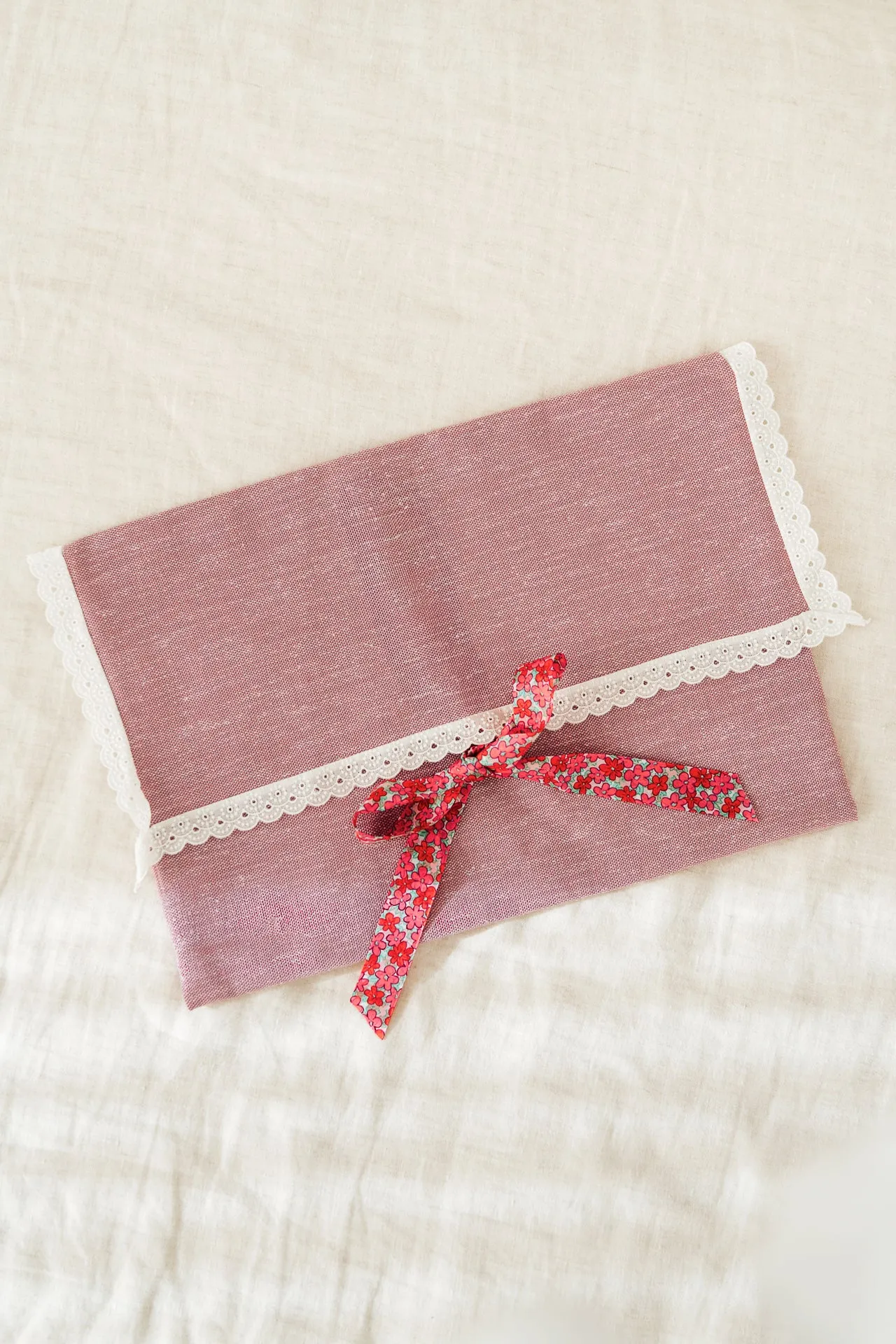 Bolsa con apertura en sobre confeccionada en algodón. La puntilla y la cinta de flores hacen de esta bolsa algo especial y delicado. Para guardar la primera puesta del bebé o prendas de la novia. Te acompañará toda la vida en las ocasiones más especiales.