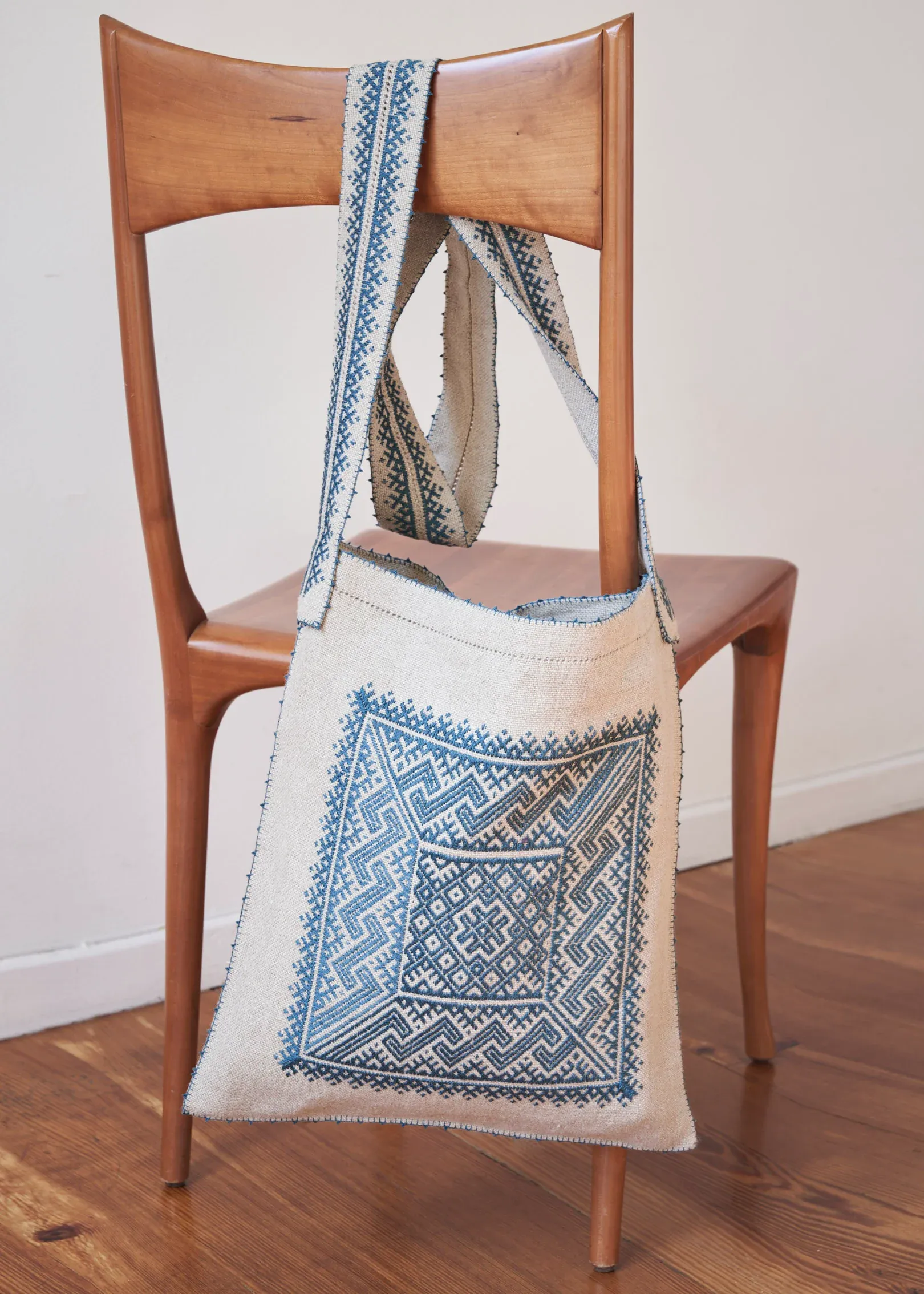Bolso de lino confeccionado y bordado a mano, con la técnica del tejidíllo y rodeado de piquíllos. El original de esta exquisita bolsa de fibras naturales esta basada en una pieza antigua de familia. Este bolso ha sido tejido por las mujeres de la provincia de Toledo.