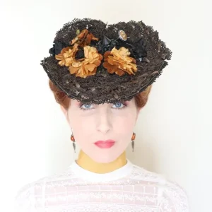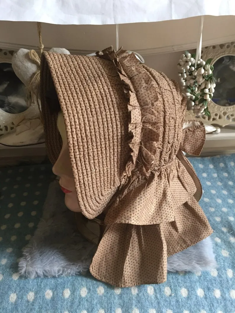 Hecho a mano en un delicado algodón calicó beige con patrón de motitas, este precioso bonete victoriano del siglo XIX tiene el diseño típico de la época: ¡igual que los que lucían las actrices de Mujercitas! Tiene visera ribeteada, cuerpo con frunces y una tira plisada, y un volante con pequeñas tablas sobre la nuca. Remata con un precioso lazo en la parte de atrás y dos enormes lazos para atar bajo la barbilla.