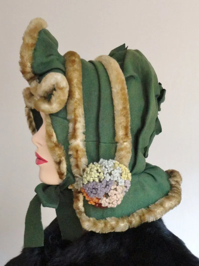 Está en tan buen estado que es difícil de creer, pero este fabuloso bonete danés ¡tiene más de 150 años! Realizado en fieltro color verde menta y ribeteado con una piel de imitación en tonos dorados, promete ser de lo más calentito. El forro interior es también de lana, en color salmón. Está adornado con un ramillete de nomeolvides de colores diminutas, manufacturadas a mano con pequeños pétalos modelados en fieltro de colores ¡Una absoluta delicia para ver y vestir!