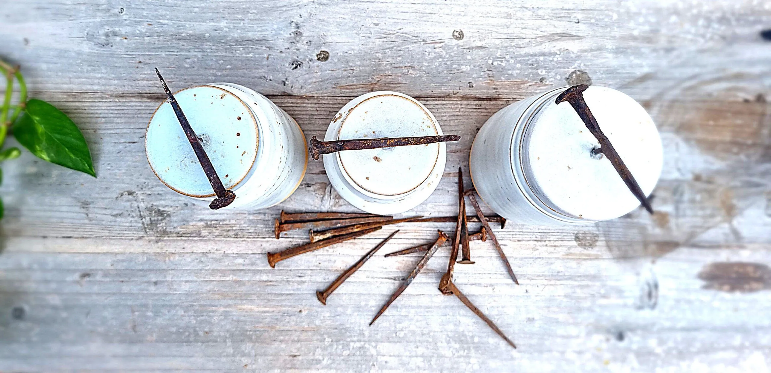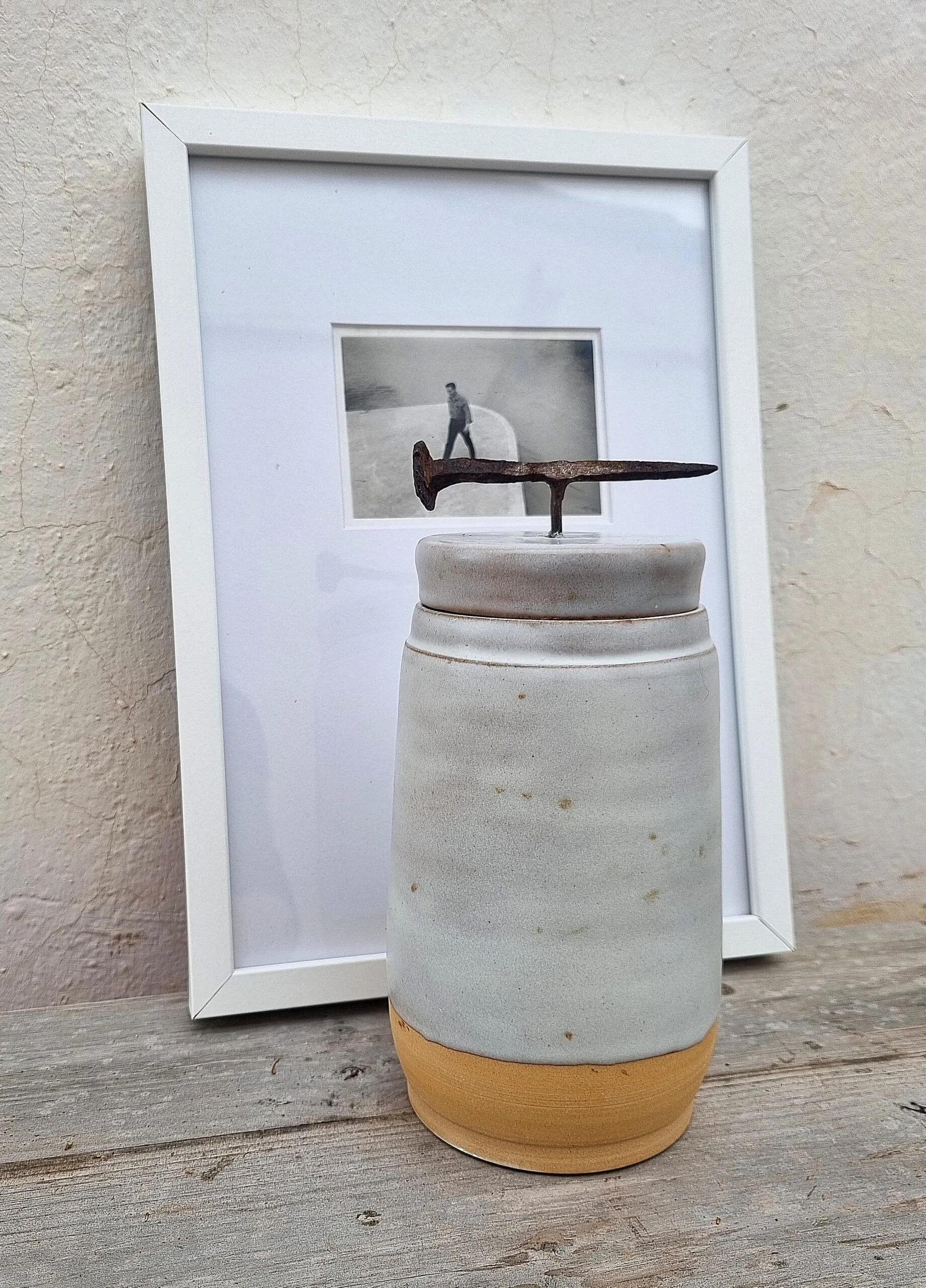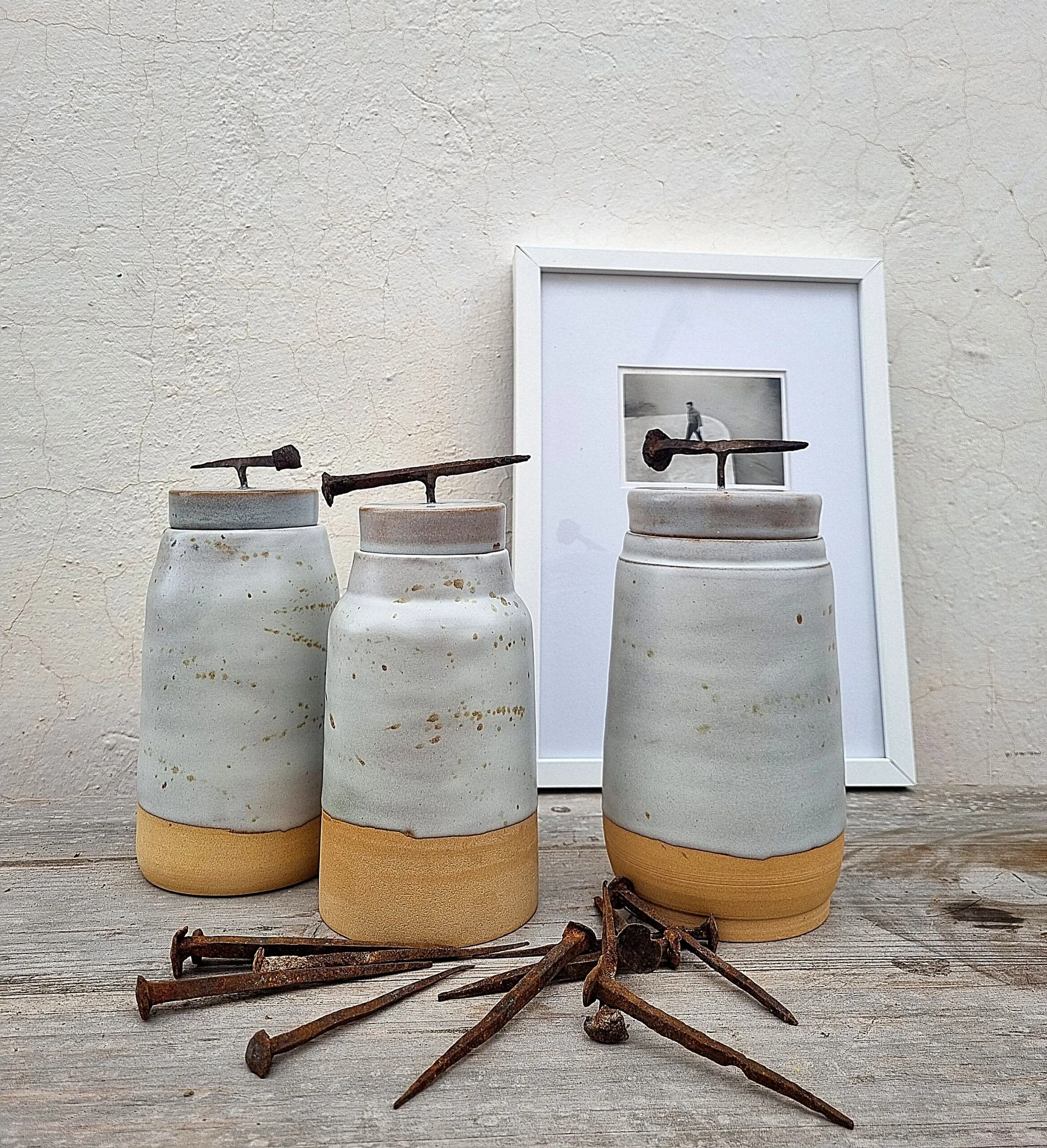 Botes hechos en gres . Su asa es de clavos antiguos recuperados y tratados.
