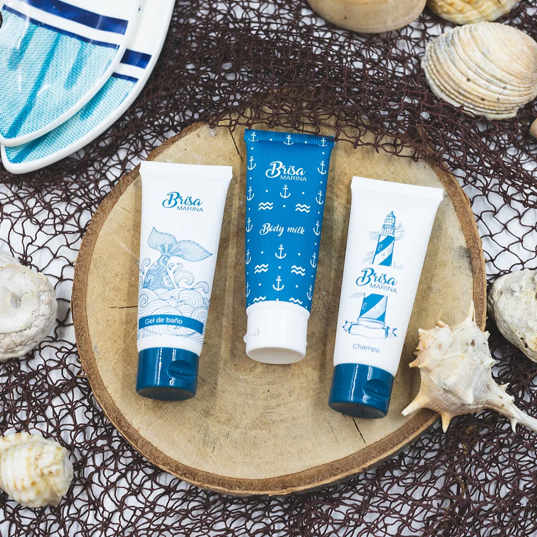 Colección de eco amenities orientada para los alojamientos de costa. Cada envase está diseñado con un motivo marinero diferente y hará sentir a tus huéspedes el olor de la brisa marina en el baño de la habitación.