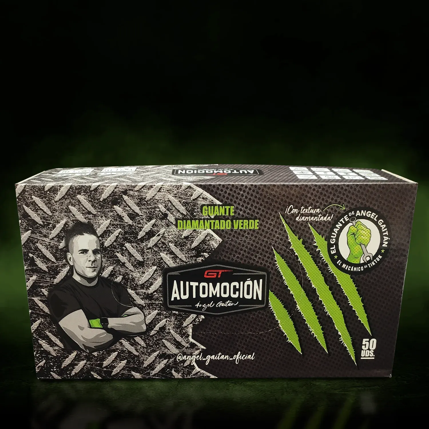 Guantes de Nitrilo Diamantados de color verde, utilizados por Ángel Gaitán en su día a día. Gracias a su resistencia y agarre, estos guantes que son ideales para utilizar en talleres, fábricas e industria, entre otros usos, se les puede dar una segunda vida ya que son reutilizables.