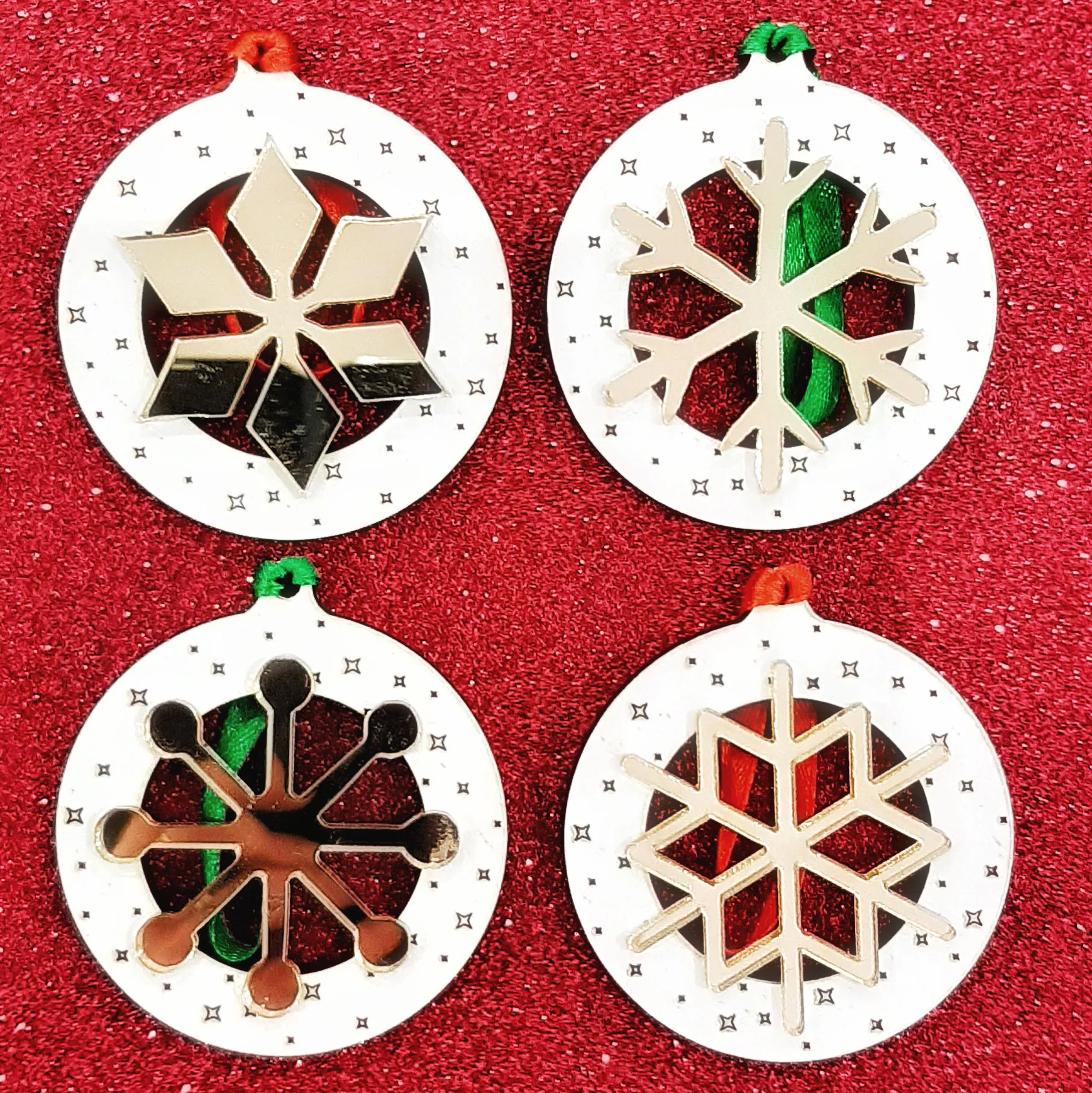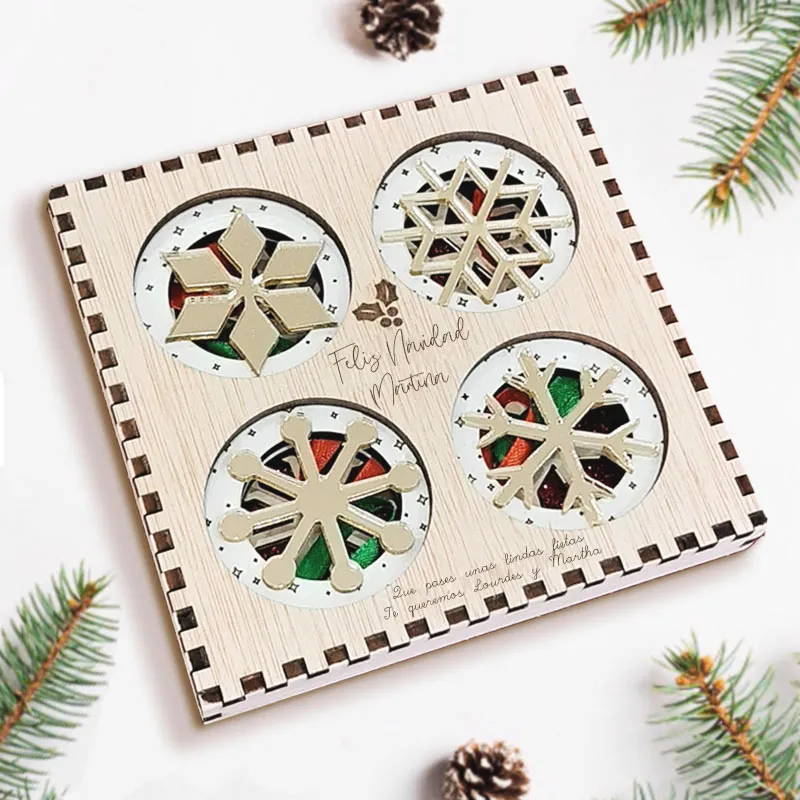 Te encantará este set de 8 bolas navideñas, son 4 diseños diferentes que harán brillar tu árbol de navidad. El set viene dentro de una caja de madera en la que puedes colocar un texto personalizado y crear un lindo regalo de navidad para alguien especial.