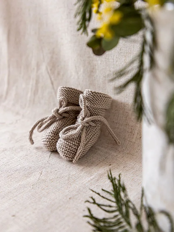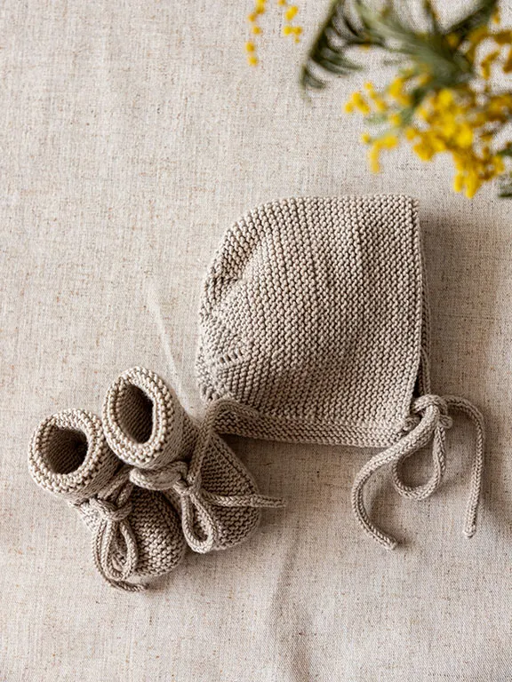 Capota y patucos a juego, hechos a mano, de lana merino para otoño/invierno y de algodón 100 % para primavera. Color sand (arena). Talla 0 – 3 meses.