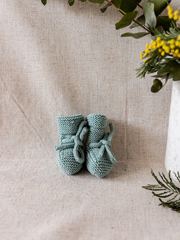 Capota y patucos a juego, hechos a mano, de lana merino para otoño/invierno y de algodón 100 % para primavera. Color soft green (verde). Talla 0 – 3 meses.