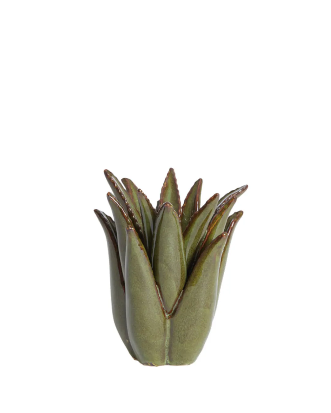 Candelabro con forma de cactus de cerámica en color verde oscuro. Medidas 13 cm. alto x 13 cm. ancho. Peso 0.830 kg. Producto apto para exteriores. No incluye vela.