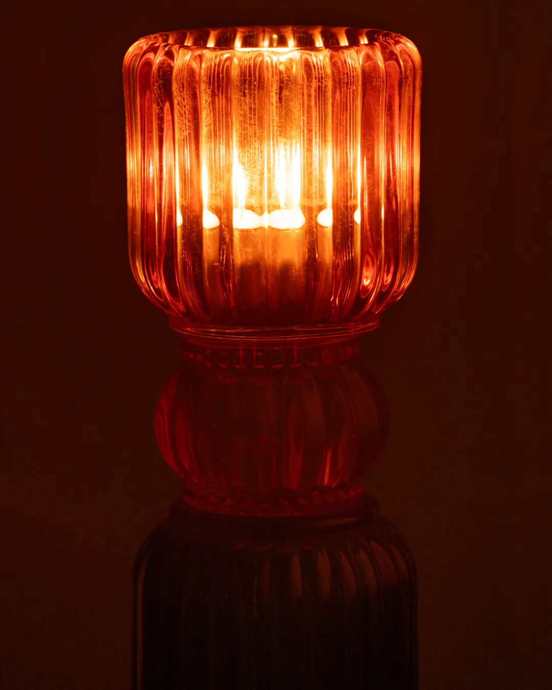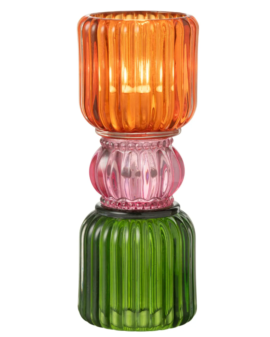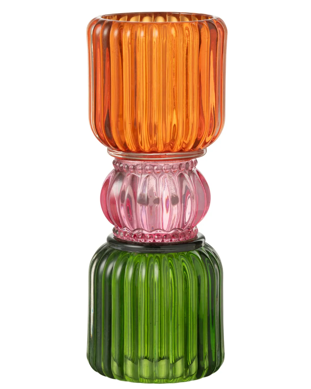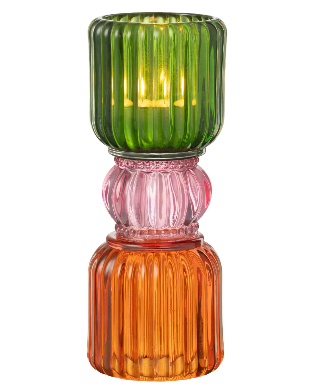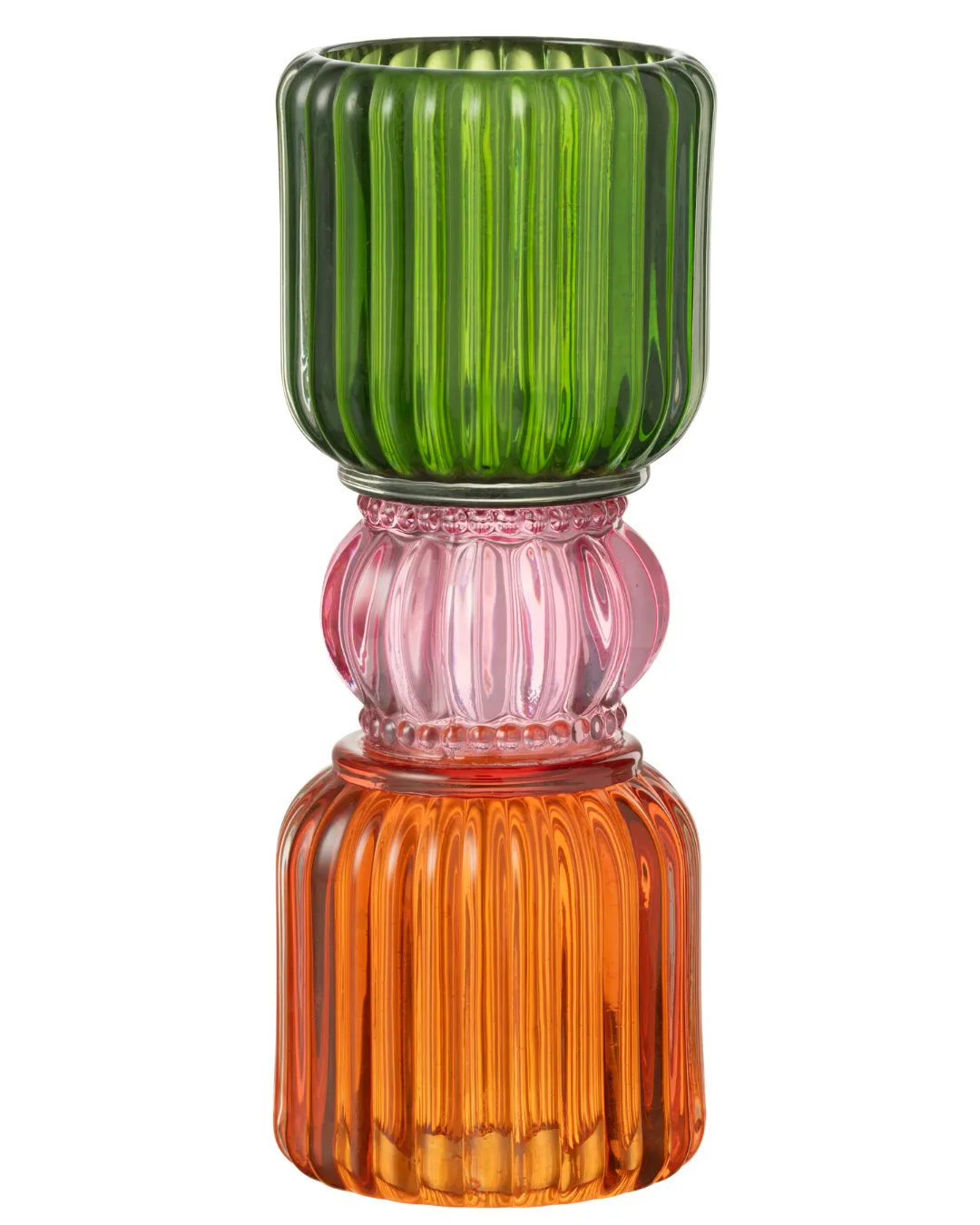Candelabro con mezcla de vidrios en color verde, rosa y naranja, reversible. Medidas 21 cm. alto x 8,5 cm. ancho. Peso 1 kg. No incluye vela.