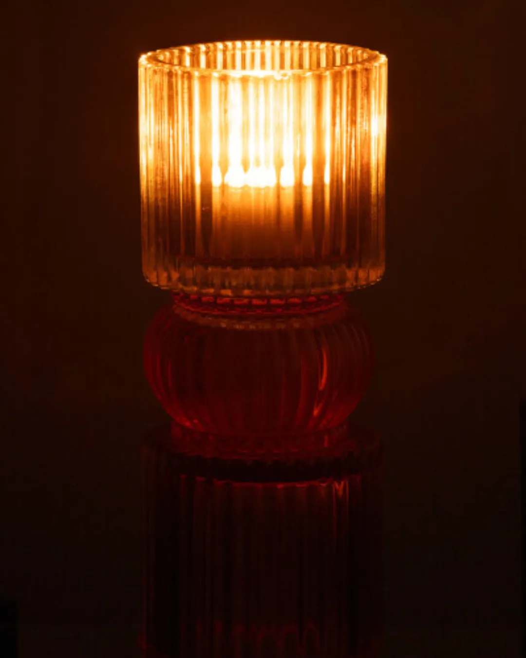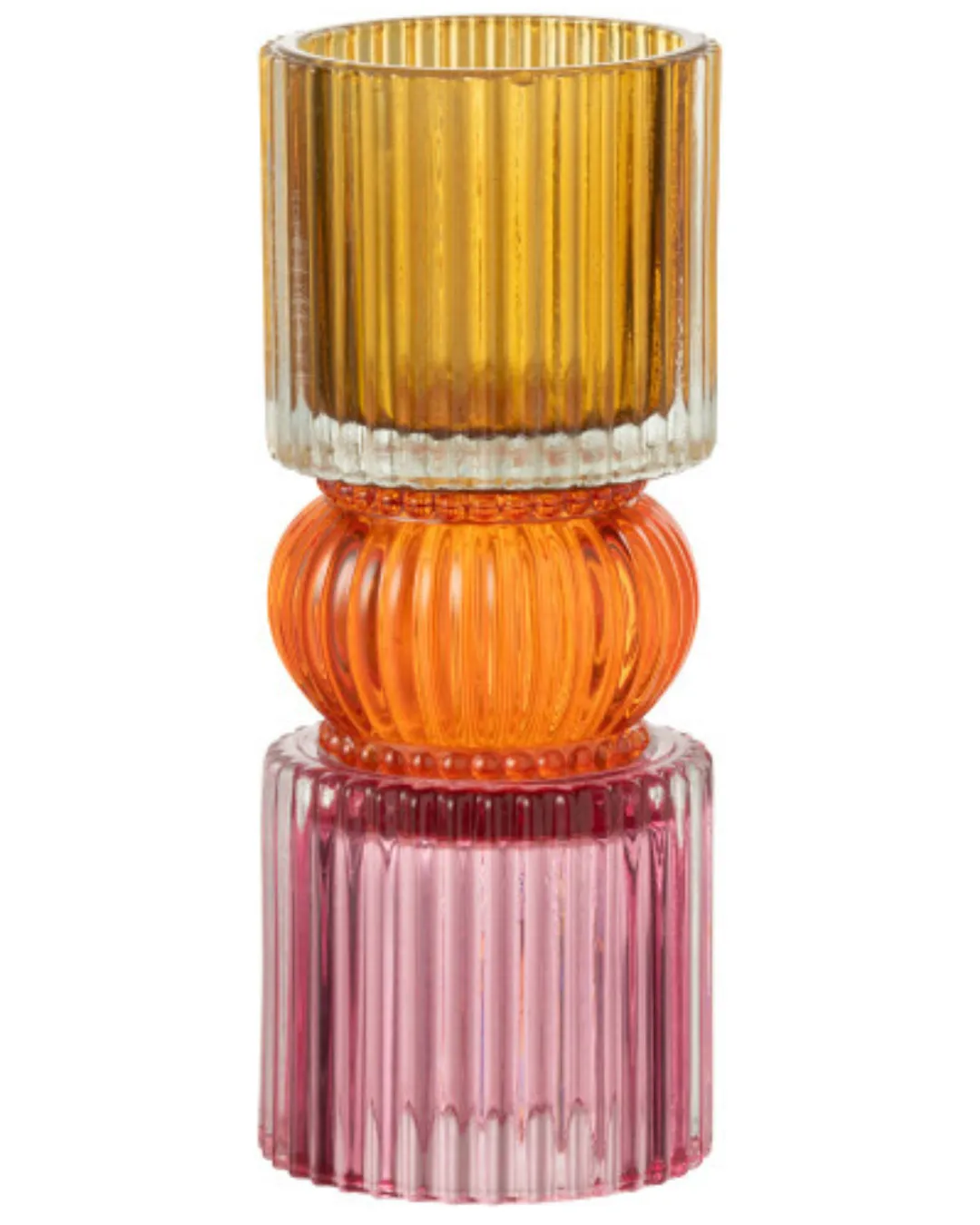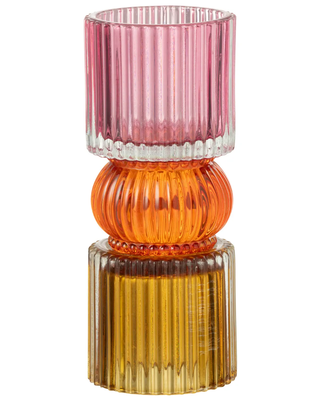 Candelabro con mezcla de vidrios en color amarillo, rosa y naranja, reversible. Medidas 18 cm. alto x 7 cm. ancho. Peso 0.605 kg. No incluye vela.