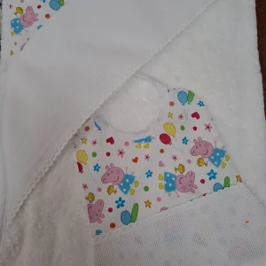 Conjunto de capa de baño para bebe con su babero, con pieza de tela Aída para bordar en punto de cruz.