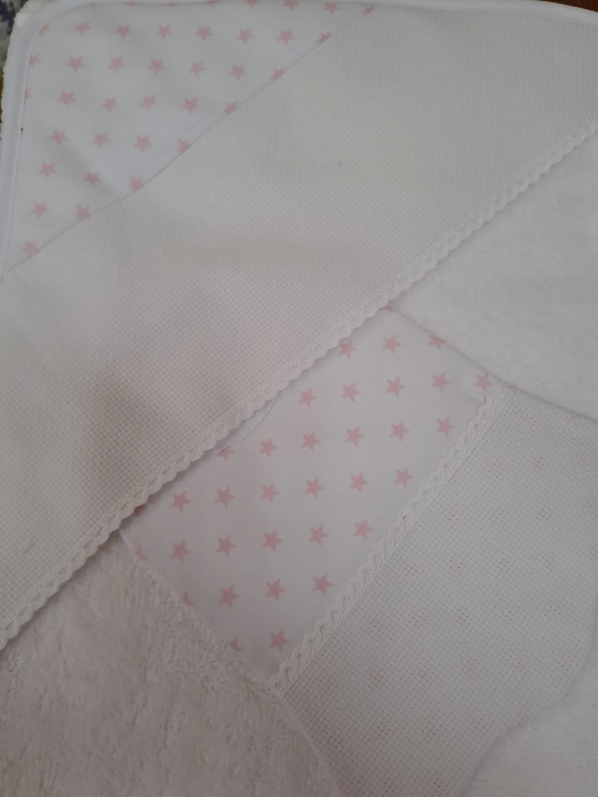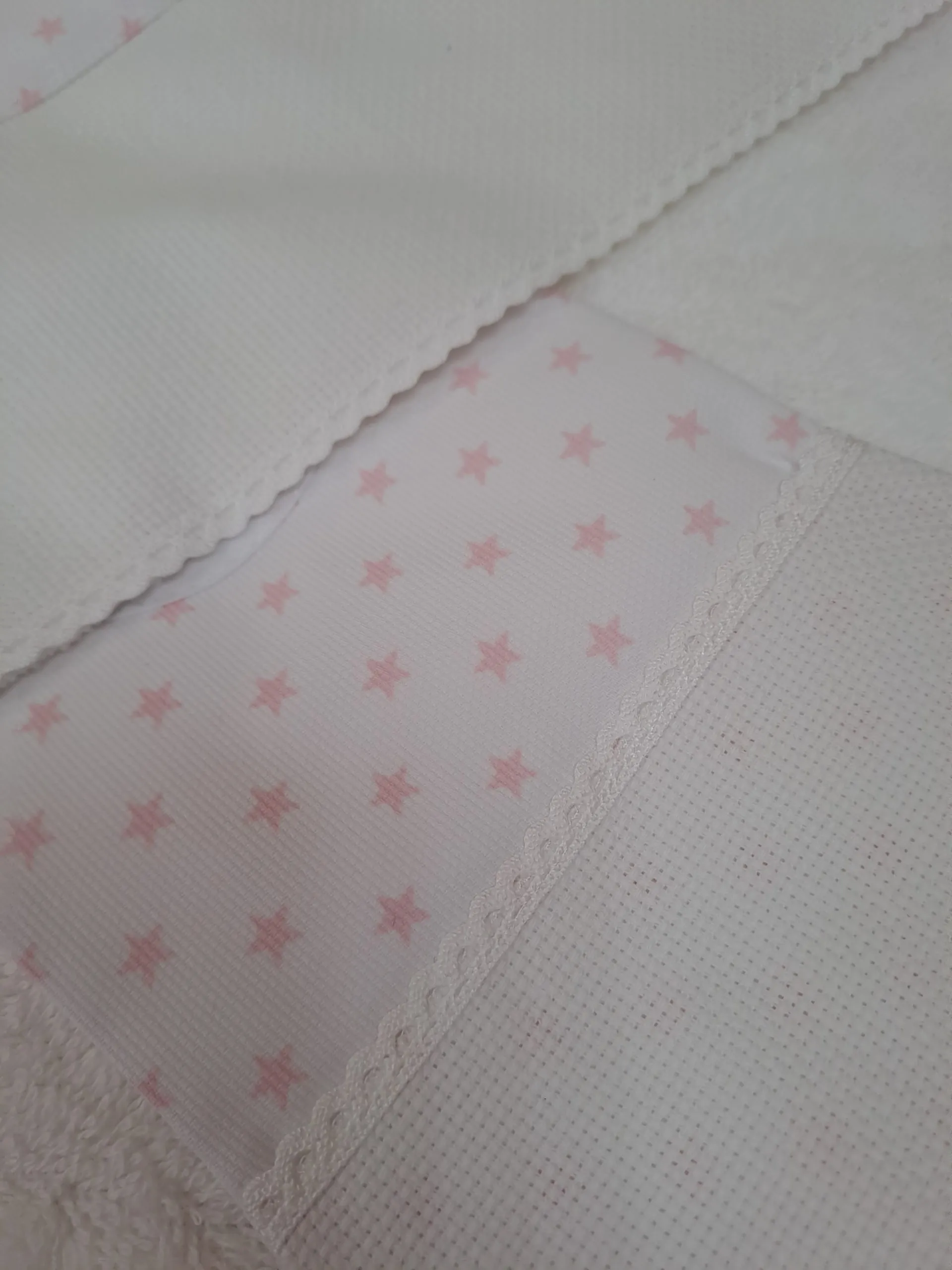 Capa Baño Estrella Rosa conjunto de capa de baño para bebe con su babero, con pieza de tela aida para bordar en punto de cruz.