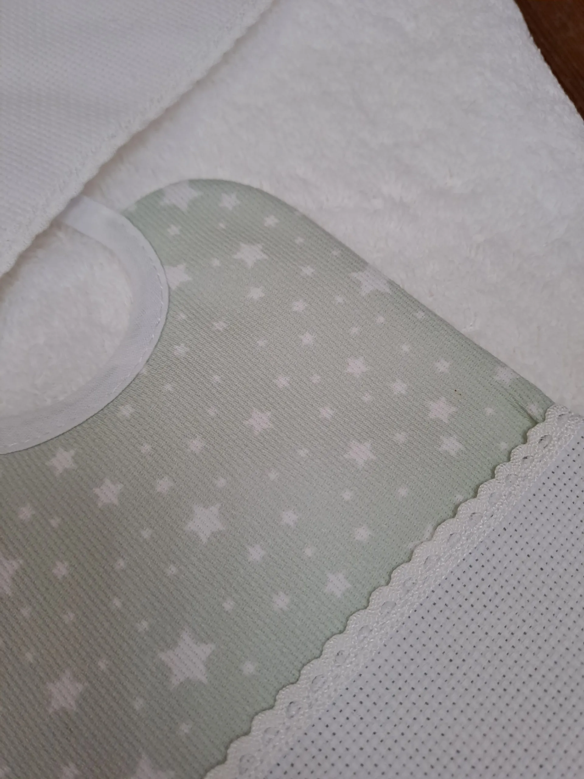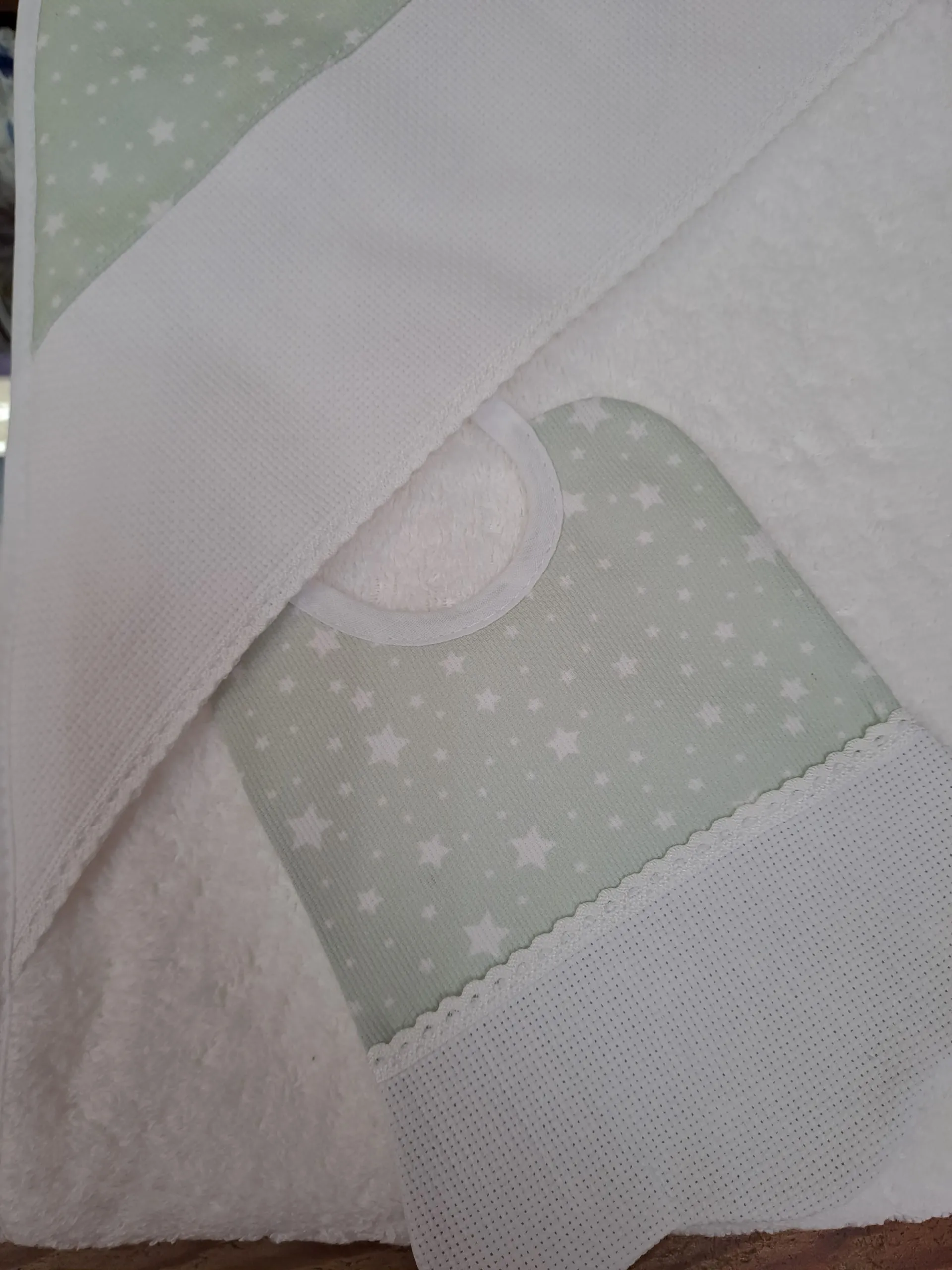 Capa Baño estrella fondo verde conjunto de capa de baño para bebe con su babero, con pieza de tela aida para bordar en punto de cruz.