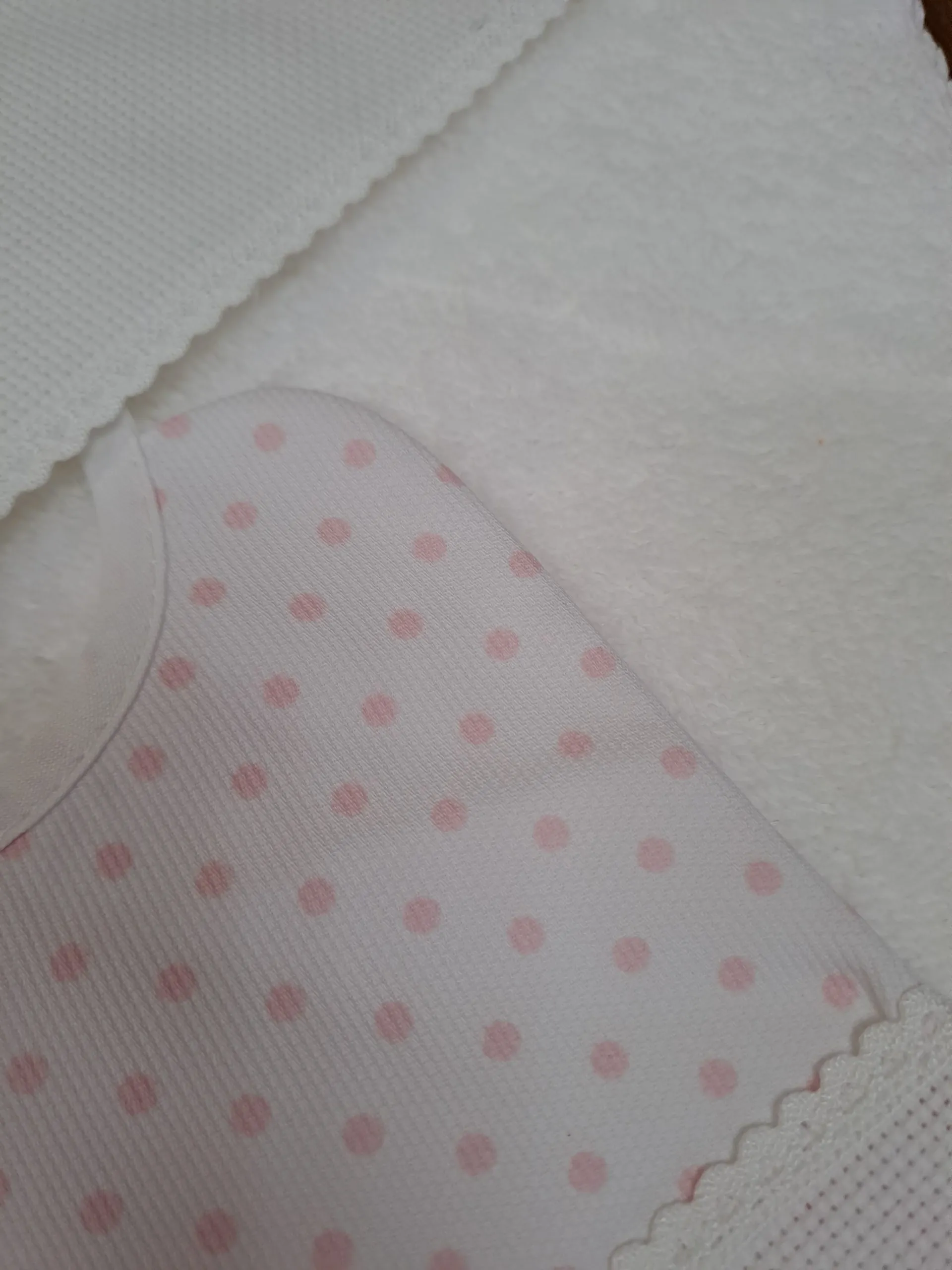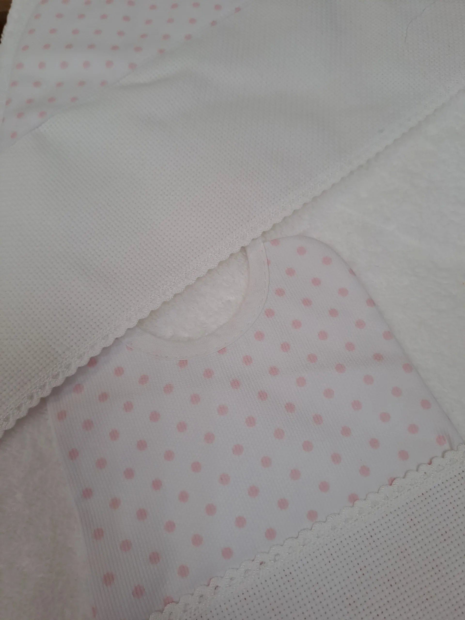 Capa Baño Lunar en color rosa. Conjunto de capa de baño para bebe con su babero, con pieza de tela aida para bordar en punto de cruz.
