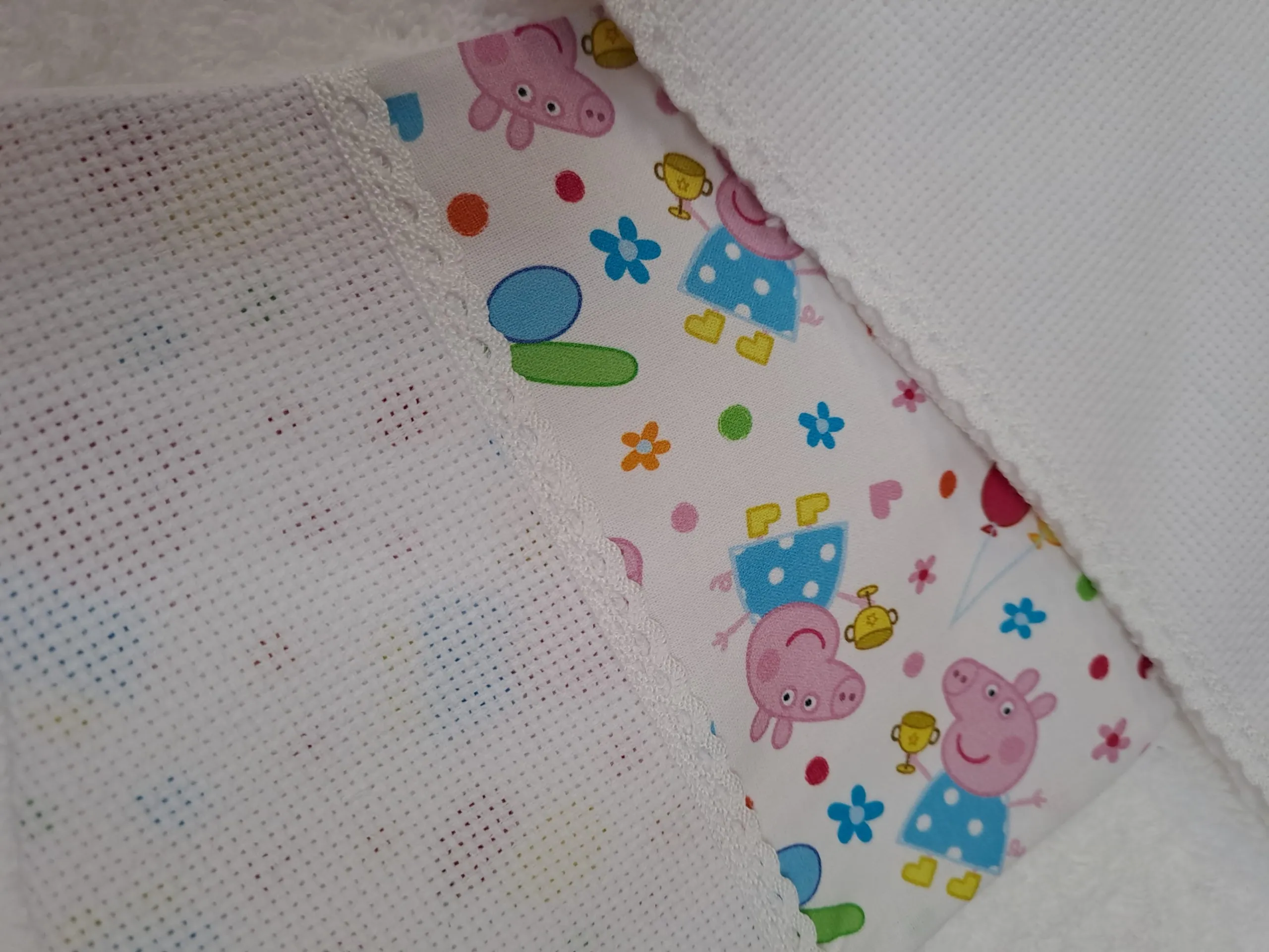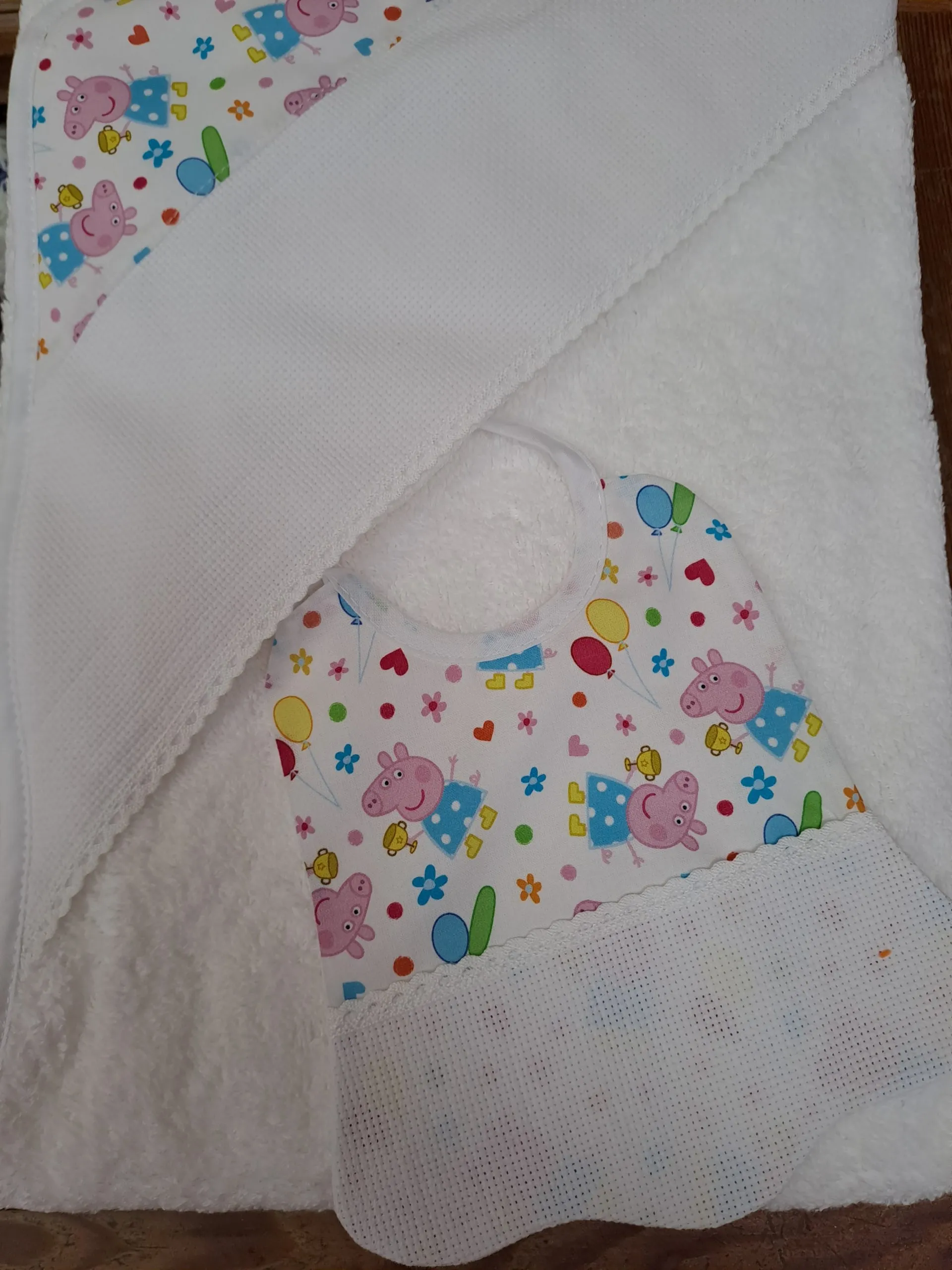 Capa Baño Peppa Pig. Conjunto de capa de baño para bebe con su babero, con pieza de tela aida para bordar en punto de cruz.