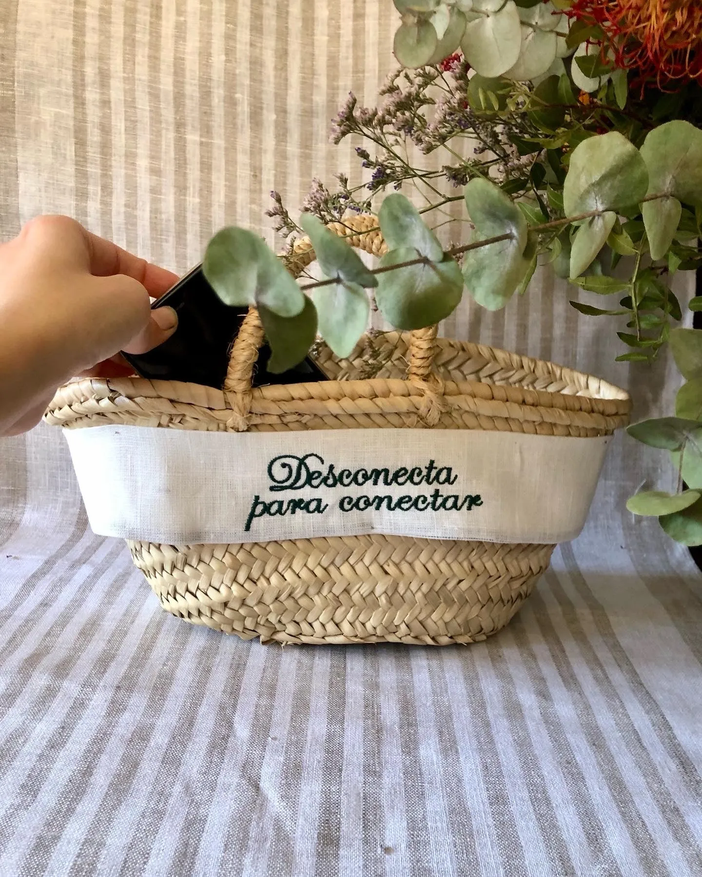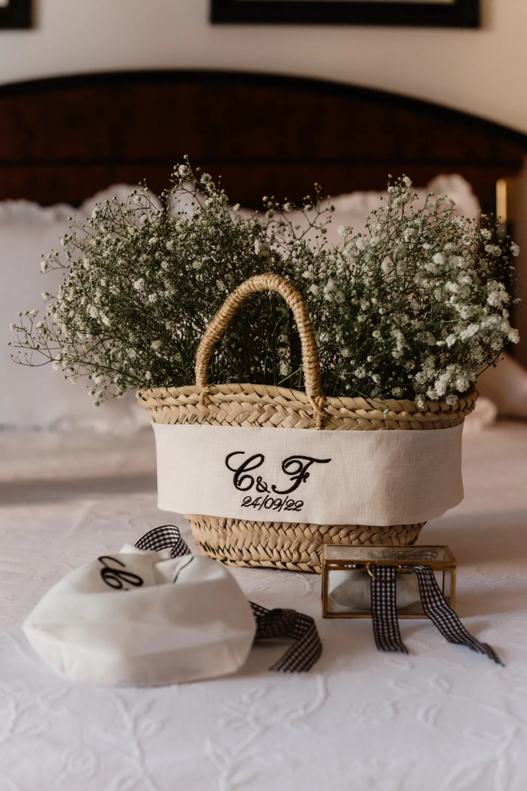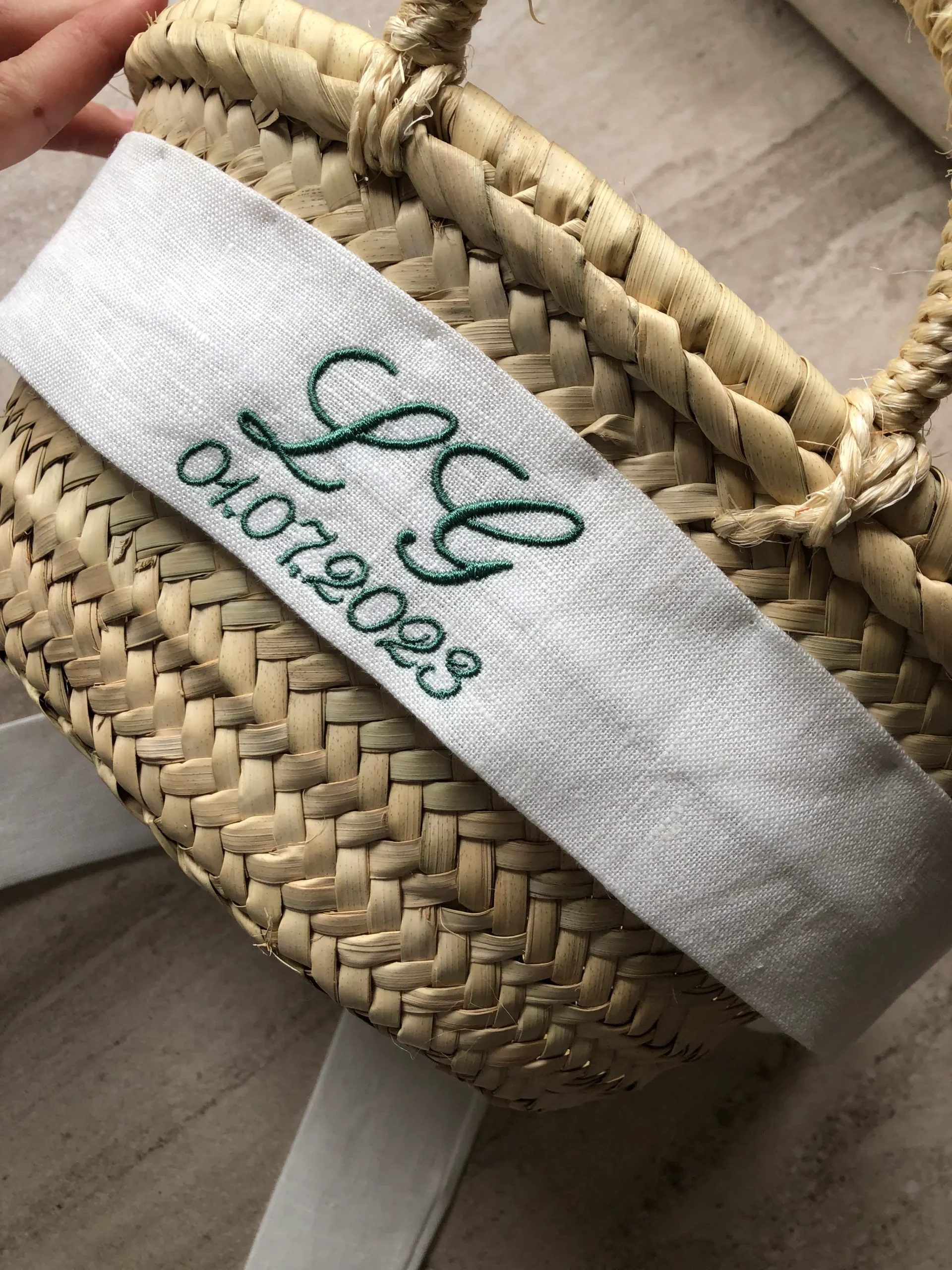 Capazo de palmito trenzado a mano en Mallorca. Personaliza tu capazo con tus iniciales o tu nombre, para recordar siempre ese momento tan especial.