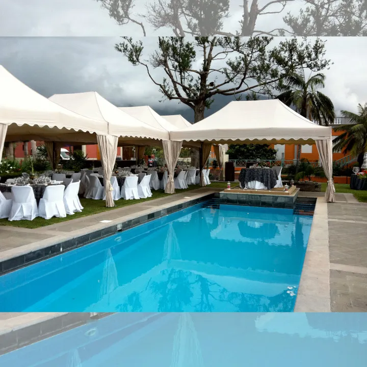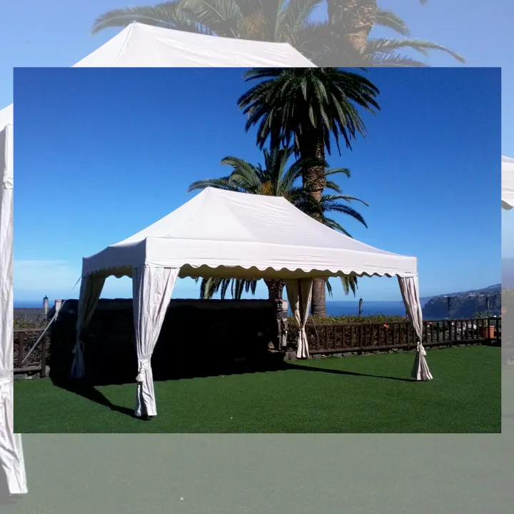 CARPA ROYAL MASTERTENT 6 X 4M – GALA – PREMIUM,. 24 m² de espacio para que se cumplan. Pasar unos momentos únicos con 48 huéspedes o acoger a 32 personas sentadas. Todo esto y mucho más es posible con la carpa plegable 6×4 m. Parece prometedor ¿verdad? La carpa plegable Mastertent 6×4 m ha sido proyectada y construida con cuidado para durar mucho tiempo – auténtica calidad europea. Altura de paso: 215 cm Altura máxima: 388 cm 59Kg.