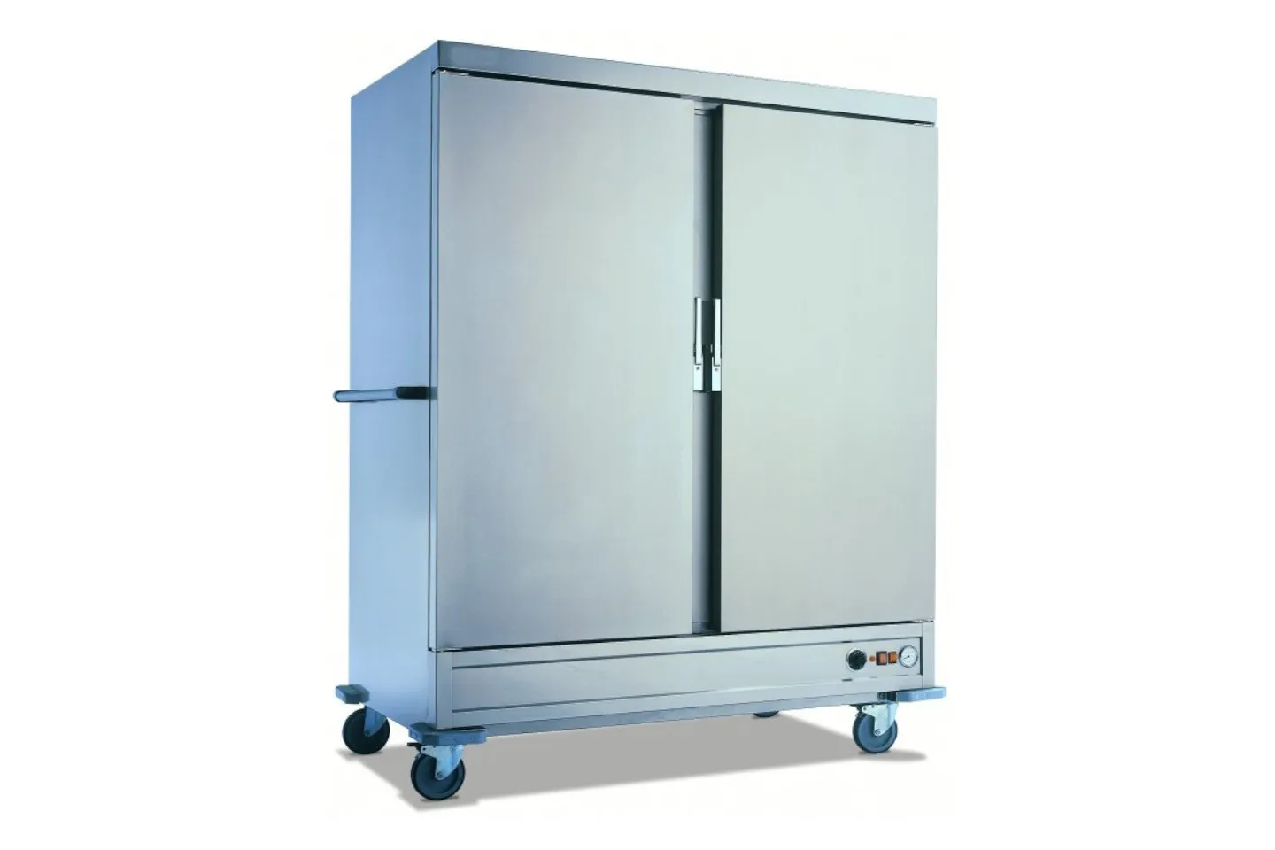 Carro caliente doble, para el mantenimiento y servicio de comidas previamente preparadas. Capacidad 40 Bandejas GN 2/1. Separación entre guías: 60 mm. Carro caliente construido totalmente en acero inoxidable .Doble pared con aislamiento . Dotado con 4 ruedas giratorias insonorizadas de 160 mm diámetro, 2 con freno y con parachoque de goma . Sistema de asas horizontales para su óptimo desplazamiento,. Incorpora cubeta donde se deposita agua para la creación de humedad. Termostato de control de 0º a 90 ºC. Bisagras con cierre automático. Medidas exteriores 1489 x 876 x 1640 mm . 2 Puertas. Capacidad : 40 guías GN 2/1. 230 V/1/50 Hz. 35kw
