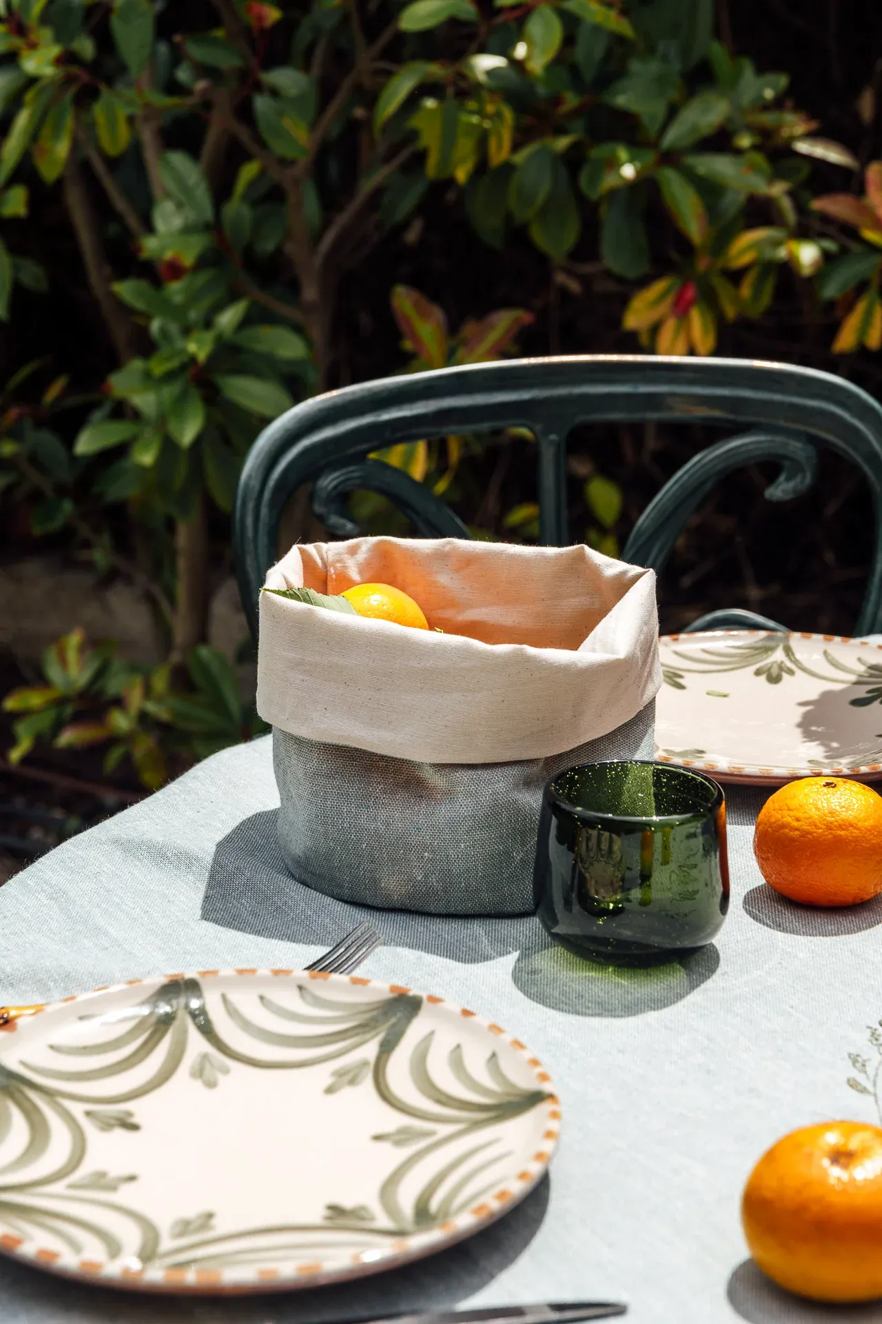 Cesta reversible en tono verde de algodón imitación lino. Tiene el tamaño ideal para hacer de paneras, de vacia-bolsillos o para poner en el baño. La doble tela hace que su estructura sea semirígida.
