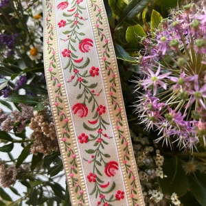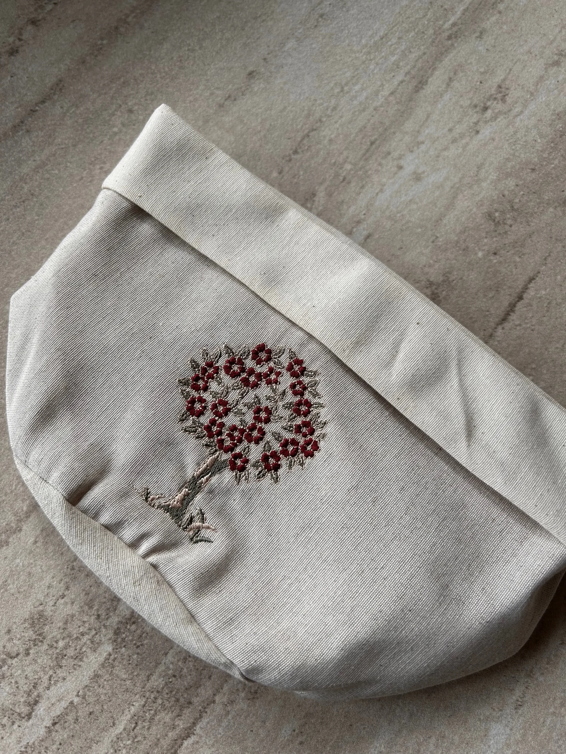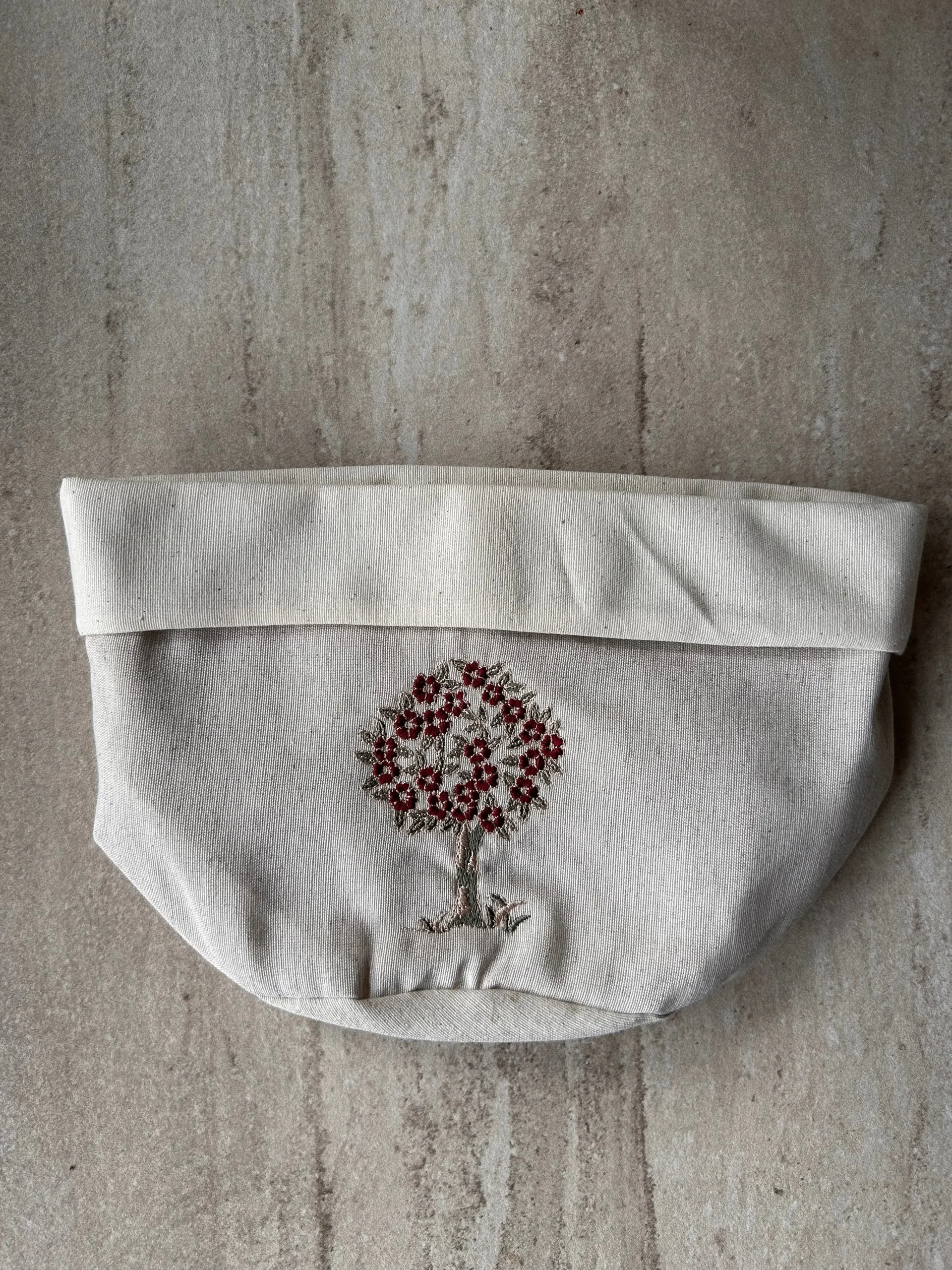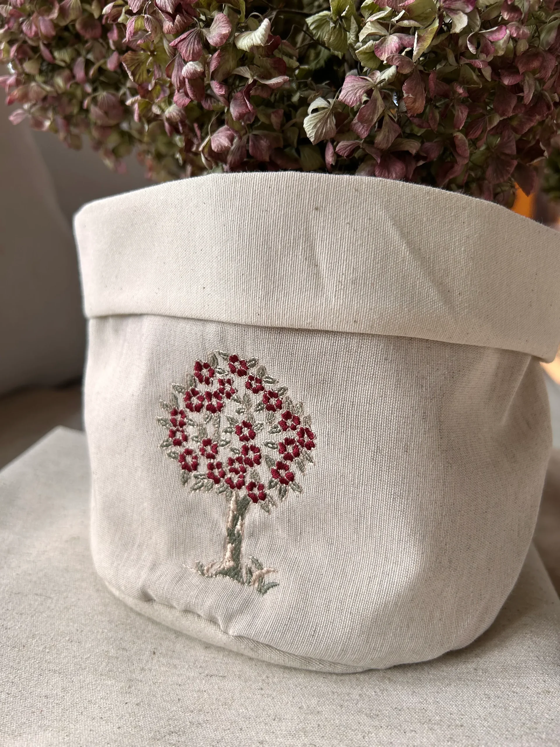 Cesta con bordado de árbol hecho en nuestro taller. Tiene el tamaño ideal para hacer de paneras, de vacia-bolsillos o para poner en el baño. La doble tela hace que su estructura sea semirígida.
