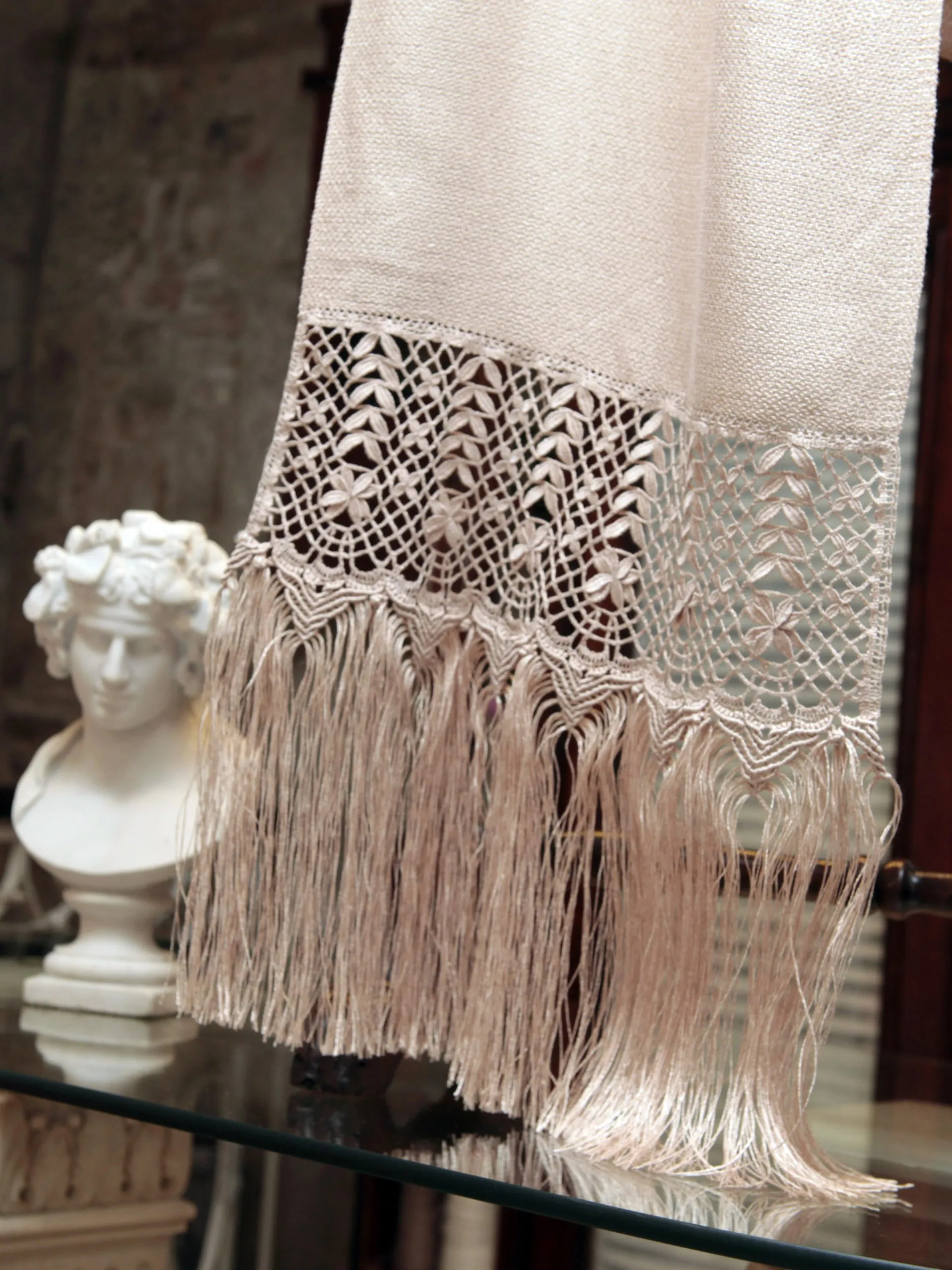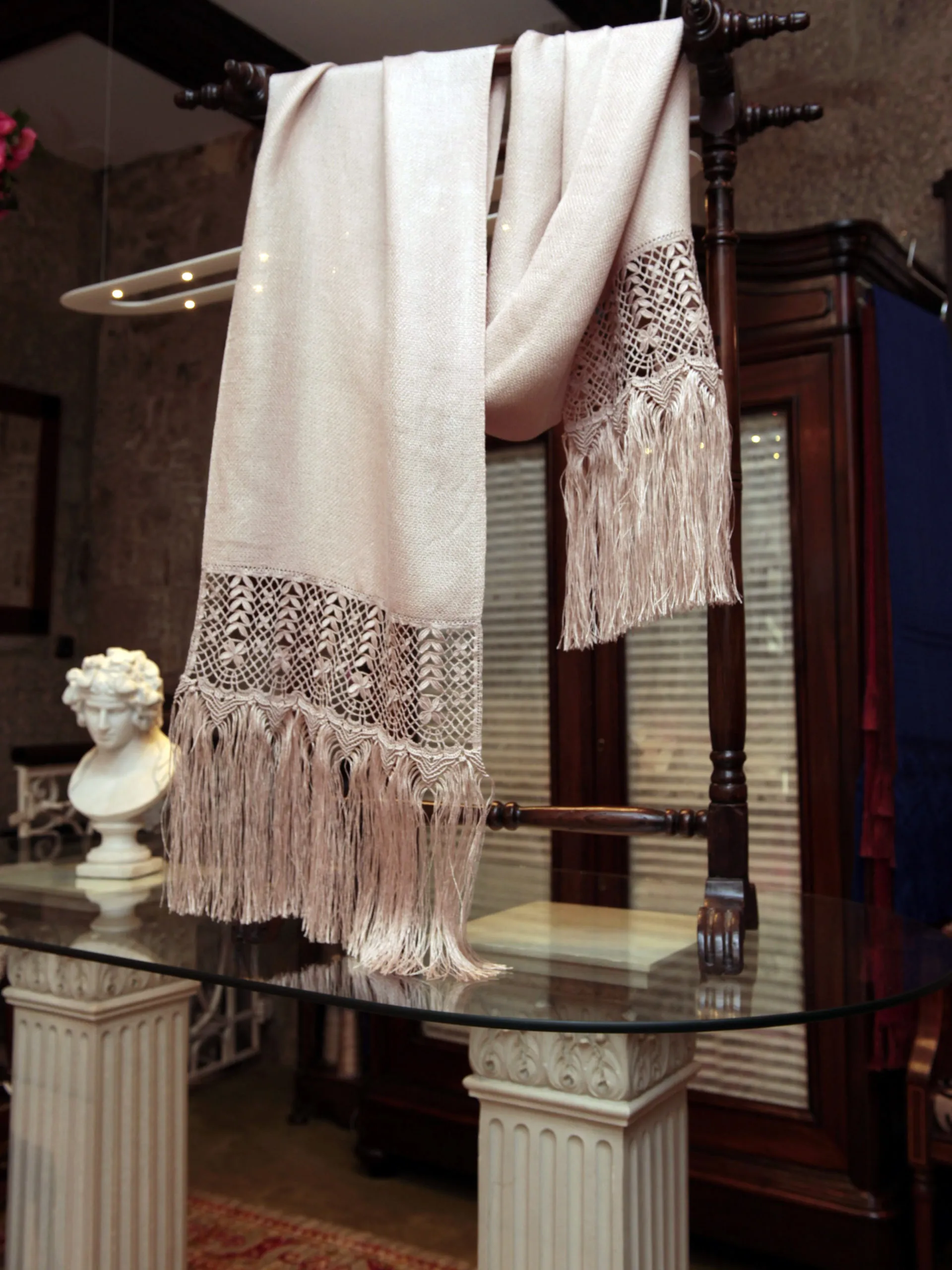 La mezcla de lino y rayón da una elegante y natural caida a este chal totalmente hecho a mano combinando las técnicas de telar, bolillos , encruste y macramé.