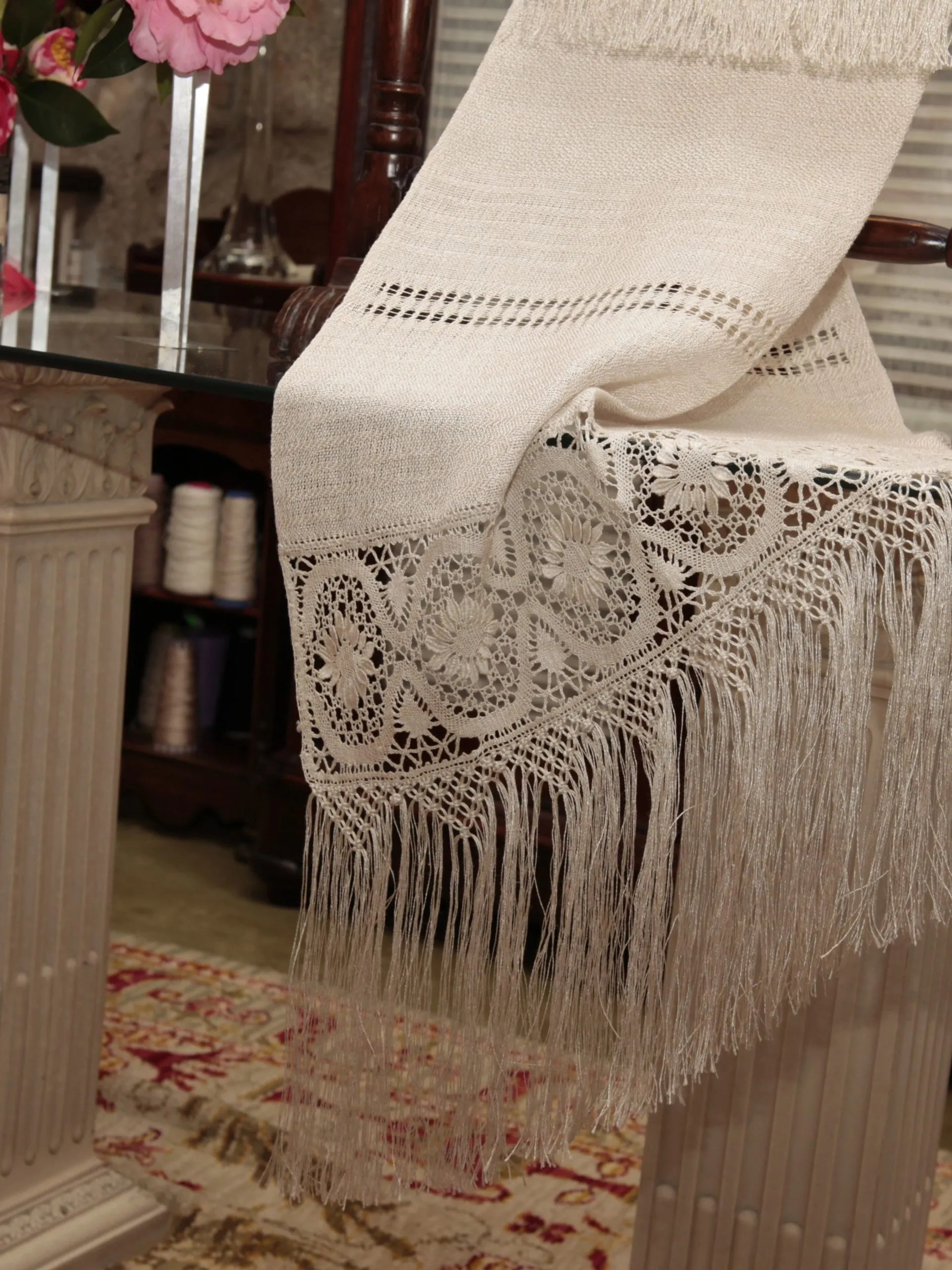 Con las técnicas de telar tradicional, bolillos, macramé y encruste a mano hemos realizado esta espectacular pieza única.