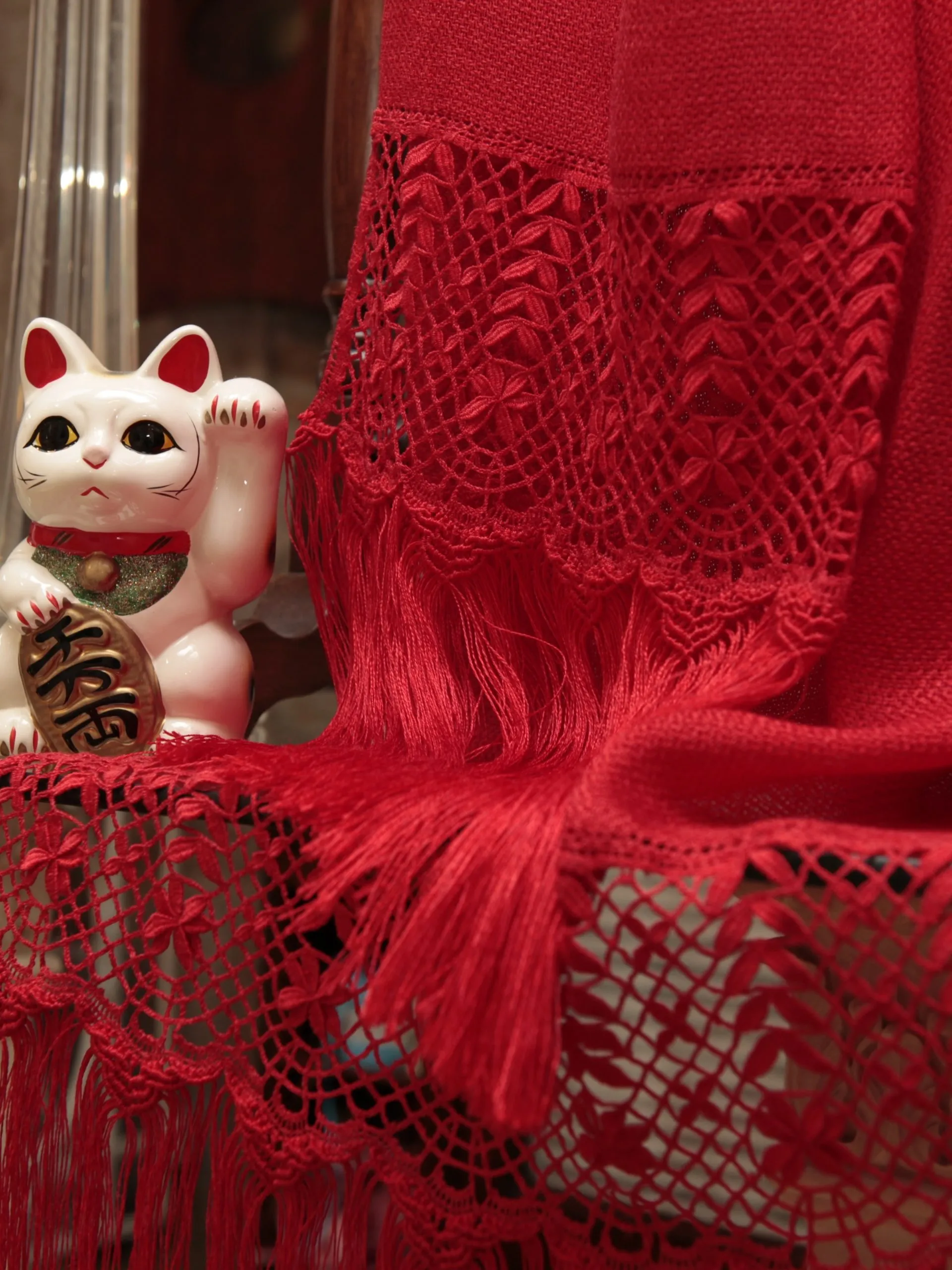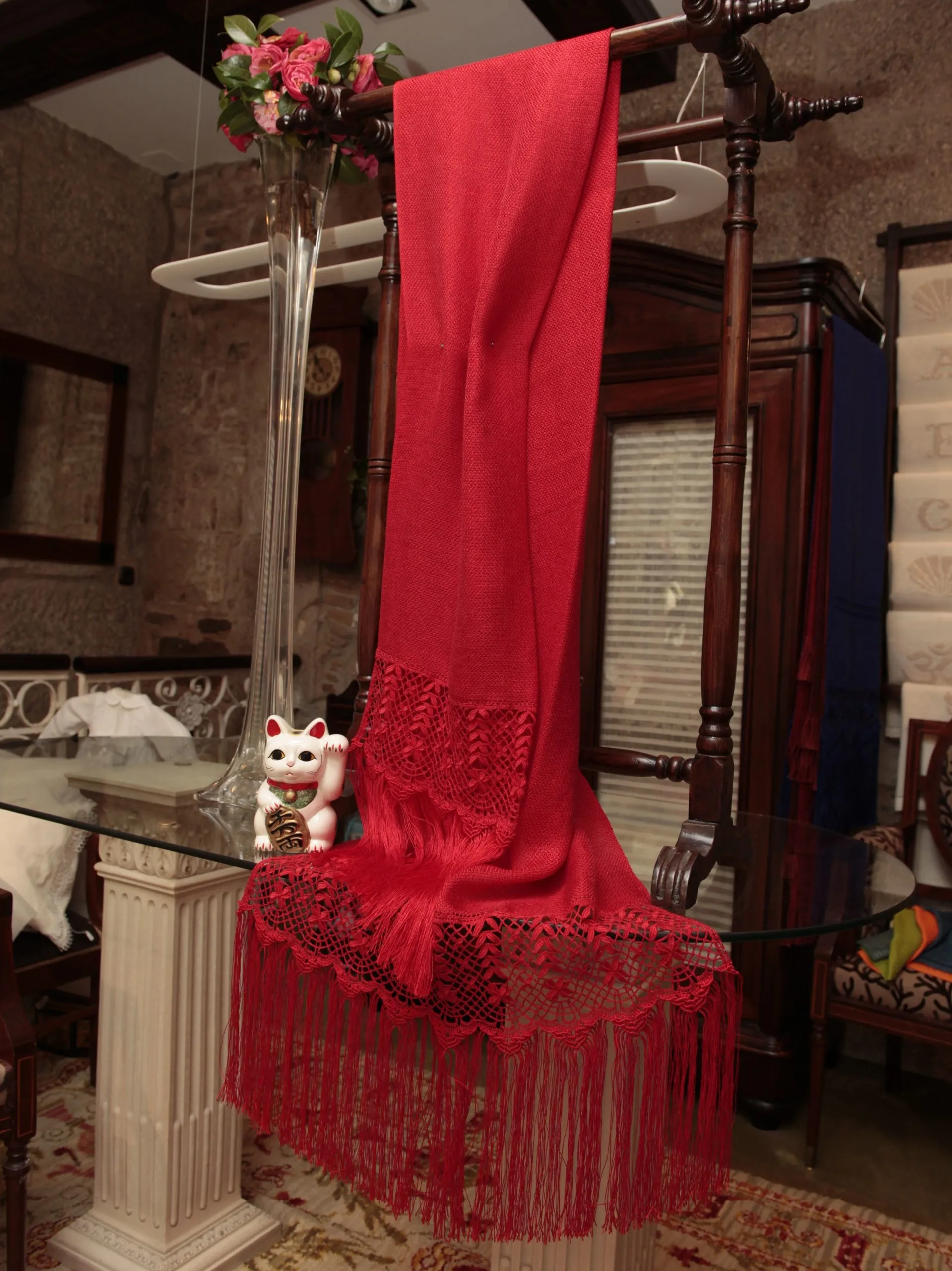 Elaborado artesanalmente en telar tradicional con hilaturas de lino y rayón rematado con encaje de bolillos y macramé.
