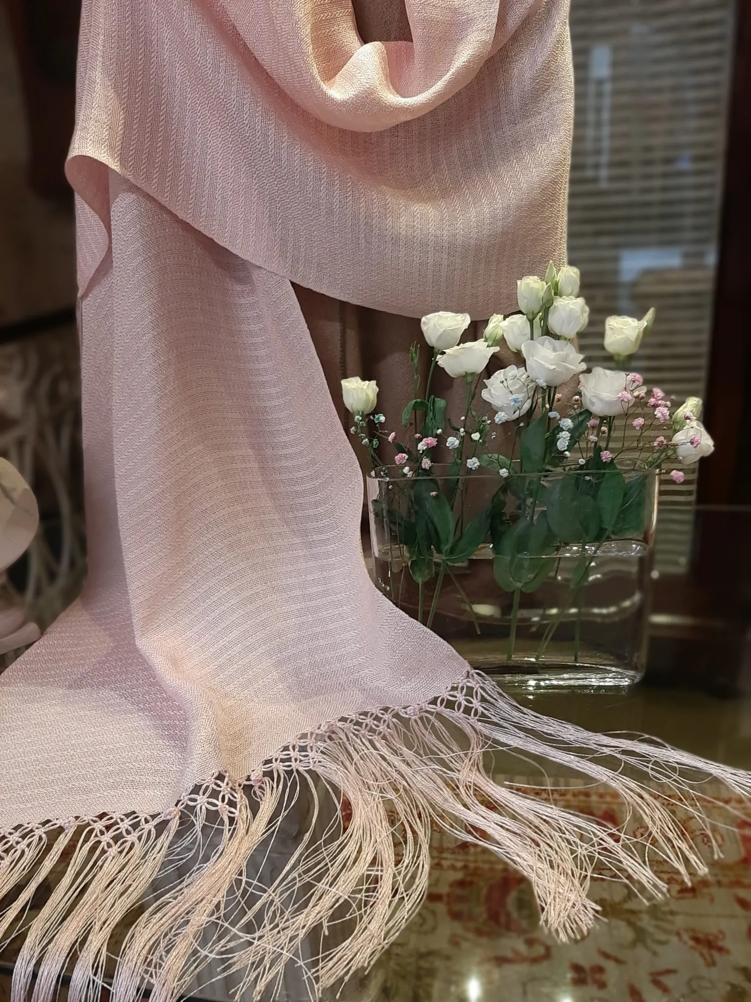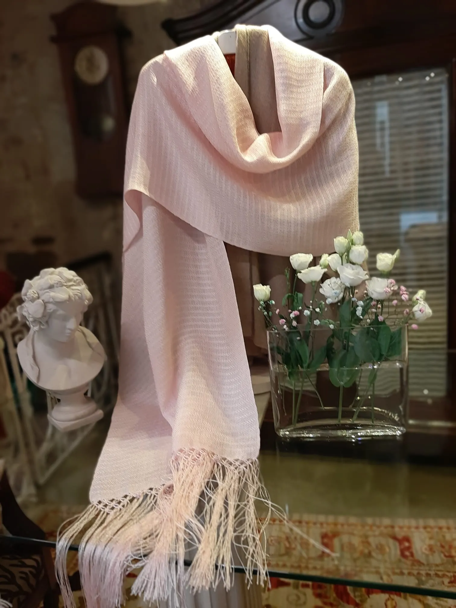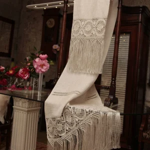 Sé el primero en valorar “Chal de lino y macramé color rosa”