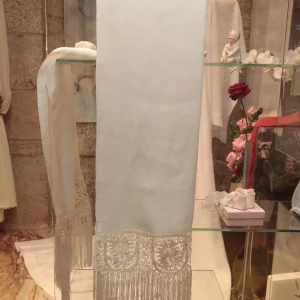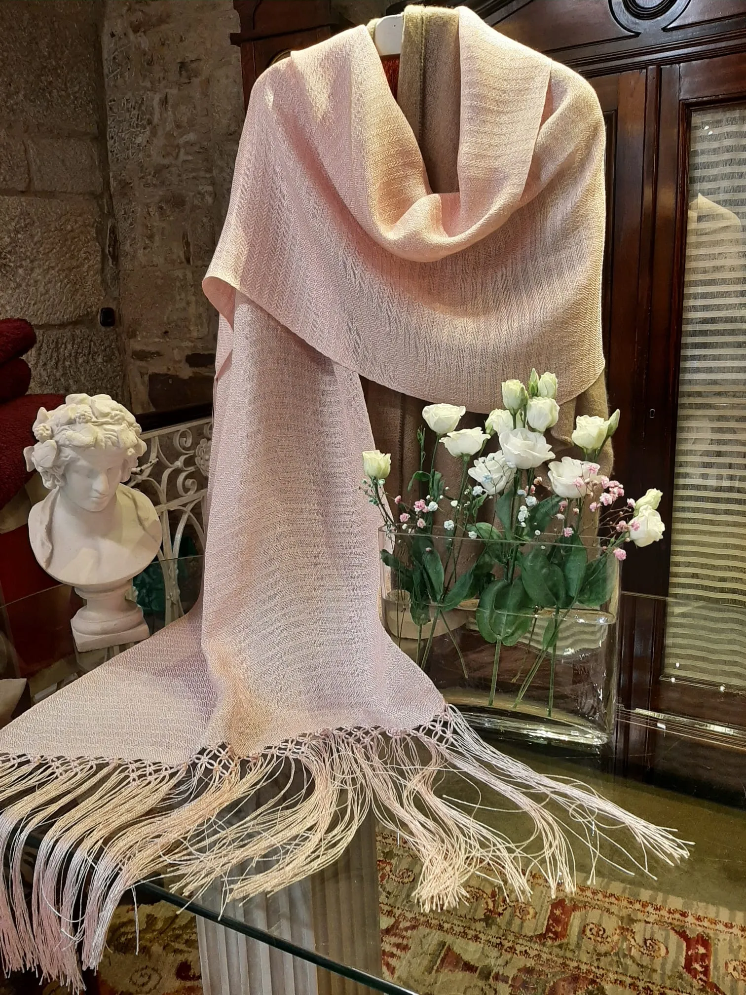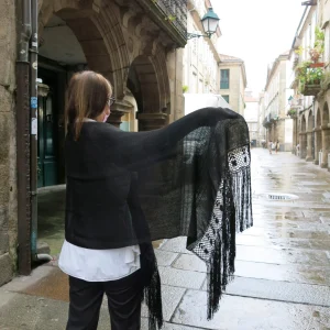 Este chal ha sido tejido a mano en telar tradicional gallego: una técnica tan antigua como compleja con hilaturas de lino y rayón . El resultado es una pieza única, artesanal y exclusiva hecha en Galicia,  de la más alta calidad.