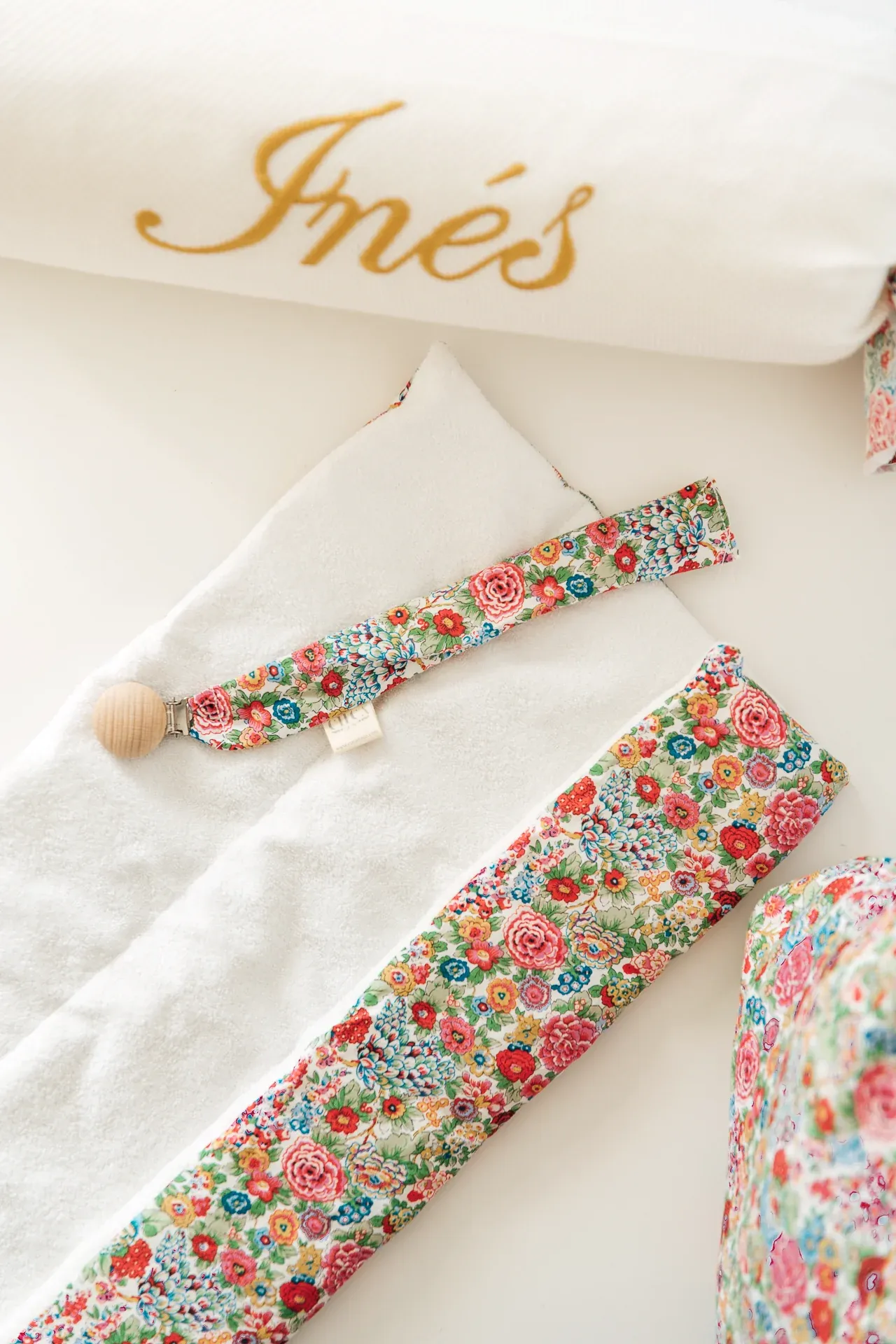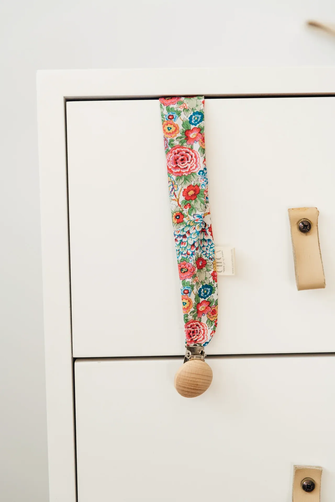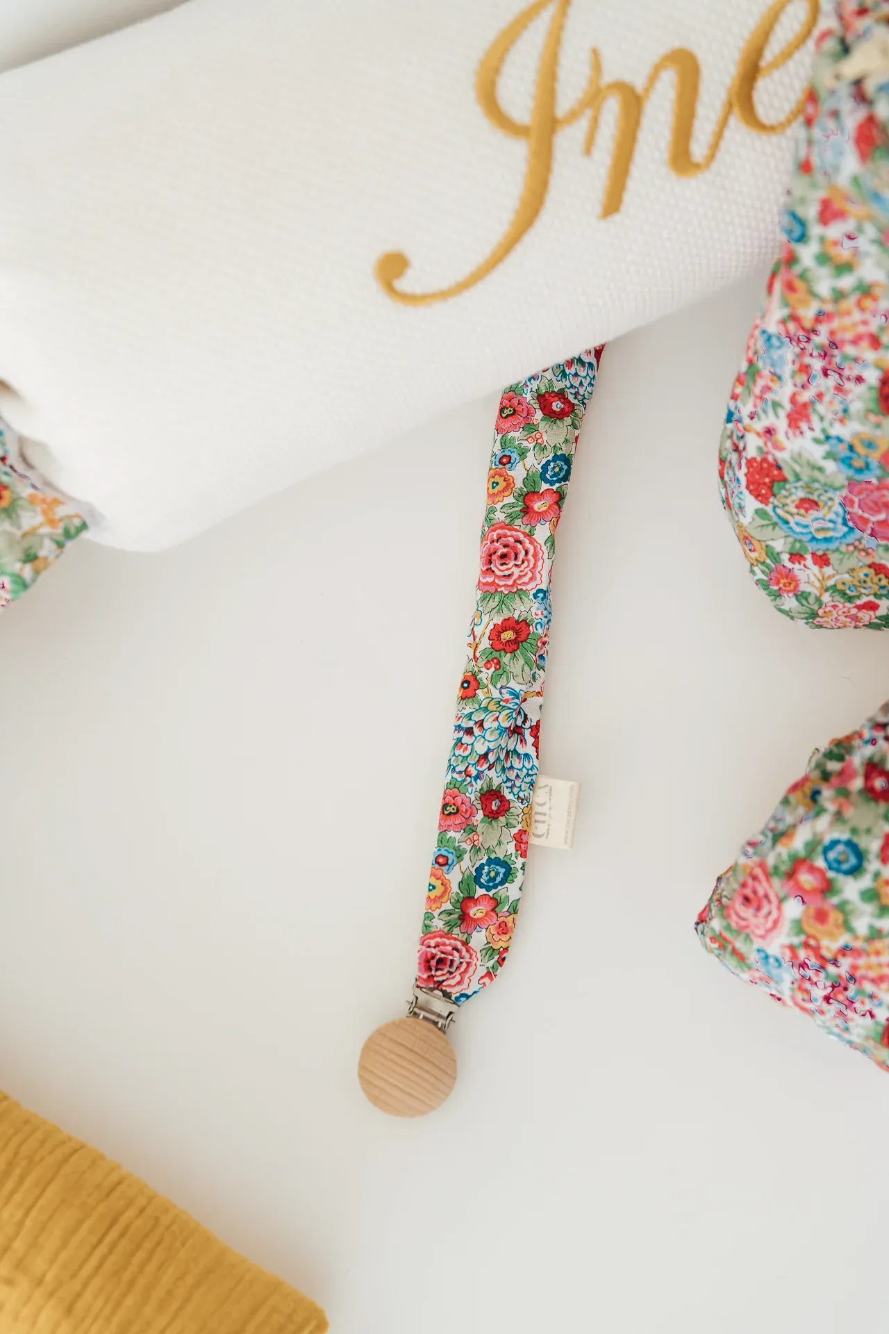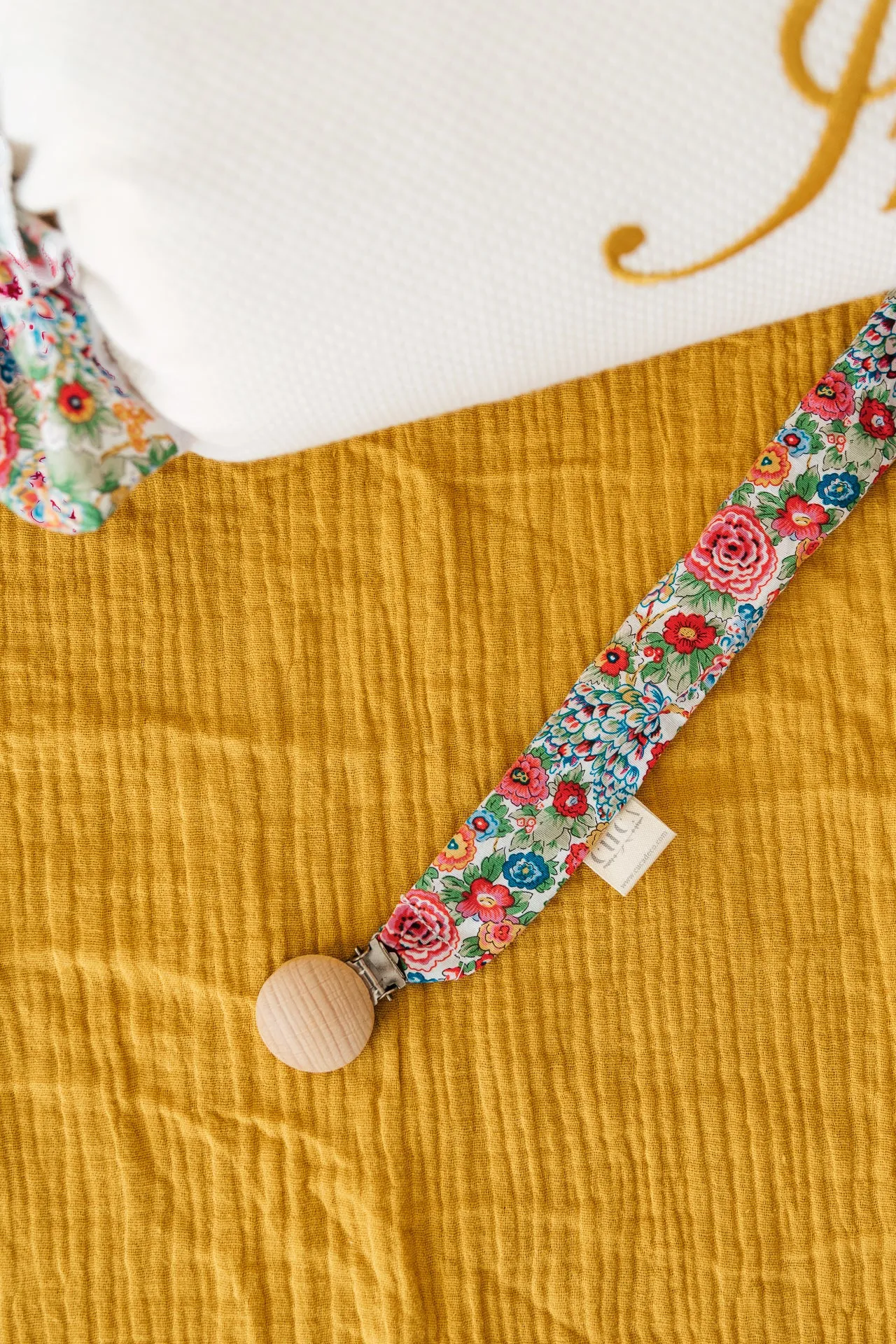 Chupetero de tela, ideal para lavarlo y engancharlo en la ropita gracias a la pinza de madera. Cuélgalo para tenerlo siempre limpio y a mano