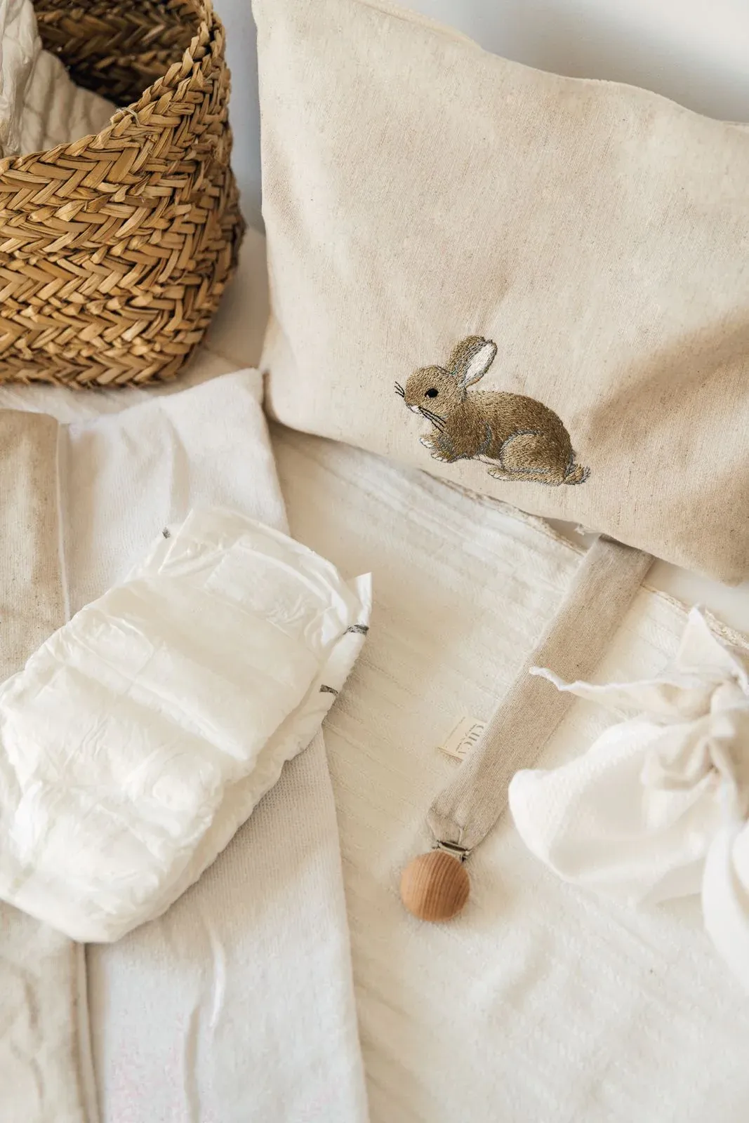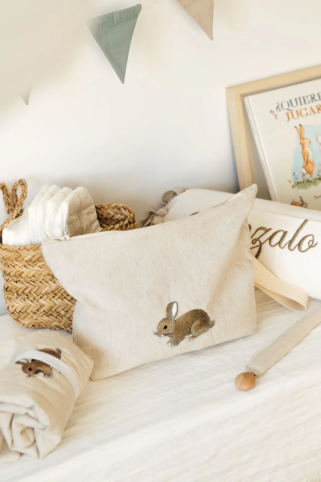 Chupetero de tela, ideal para lavarlo y engancharlo en la ropita gracias a la pinza de madera. Cuélgalo para tenerlo siempre limpio y a mano