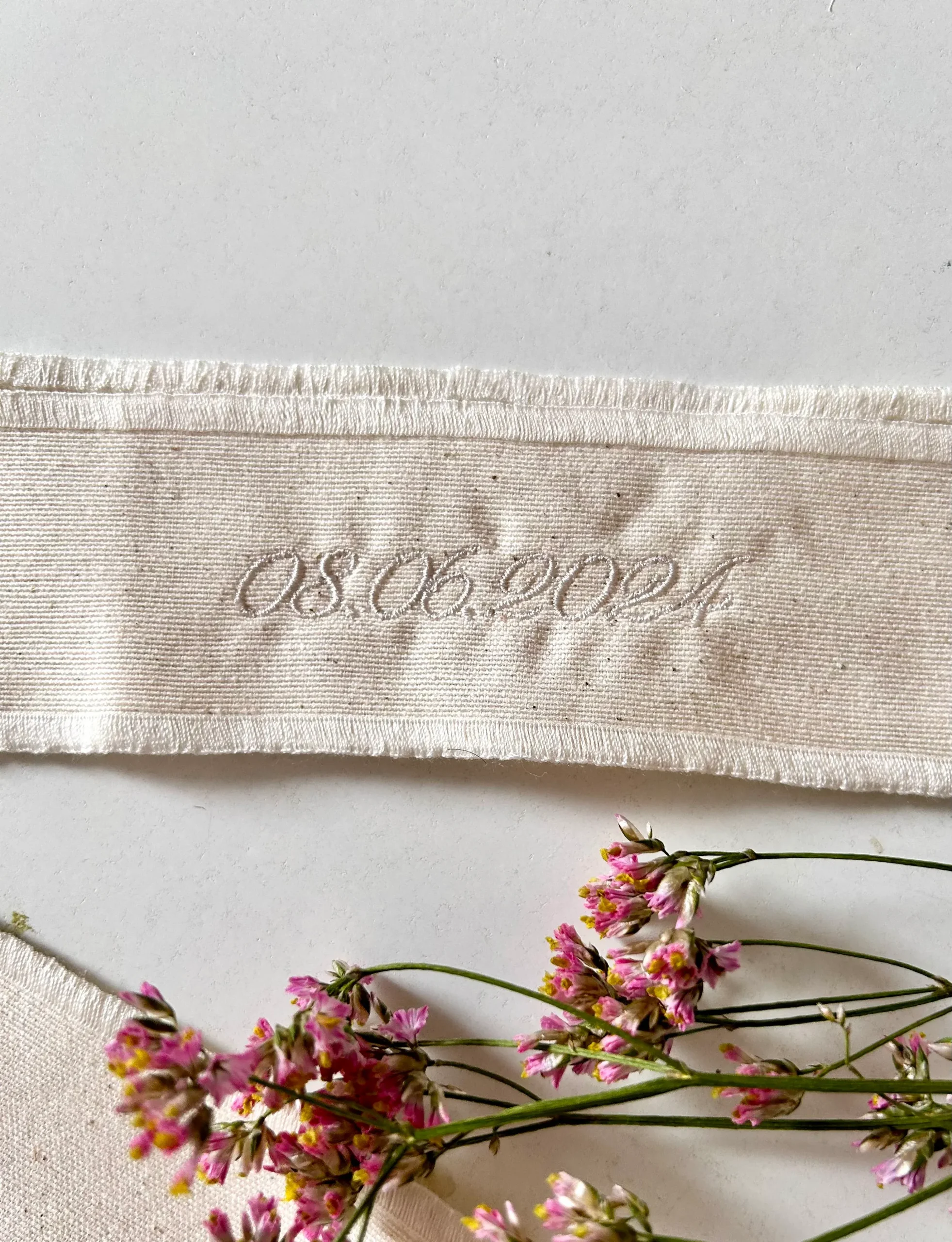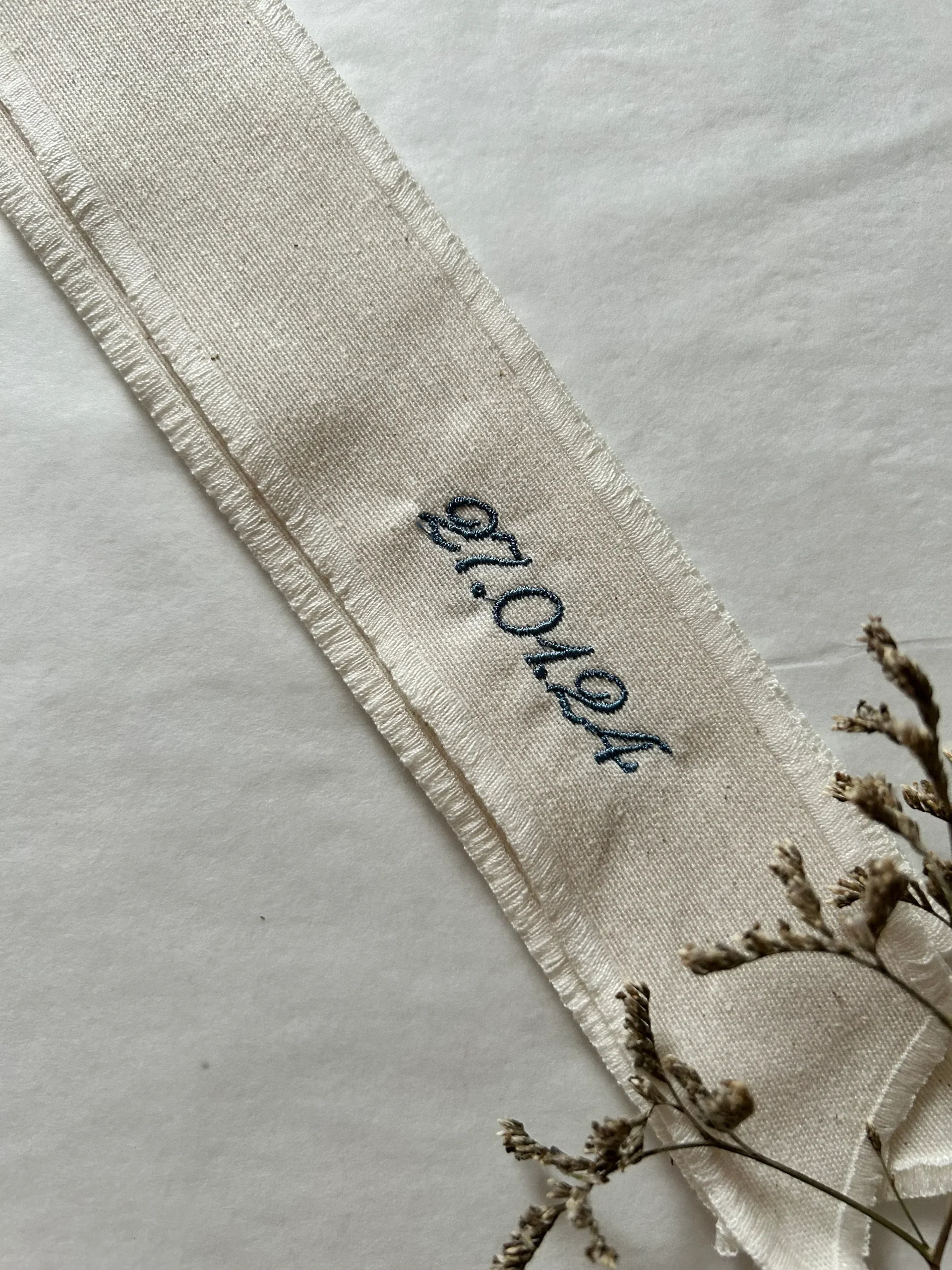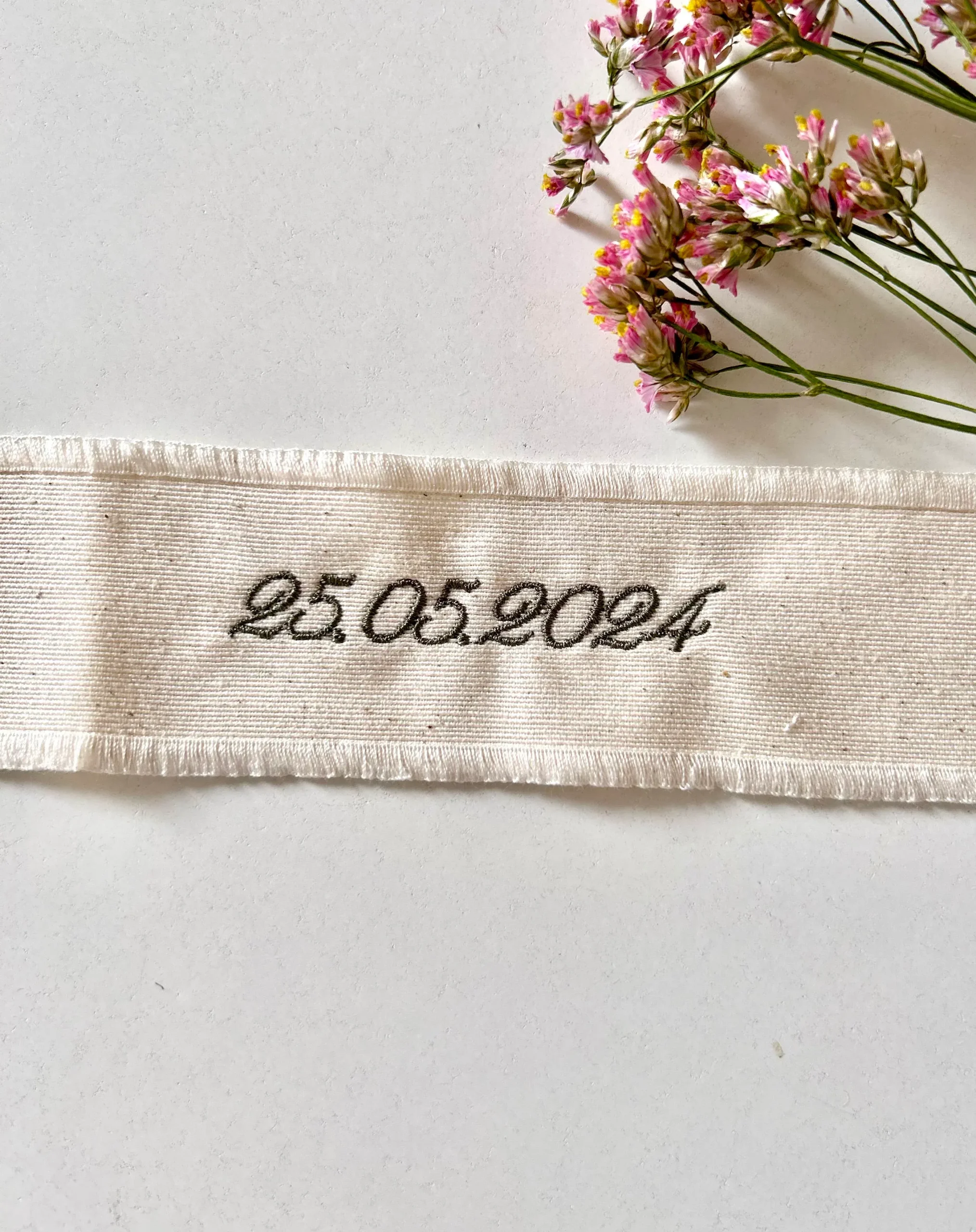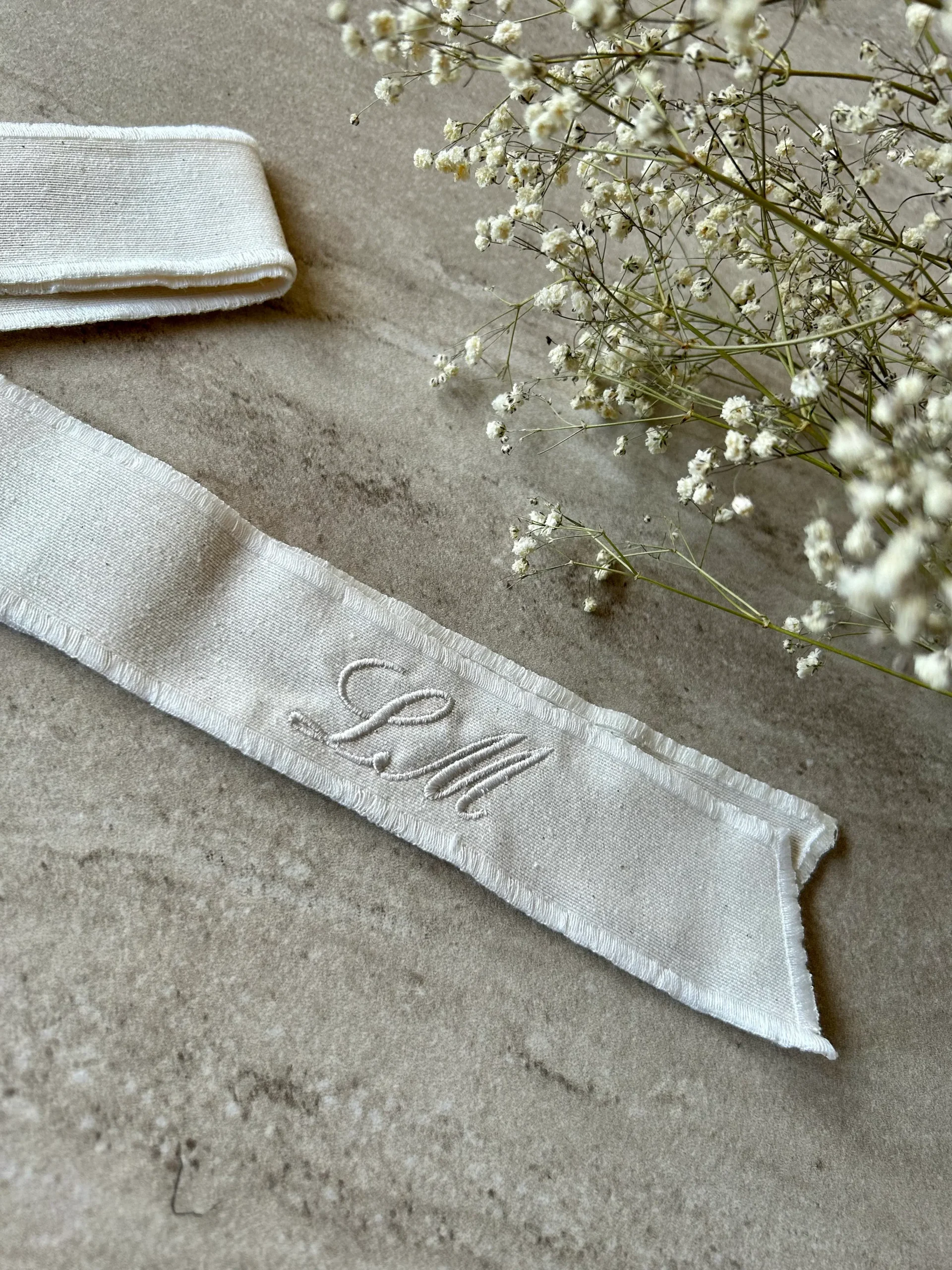 Cinta en algodón color blanco roto con festón. Perfecta para acompañar el ramo que elijas, tan auténtico como tú. Elige el color de la cinta, y la personalización. El bordado irá por defecto en UNO de los extremos.