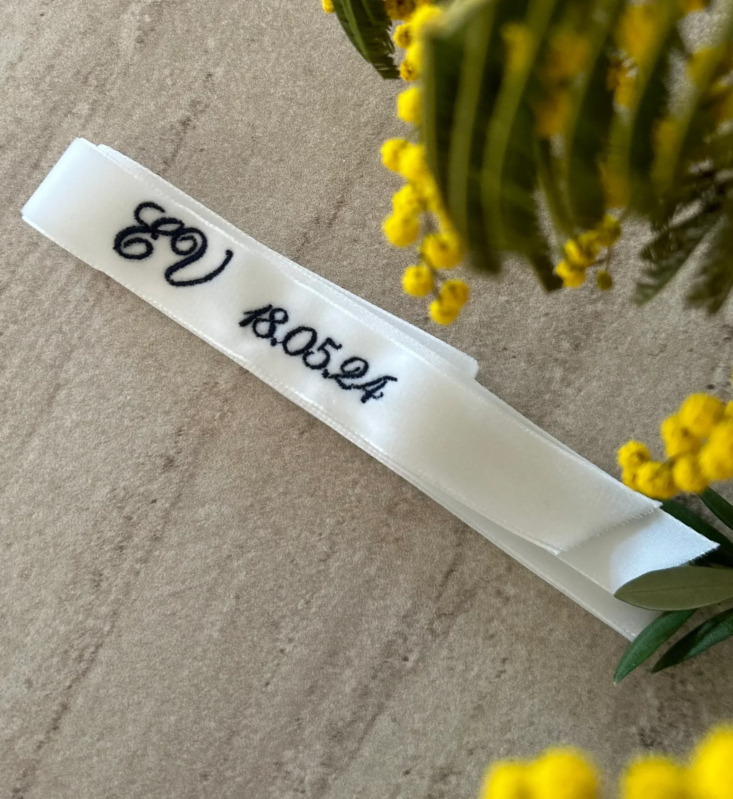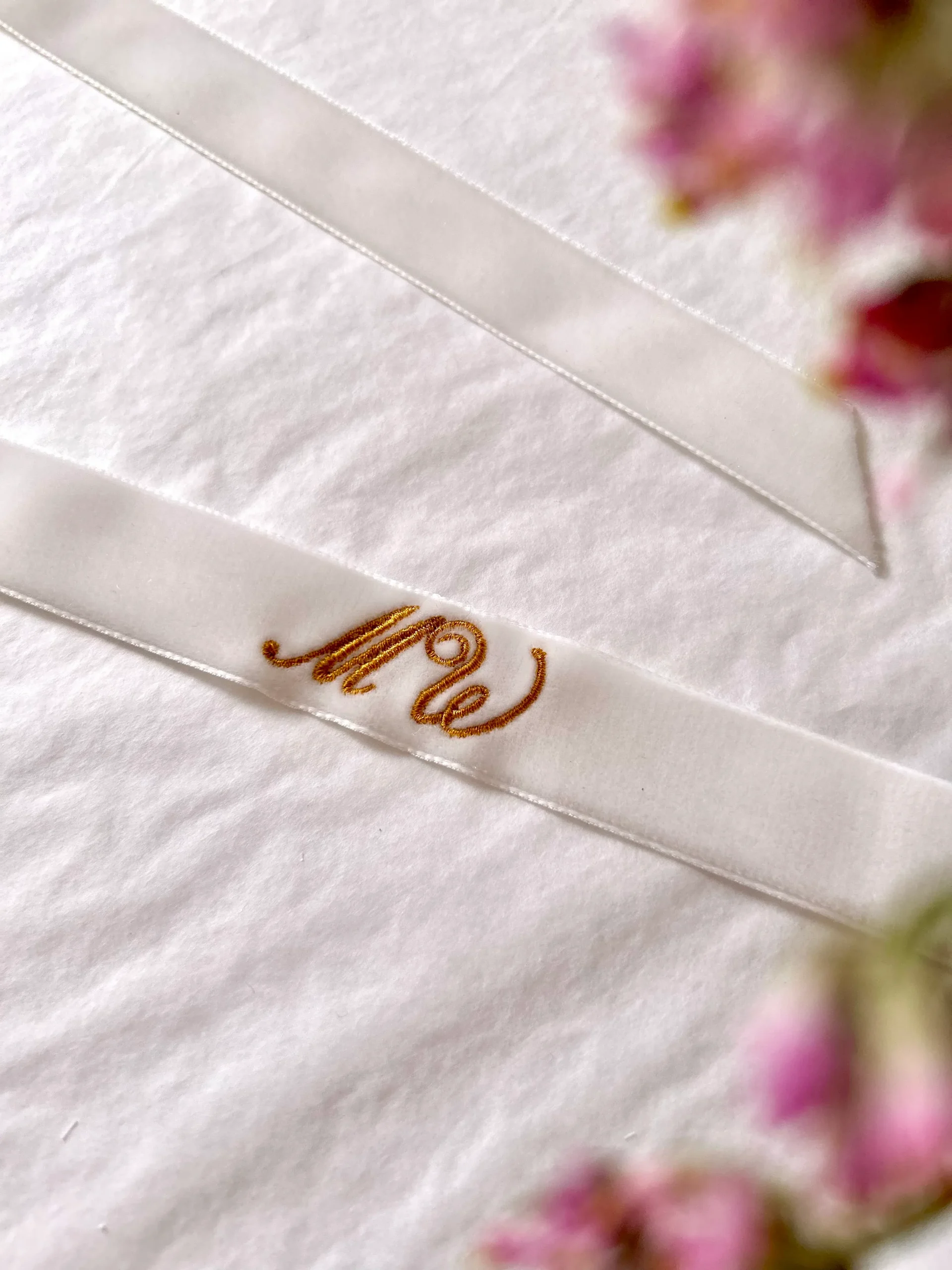 Cinta en terciopelo color blanco con boreado de color. Perfecta para acompañar el ramo que elijas, tan auténtico como tú. El bordado irá por defecto en UNO de los extremos.