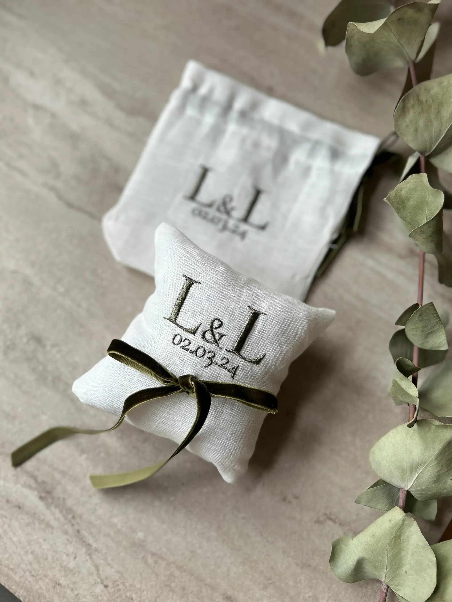 Cojín Porta-Alianzas confeccionado en lino 100%. Con bordado a elegir y lazada en terciopelo.