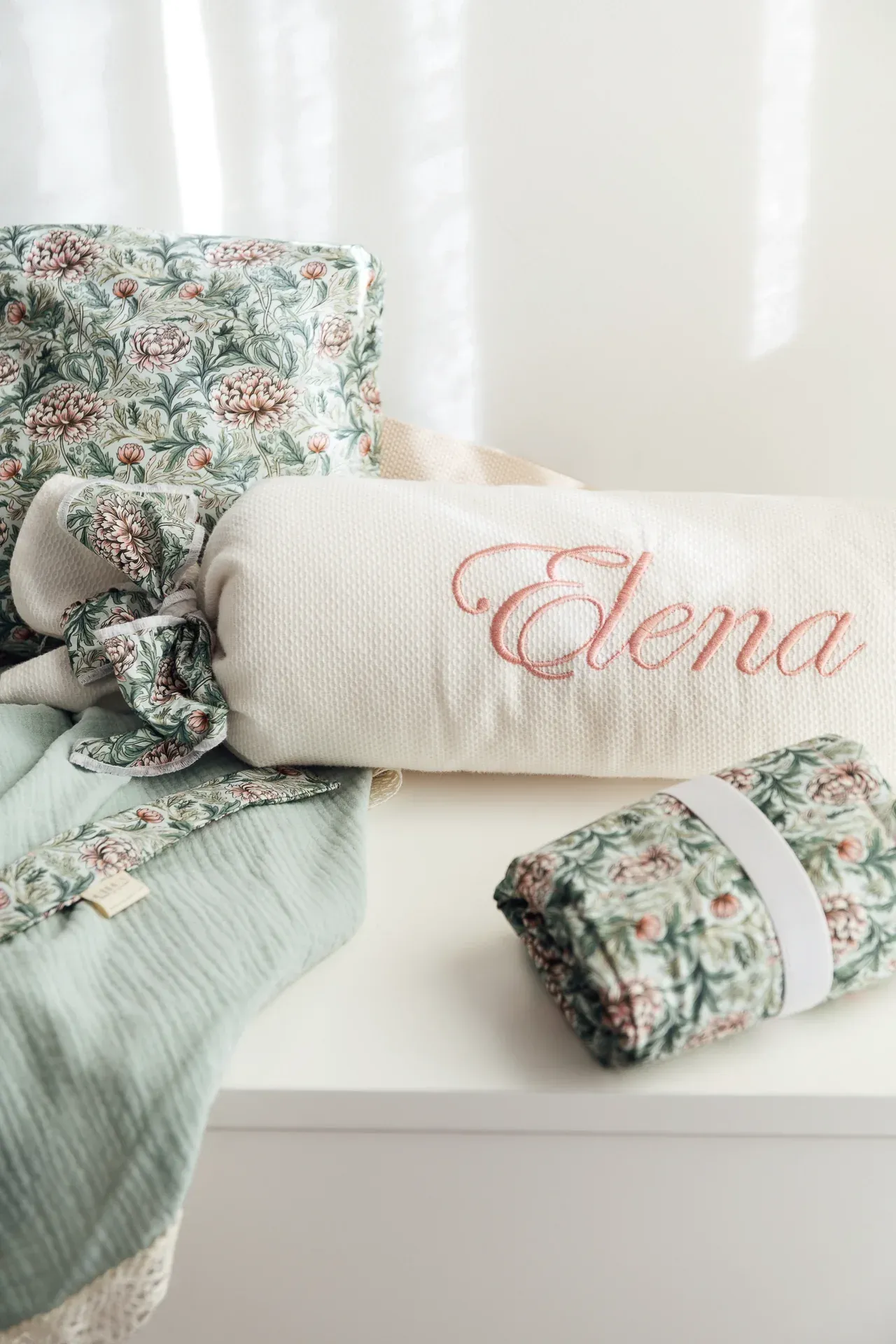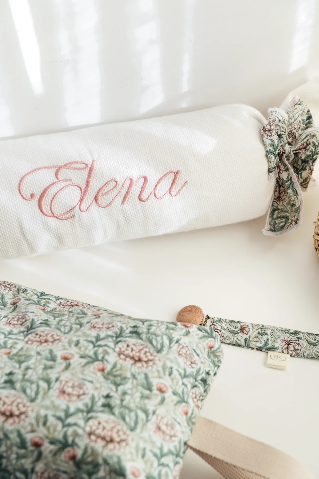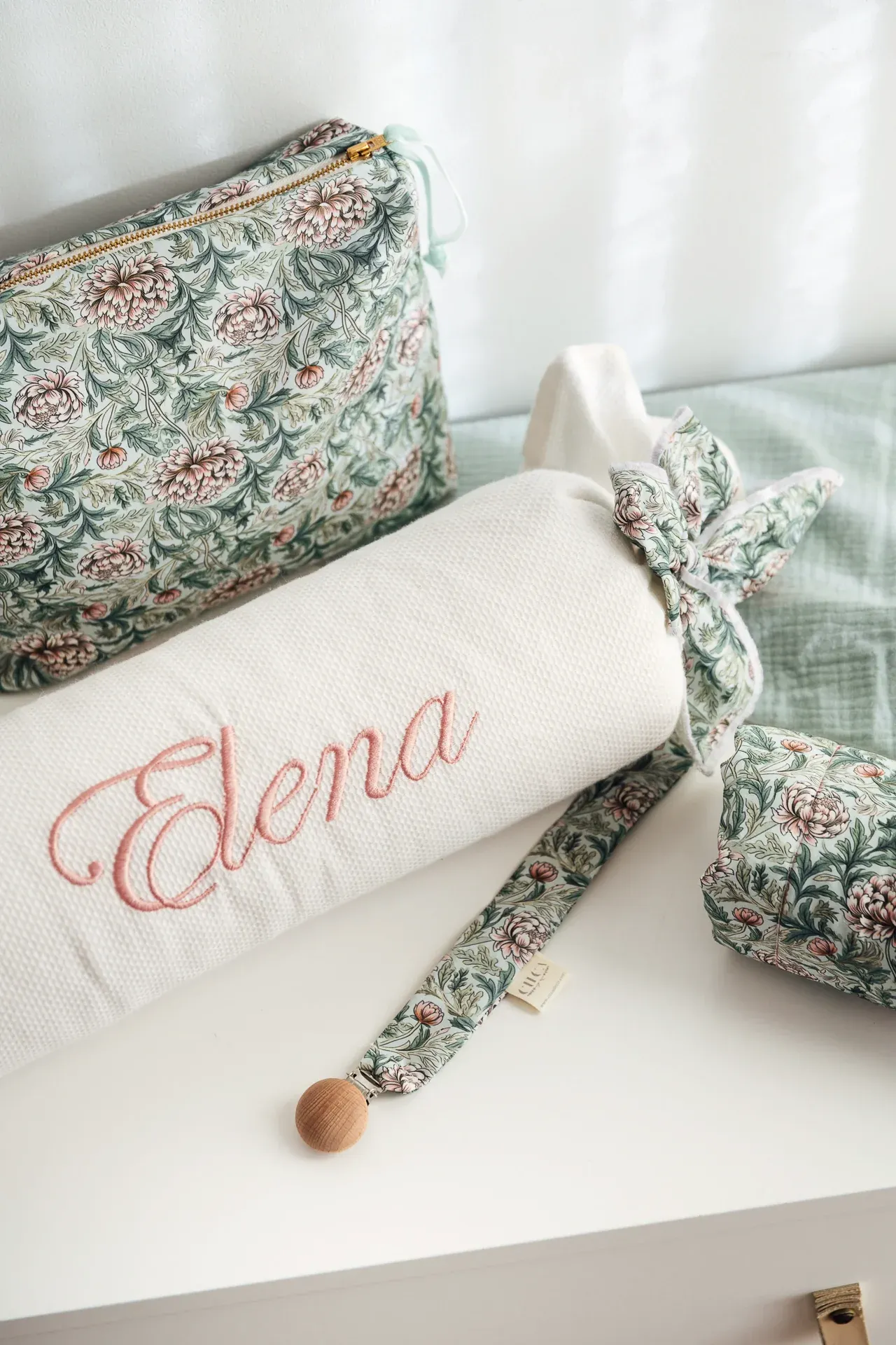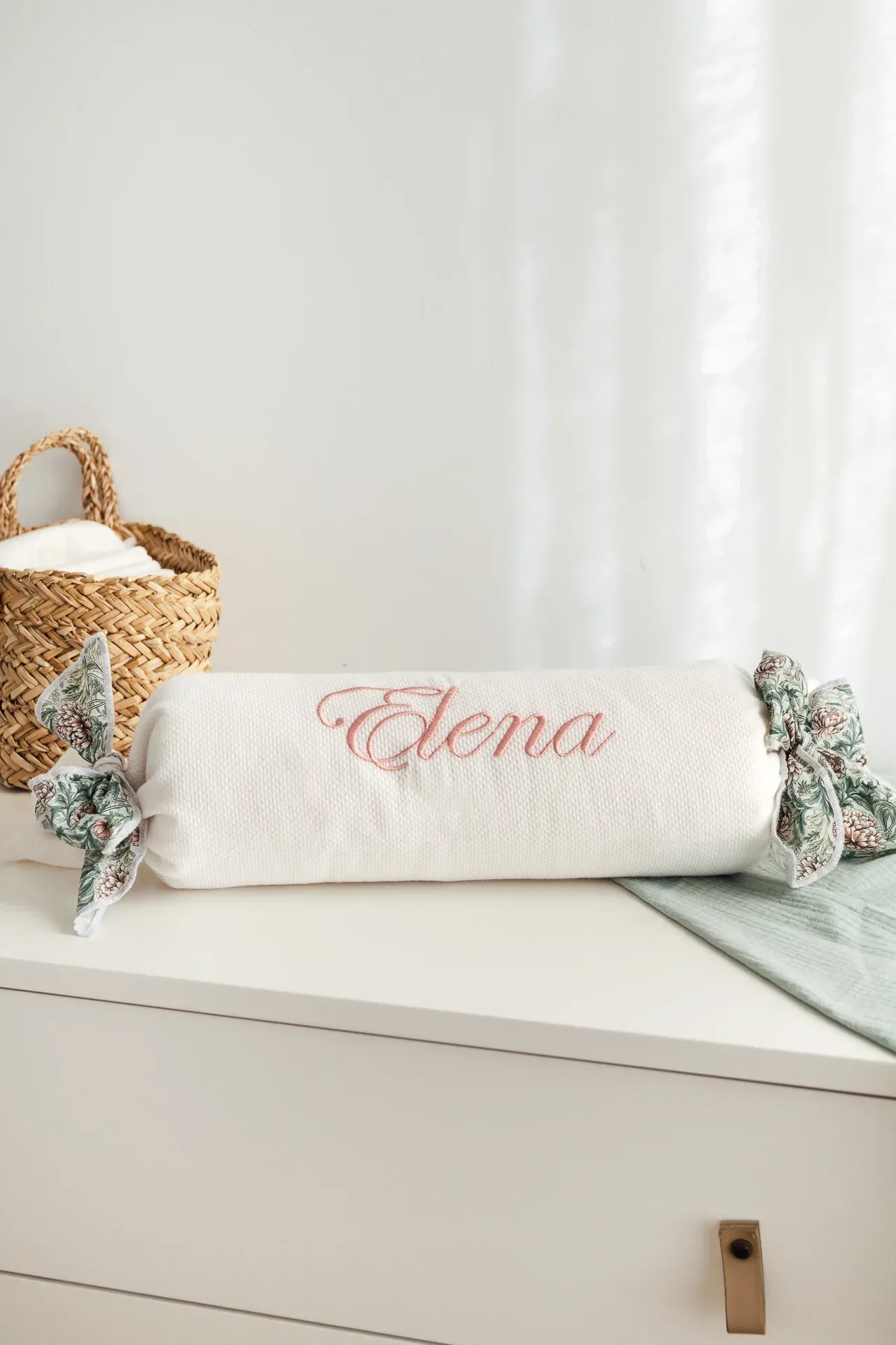 Este cojín está pensado para personalizar el dormitorio de tu bebé. En los primeros meses de vida será un apoyo para evitar que se gire bruscamente. Más adelante podrás ponerlo en su cama. Tanto la funda que recubre el cojín como los lazos son lavables.