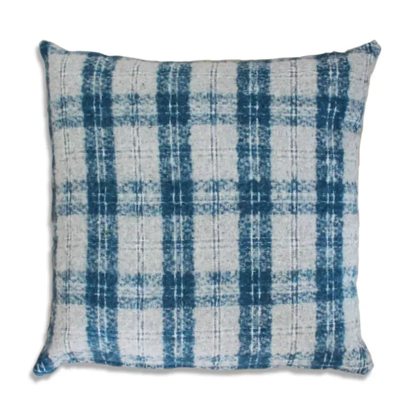 Cojín cuadros azul, de tela jacquard algodón y lana 100%, colores gris y azul. Lavar en frío a máquina o a mano.