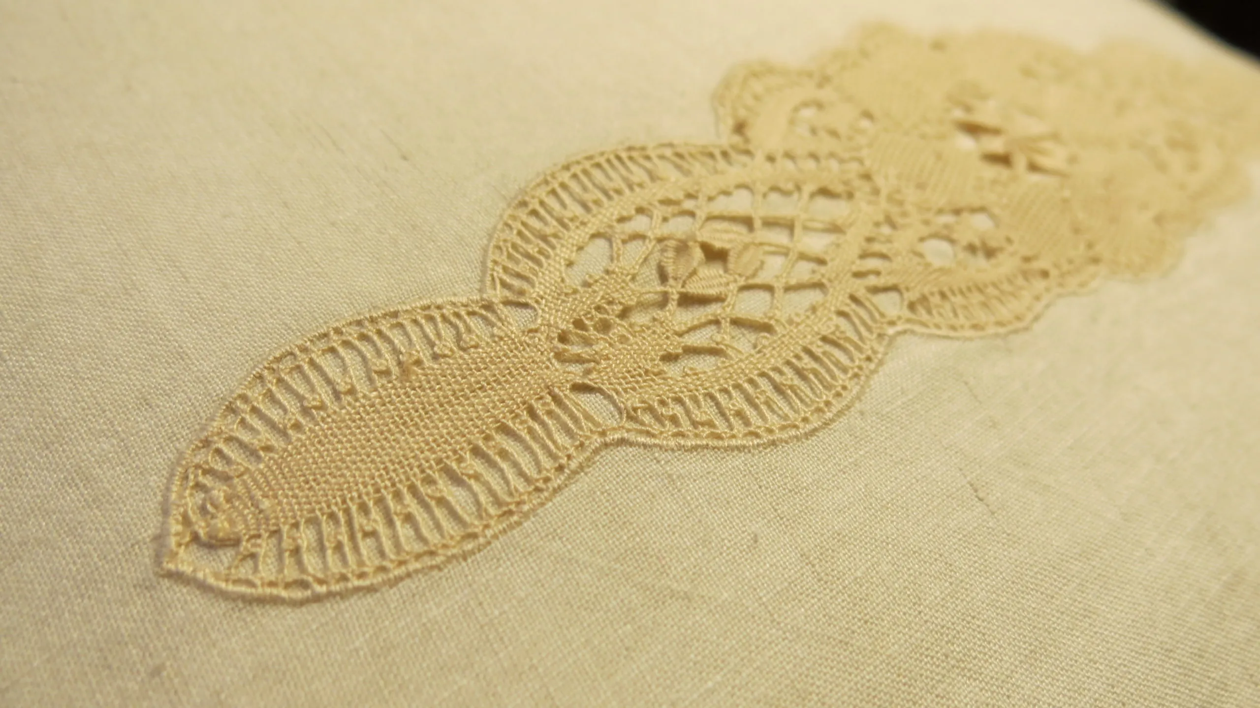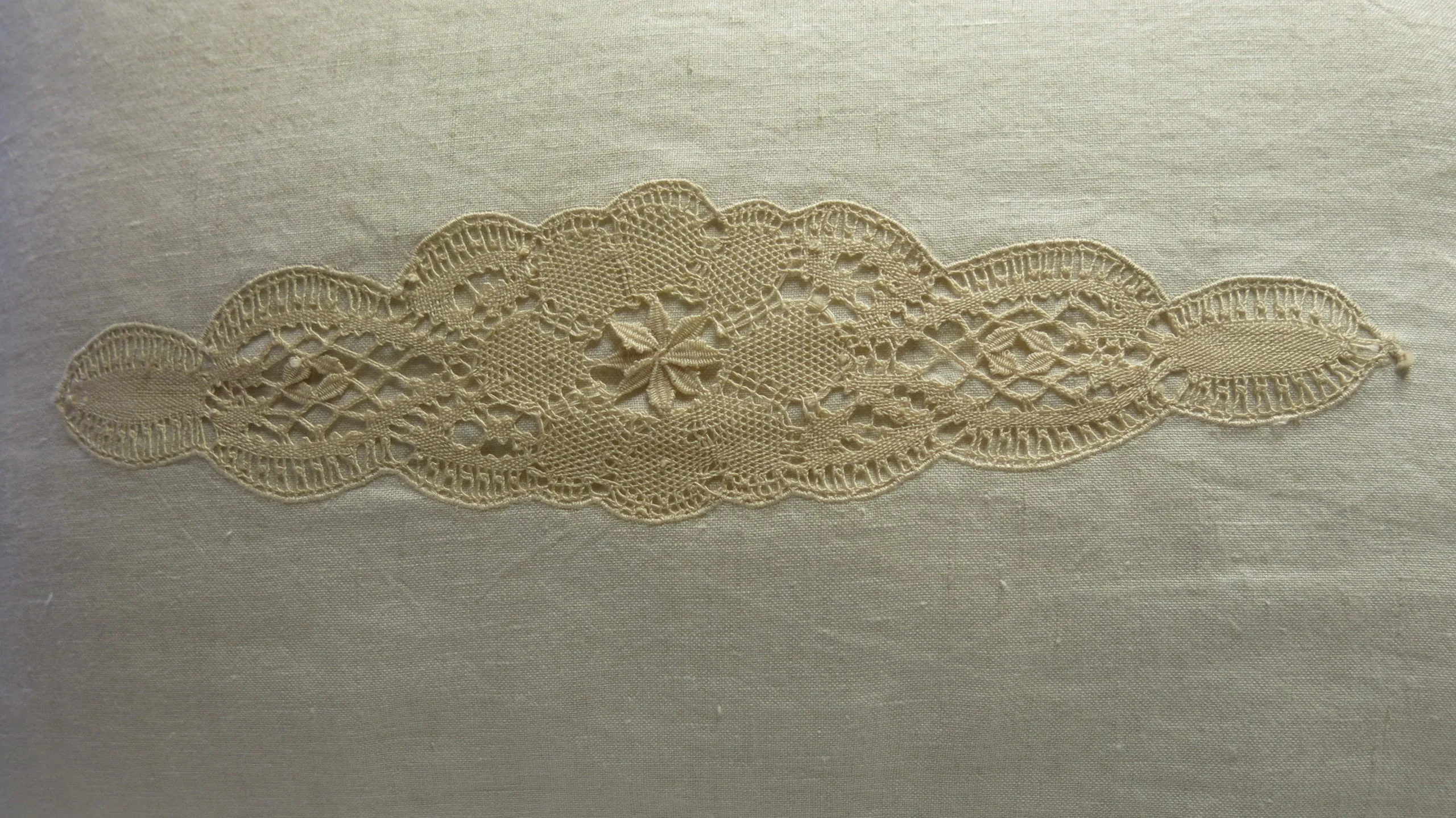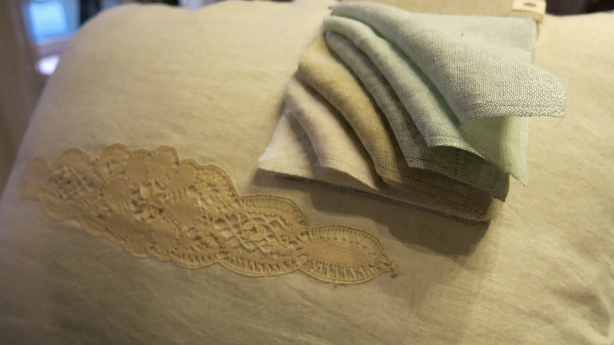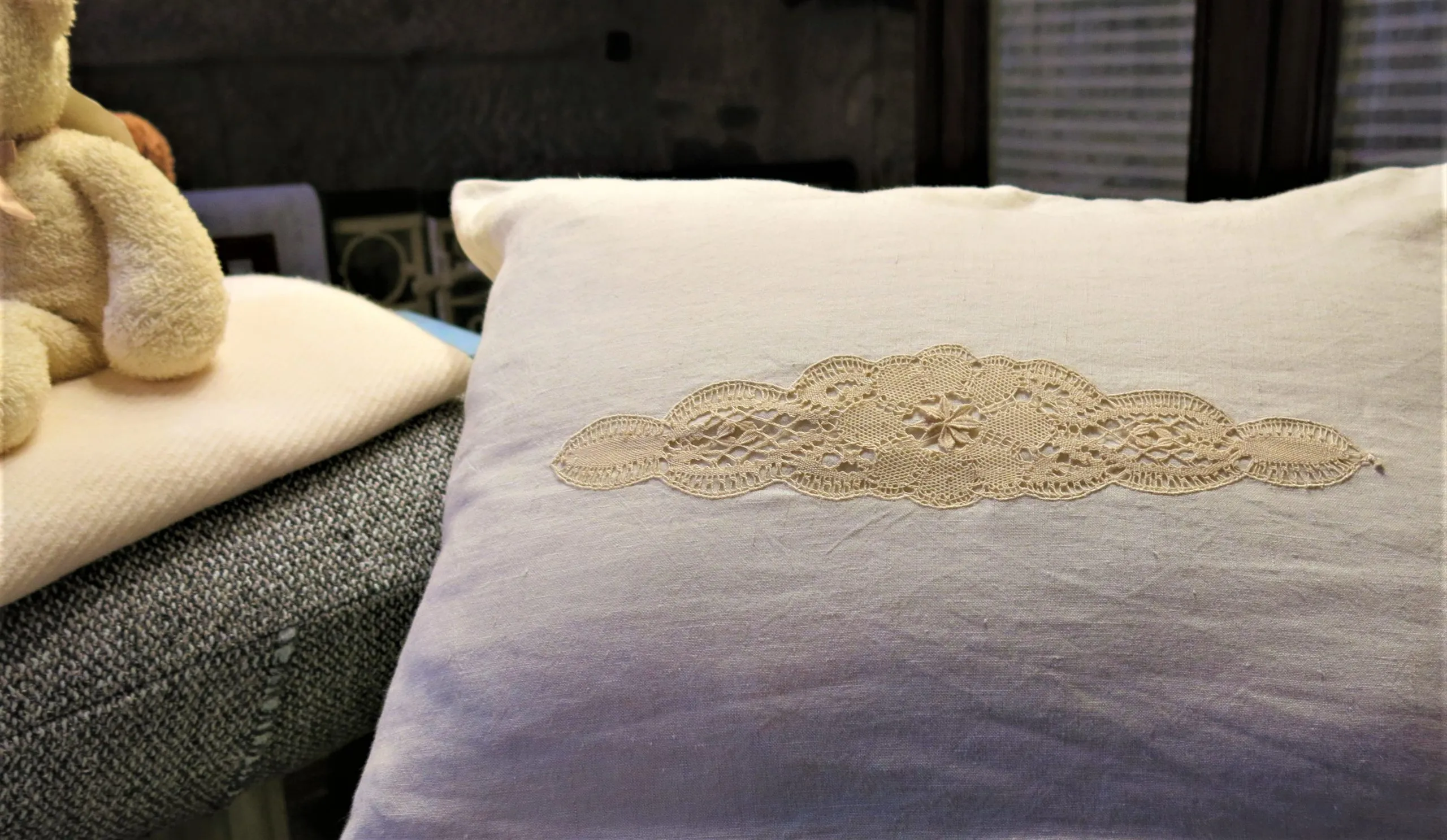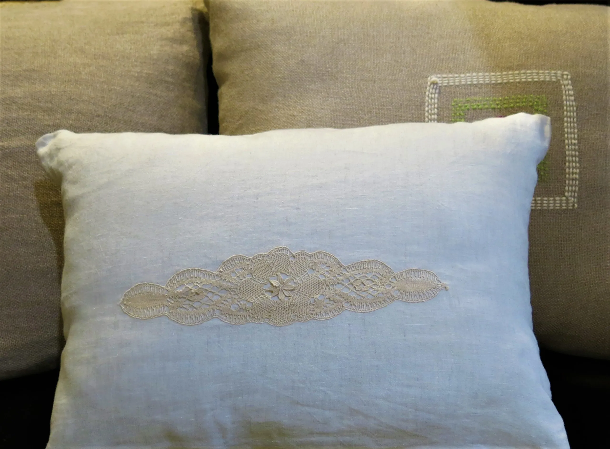 Para esta pieza hemos elegido un lino levemente arrugado para evitar planchado. La gama de colores naturales aporta calidez y se mimetiza con facilidad. La aplicación central es de encaje de bolillos hecha a mano.